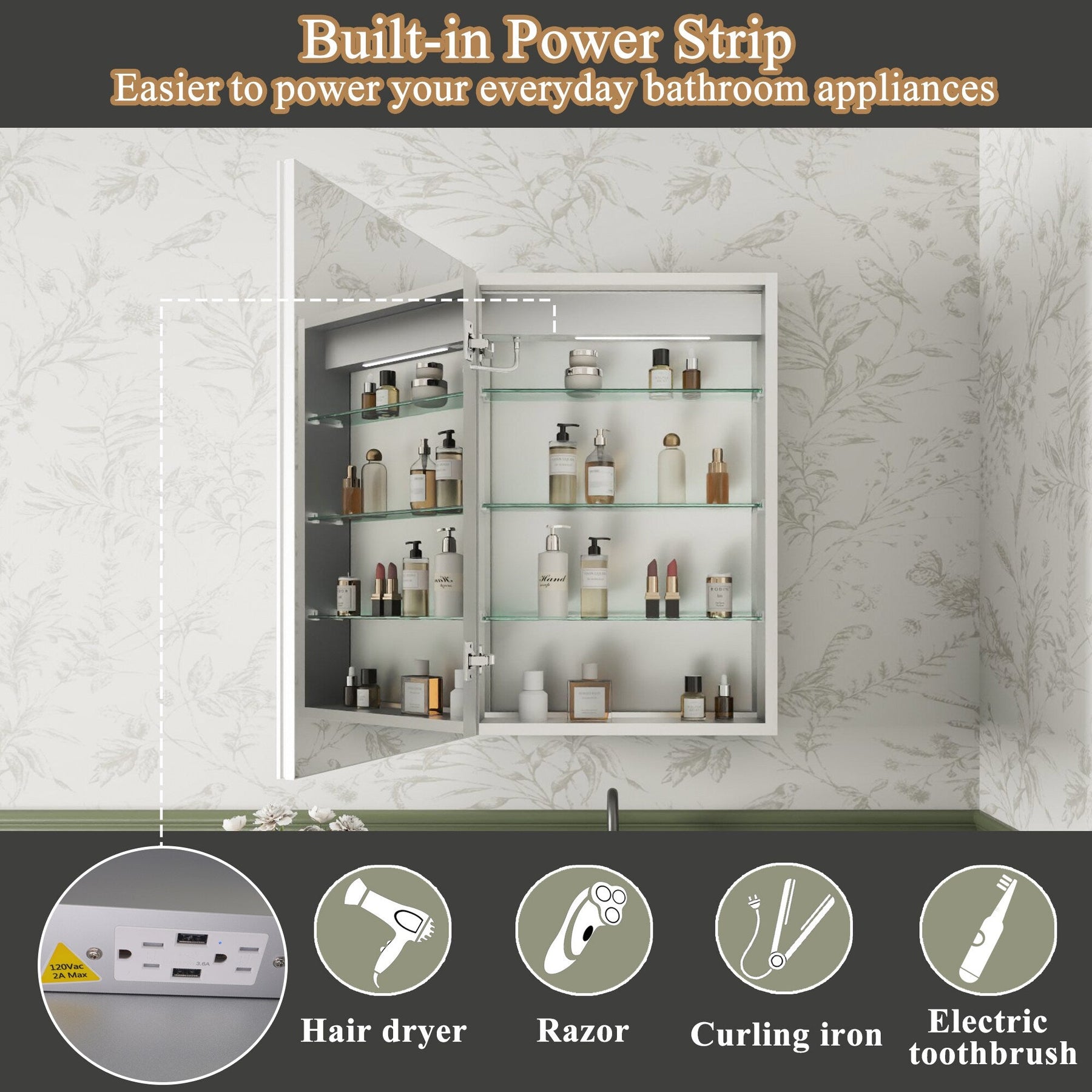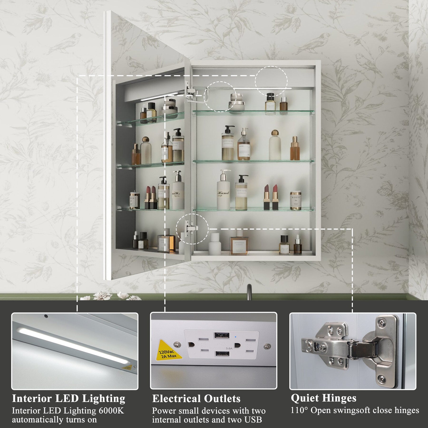 ExBrite Luvia 20-in x 30-in Lighted LED Fog Free Surface/Recessed Mount Silver Mirrored Soft Close Medicine Cabinet with Outlet
