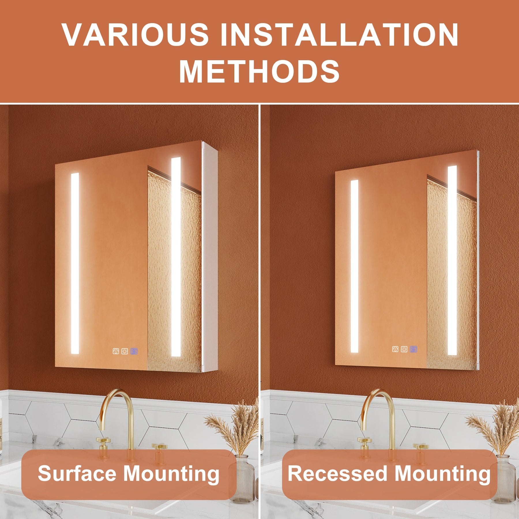 A: The cabinet can be surface-mounted or recessed with the included Z-bar mounting hardware. Professional installation is recommended for the hard-wired electrical setup.