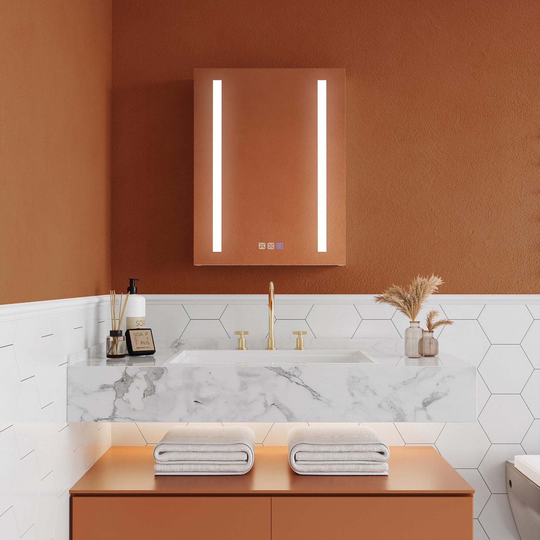 The ExBrite Opale Lighted LED Fog-Free Medicine Cabinet offers a sleek, modern design with a frameless mirror door and integrated LED lighting perfect for any bathroom. This cabinet provides both surface and recessed mounting options, ensuring versatility for various bathroom layouts. Notable for its advanced defogging technology and built-in electrical outlets, this cabinet elevates everyday routines with ease and style.