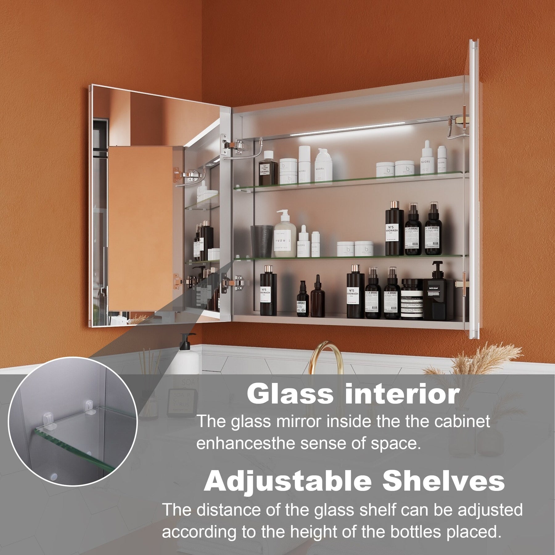 Elevate your bathroom with the ExBrite Opale LED Medicine Cabinet, featuring a sleek aluminum frame with a fog-free, double-sided mirrored door. Easily choose your perfect light setting with its integrated, dimmable LED technology and enjoy seamless storage with adjustable glass shelves.