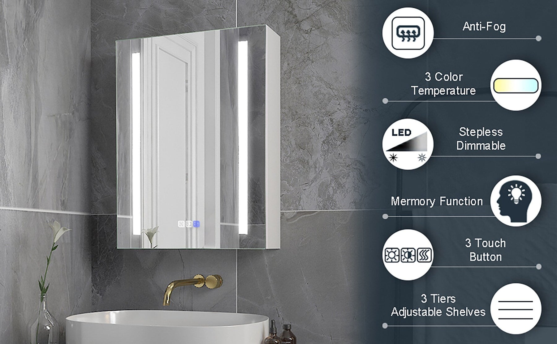 Experience luxury and functionality with the Forclover LED Medicine Cabinet. This 20x26 inch mirrored cabinet features advanced fog-free technology and customizable LED lighting to enhance your bathroom experience. Equipped with built-in outlets and adjustable glass shelves, it’s designed for the modern home.