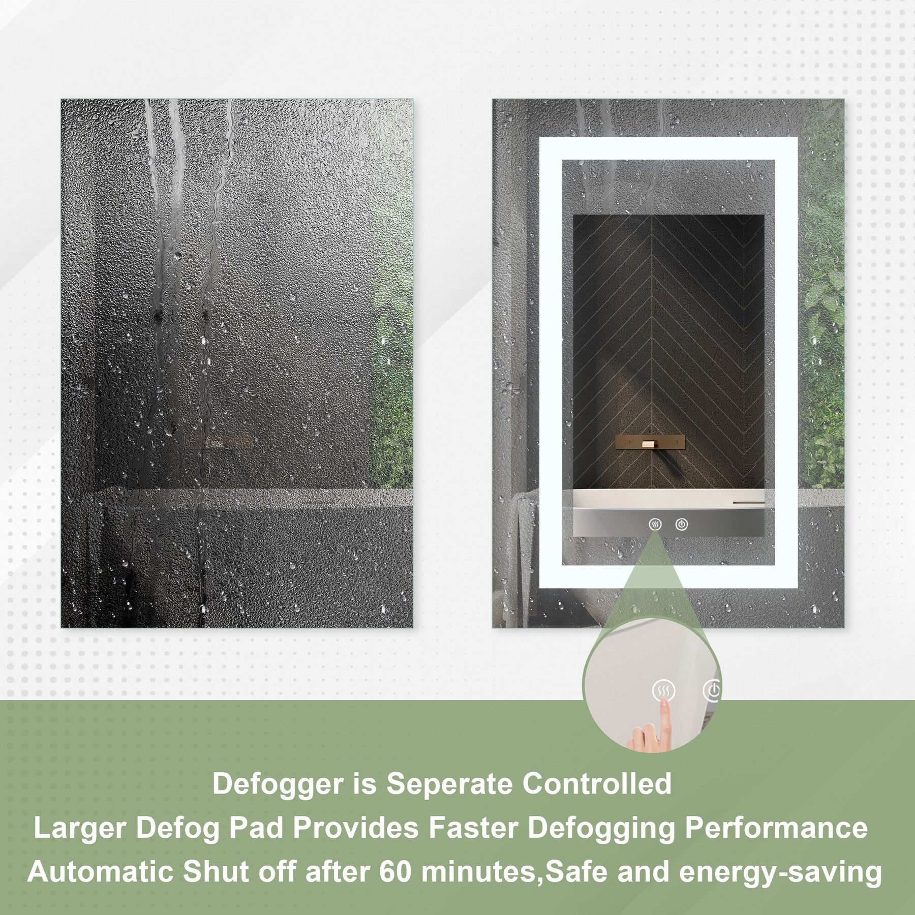 A: The cabinet is equipped with large anti-fog mats that activate at the touch of a button and automatically turn off after 60 minutes.