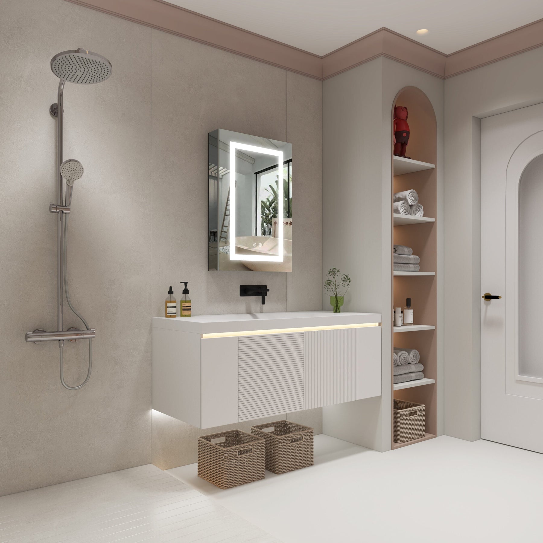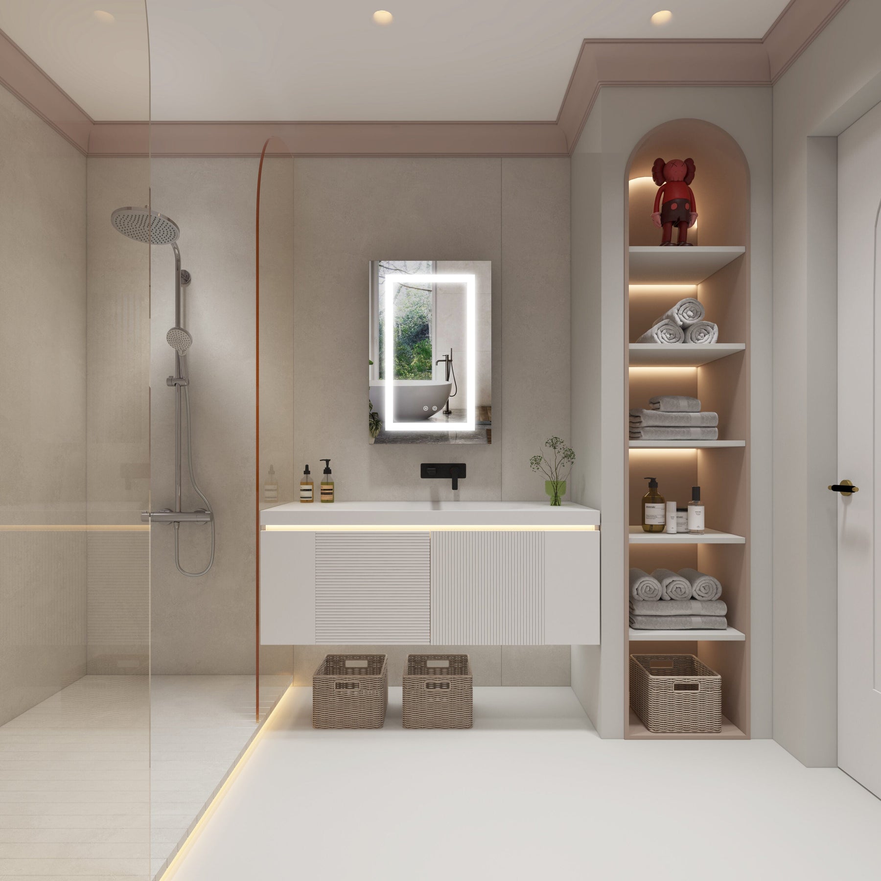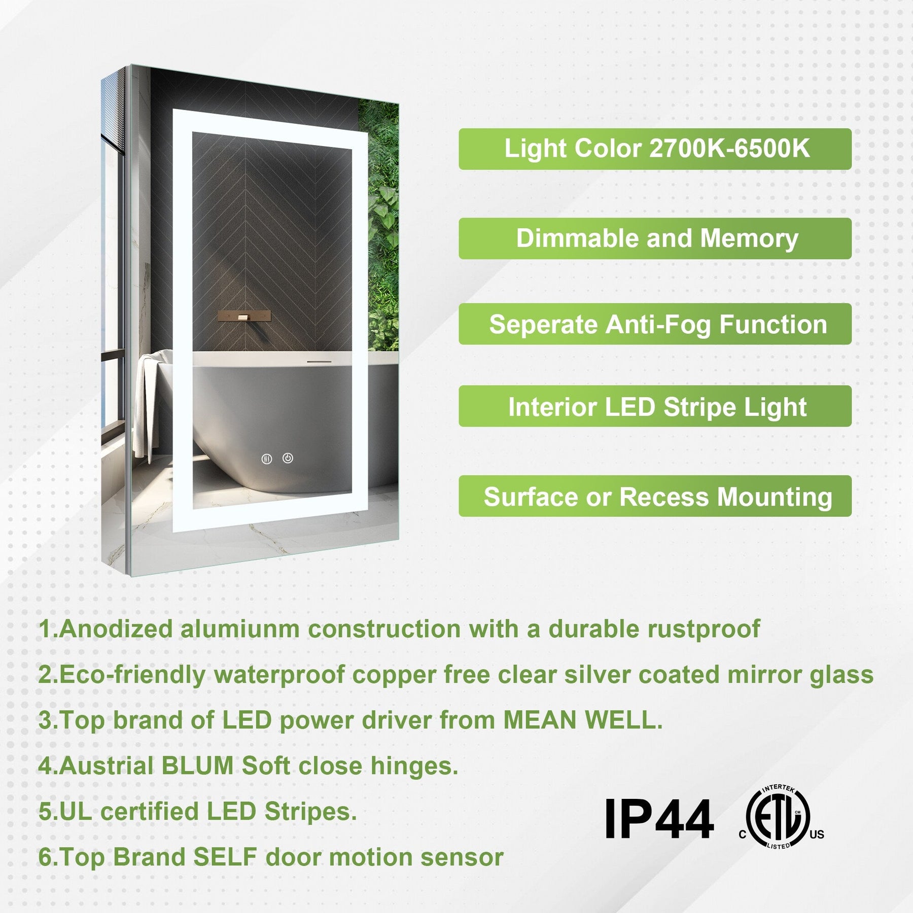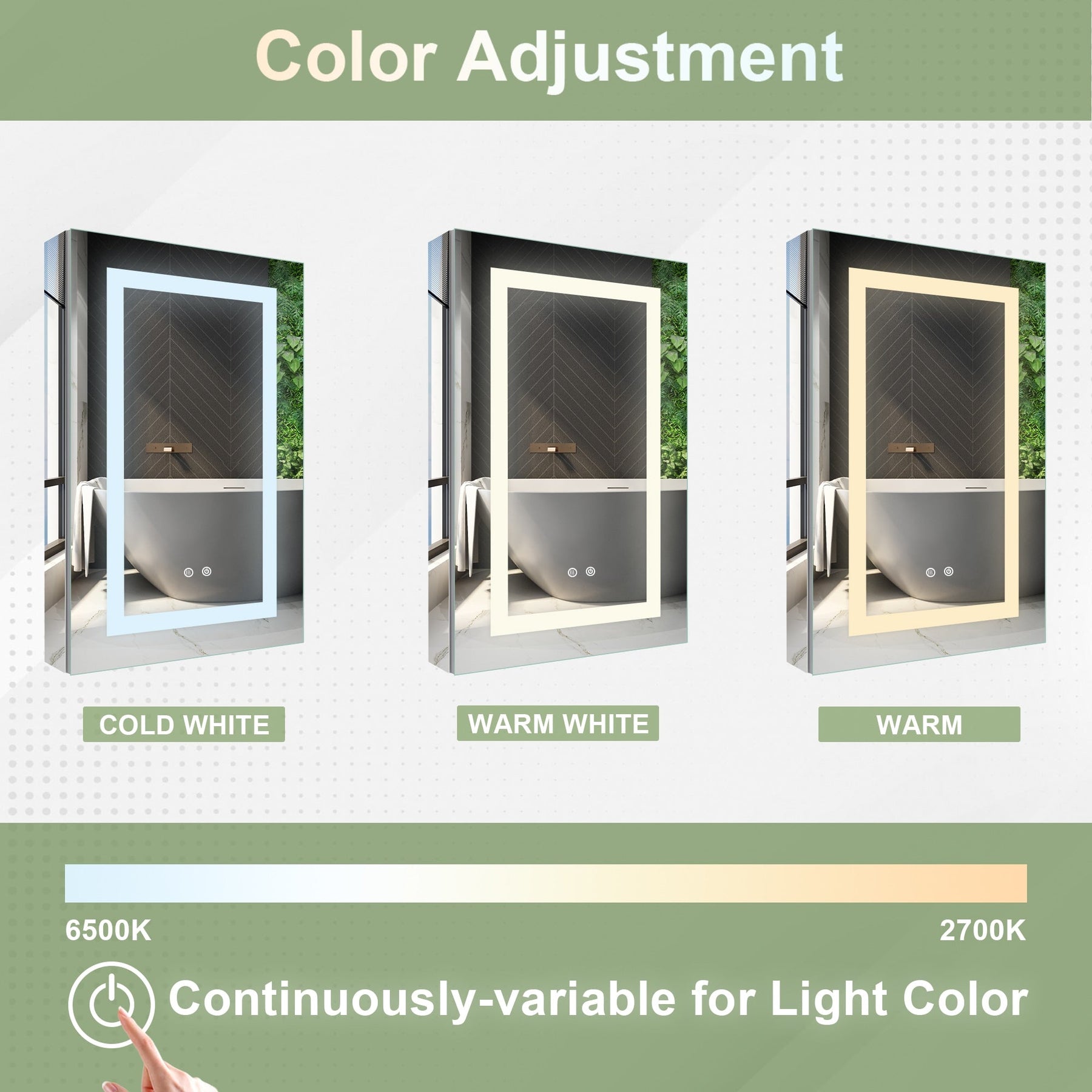 • LED Lighting: Adjust color temperatures from 2700K to 6500K for optimal bathroom ambiance and task lighting.