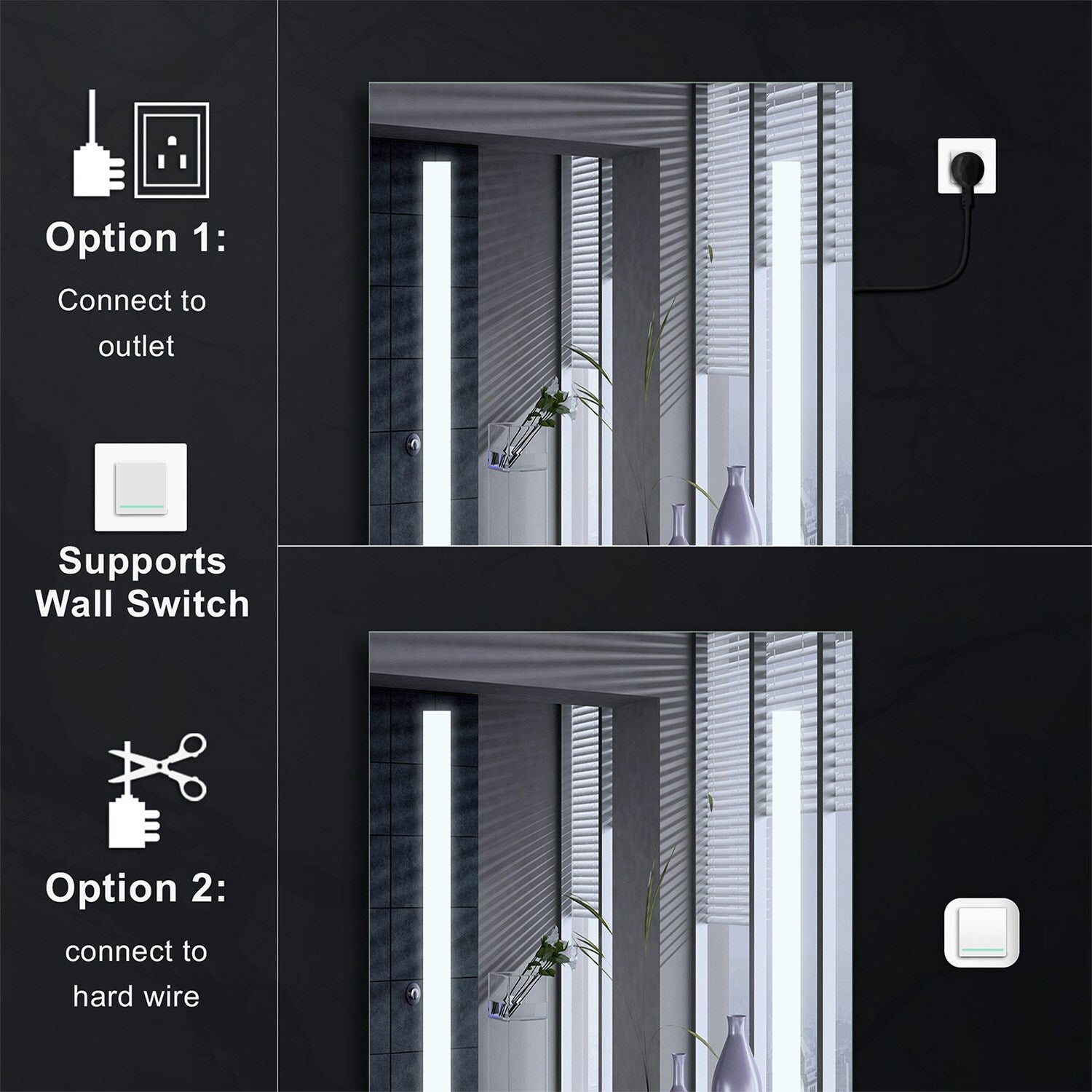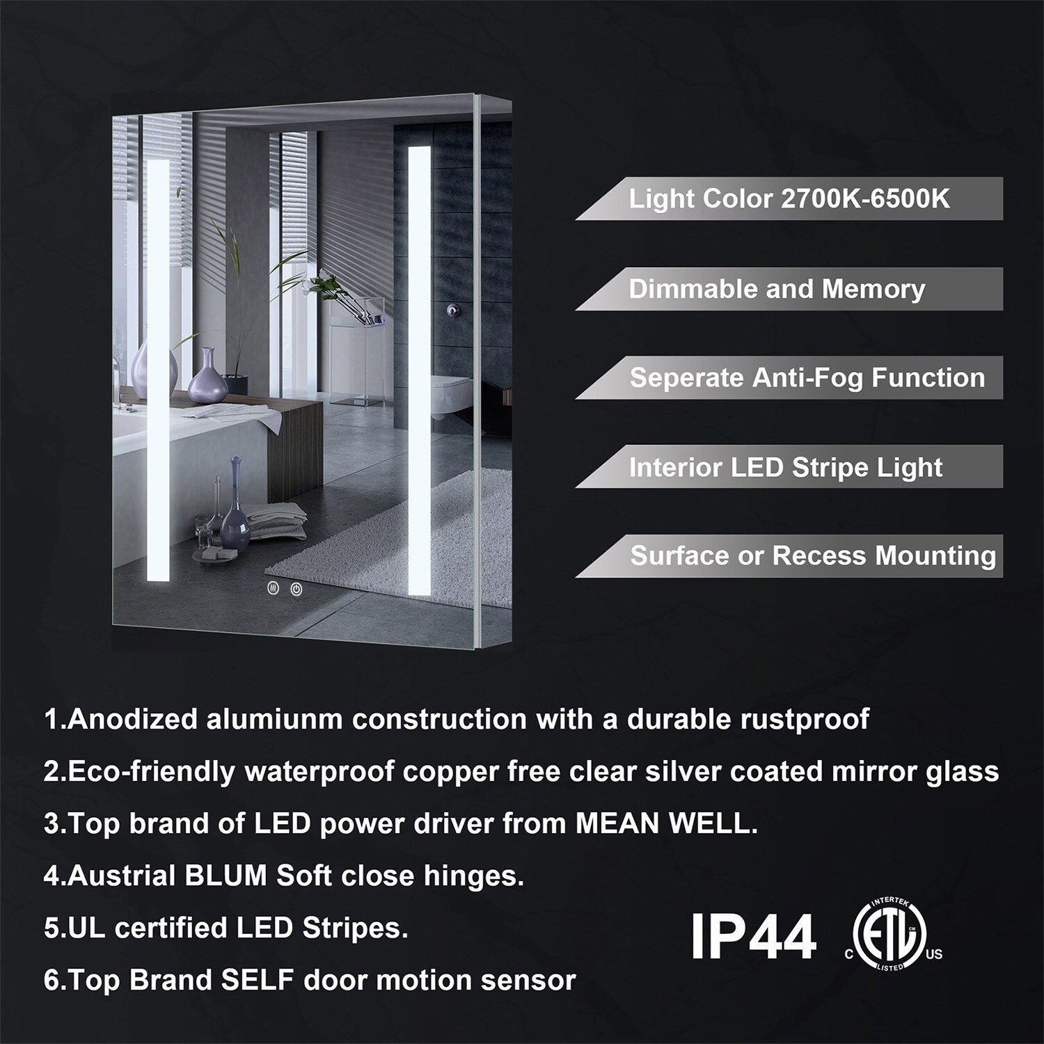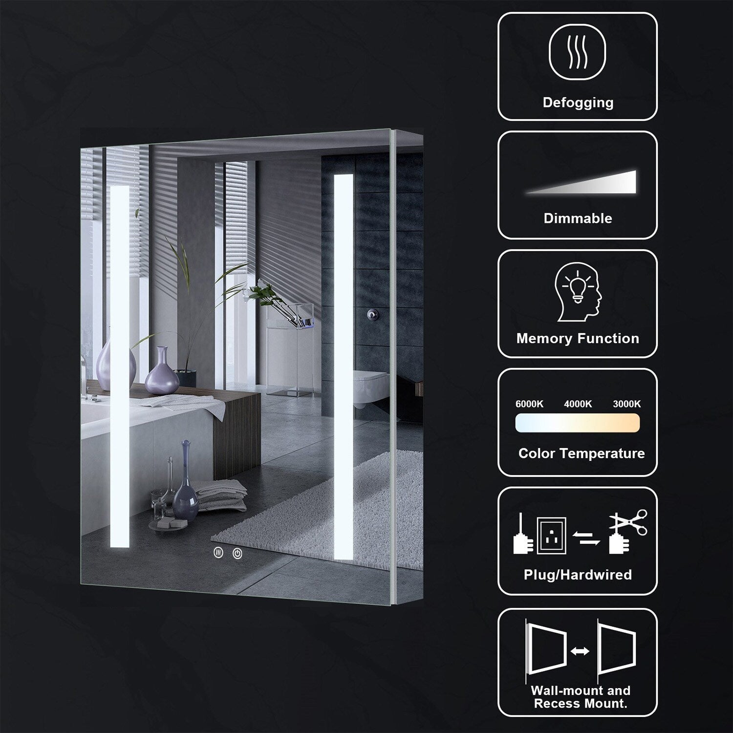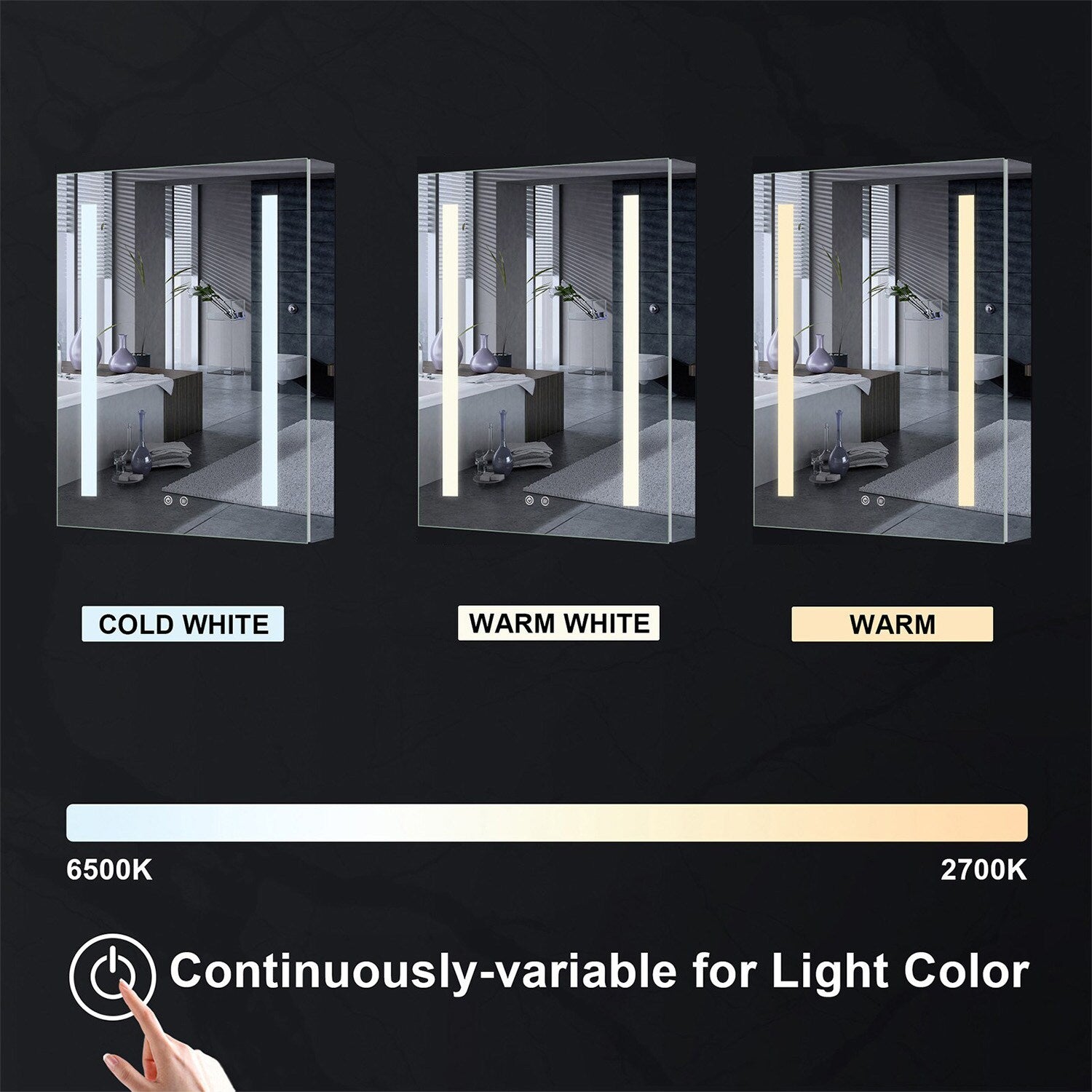 • Lighting Control: Variable color temperature from 2700K to 6500K for perfect bathroom ambiance.
