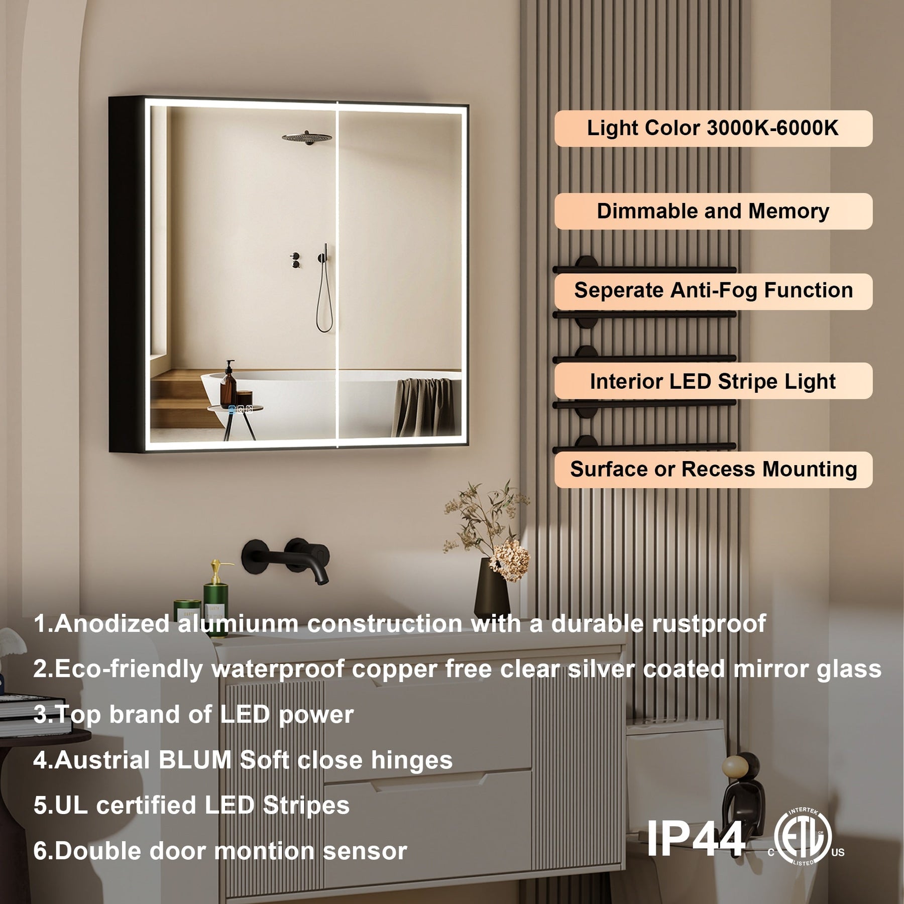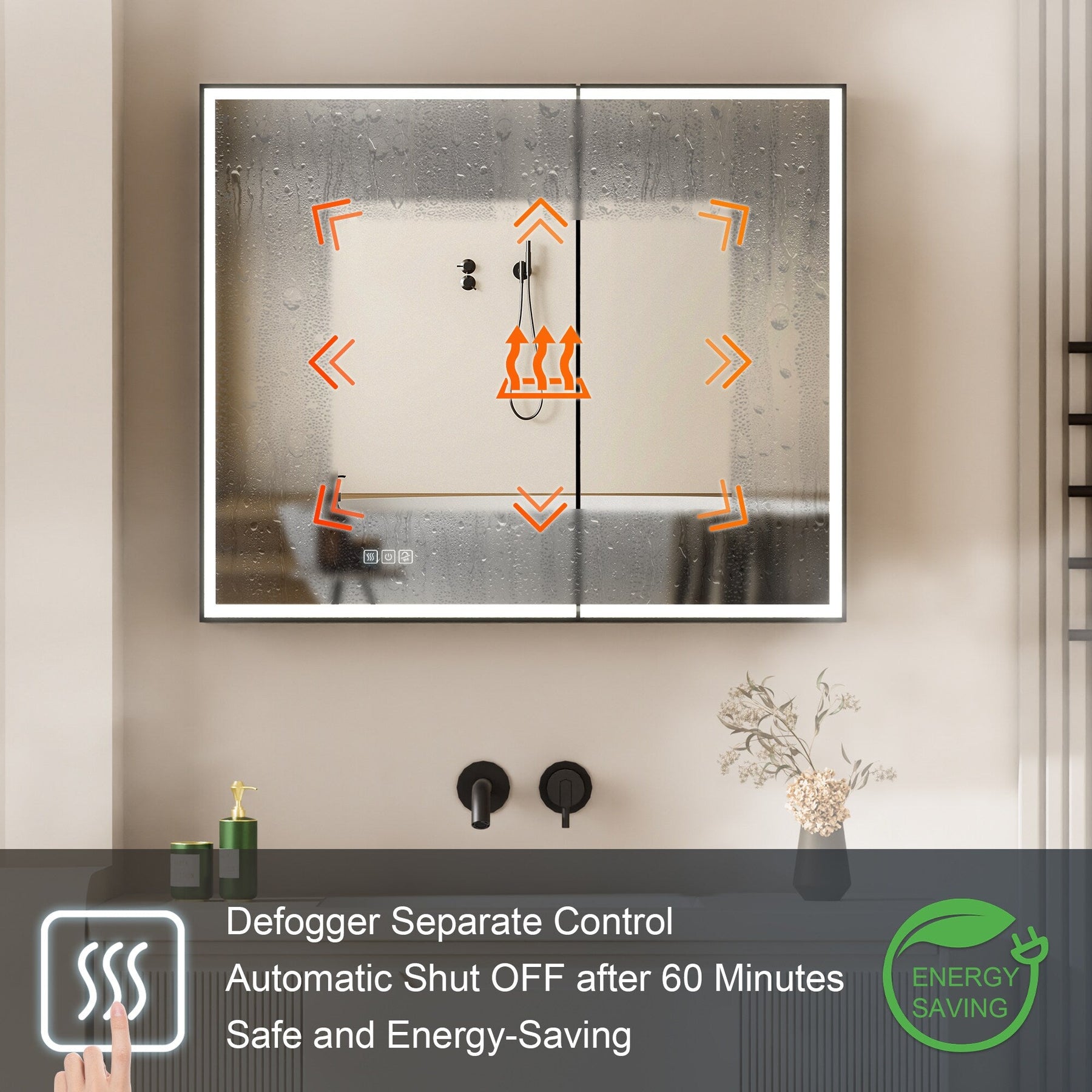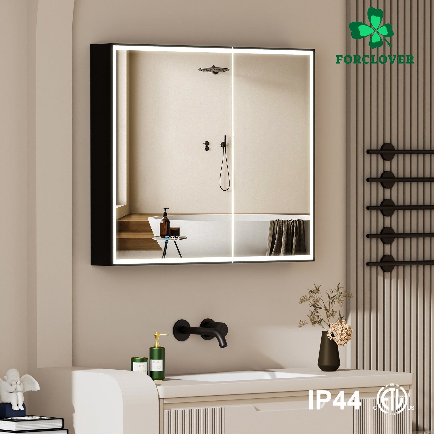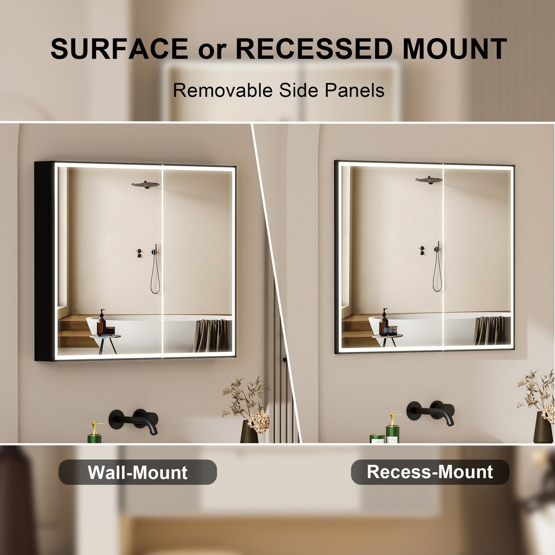 Forclover 36-in x 30-in Lighted LED Fog Free Surface/Recessed Mount Black Mirrored Soft Close Medicine Cabinet with Outlet