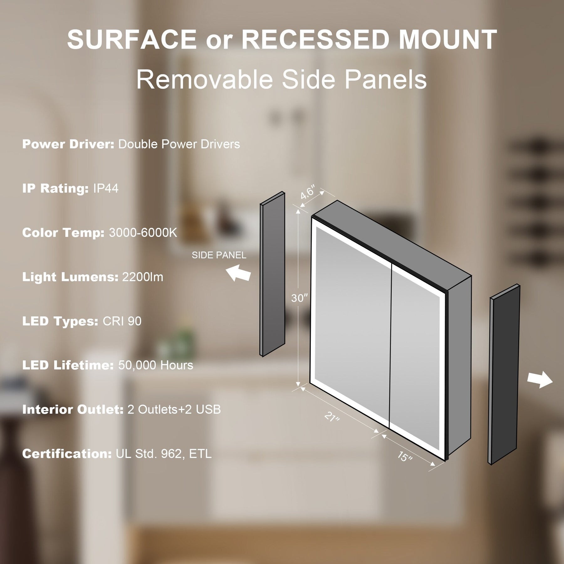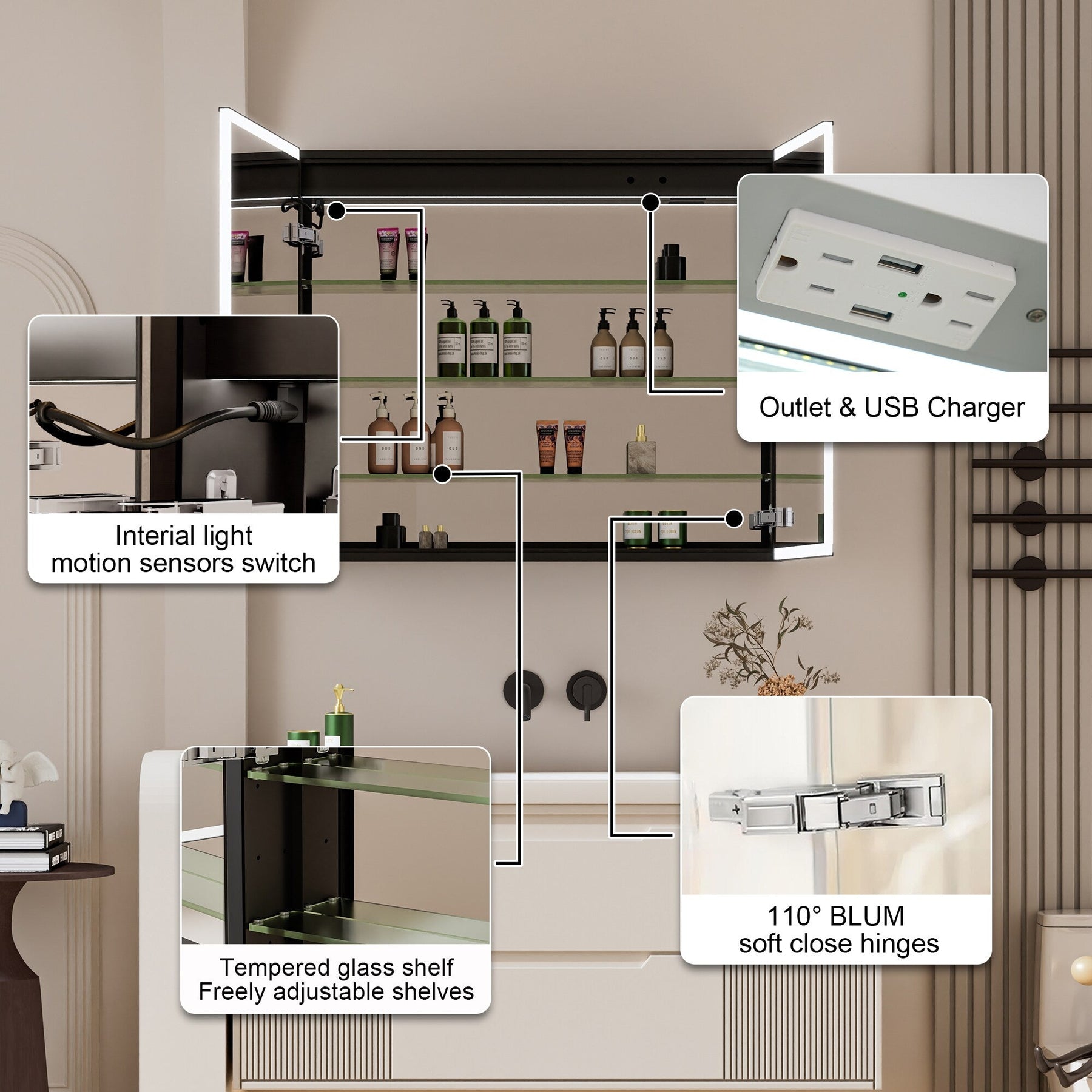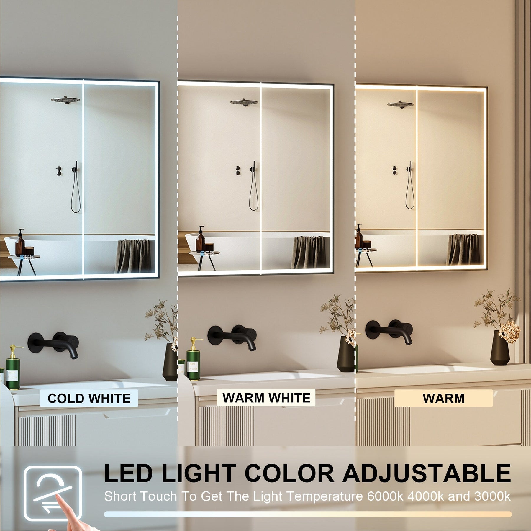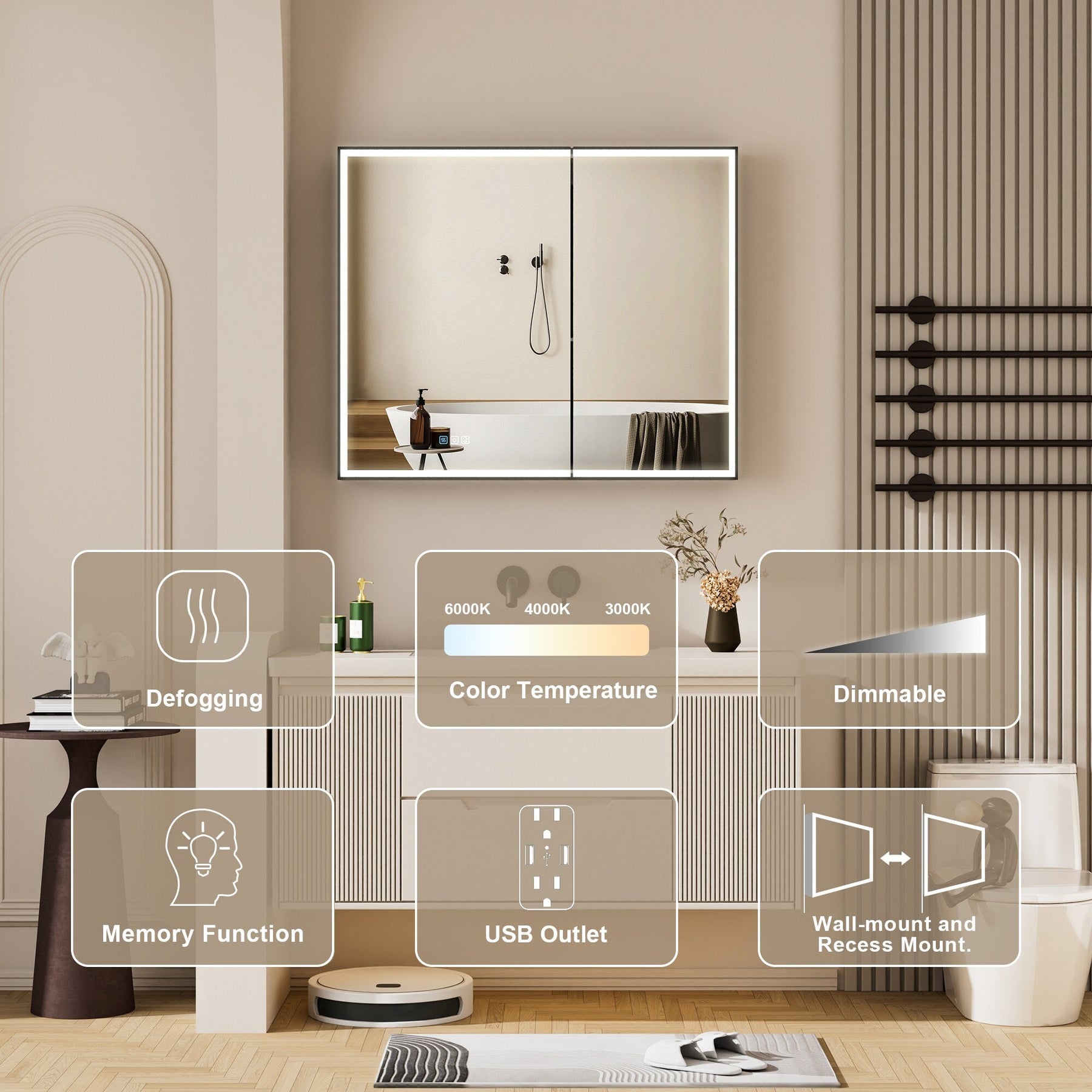 Forclover 36-in x 30-in Lighted LED Fog Free Surface/Recessed Mount Black Mirrored Soft Close Medicine Cabinet with Outlet