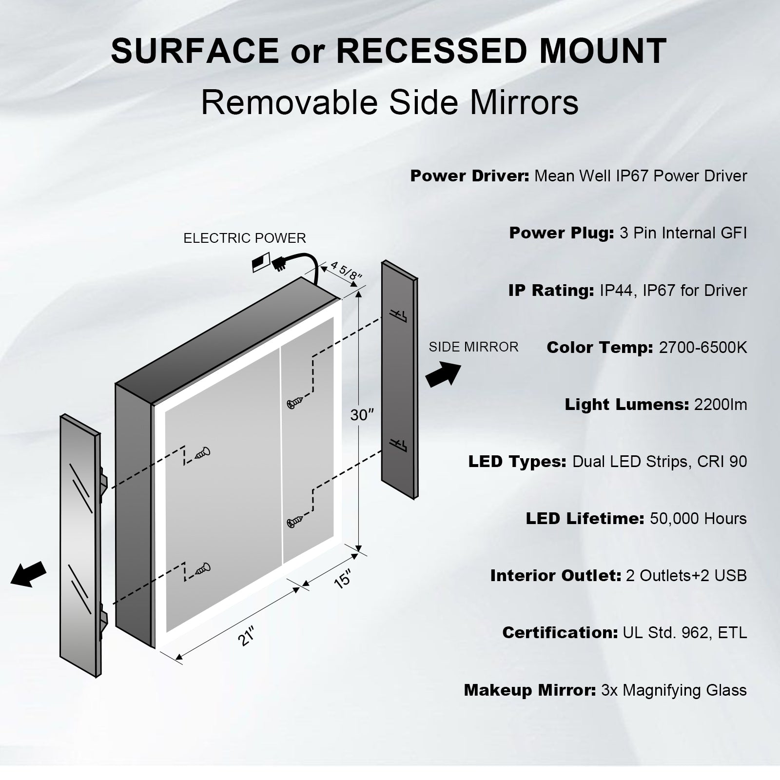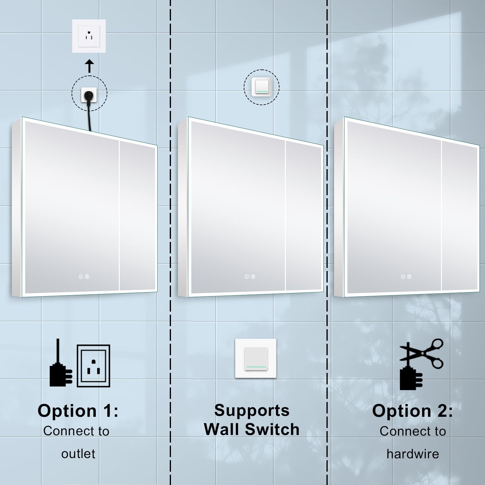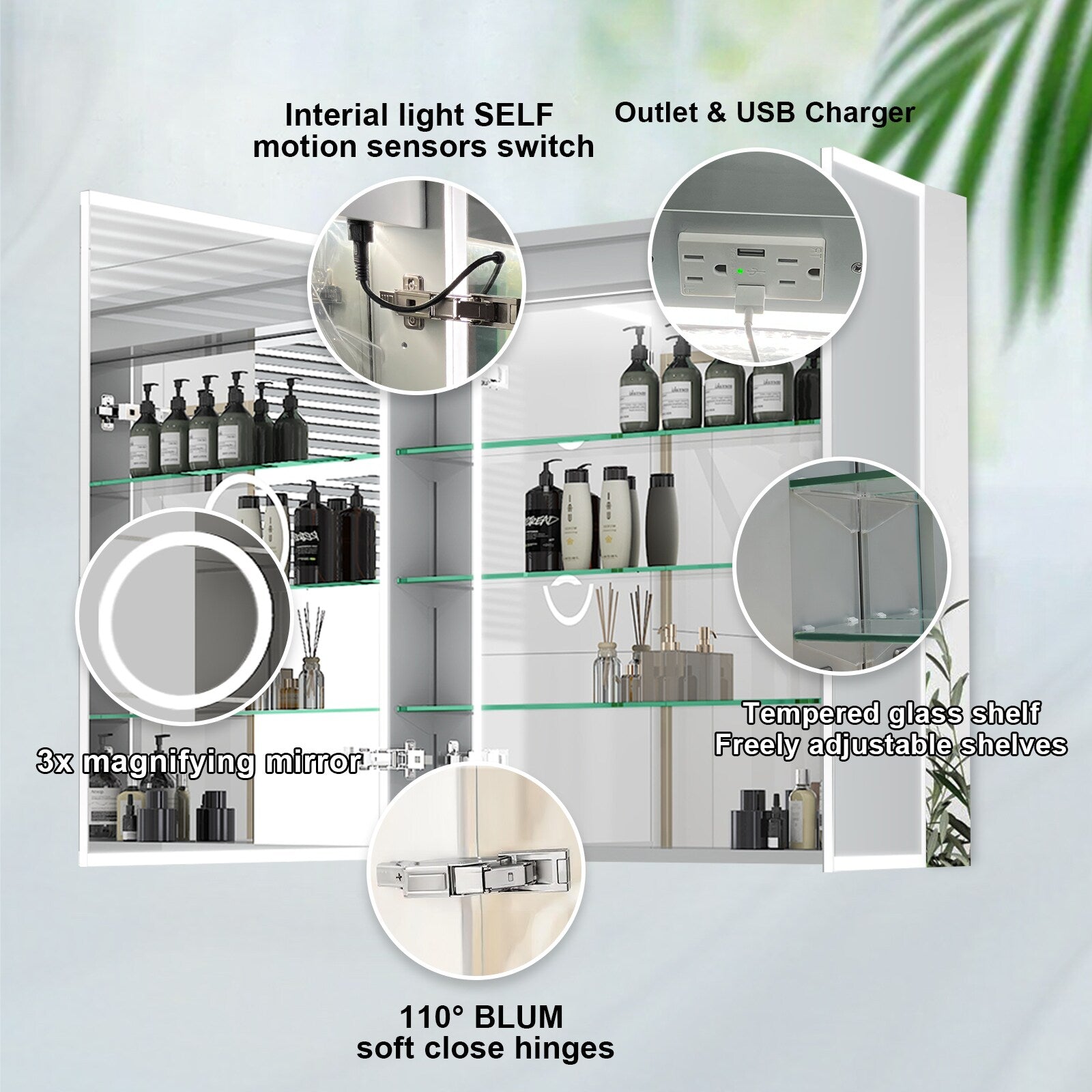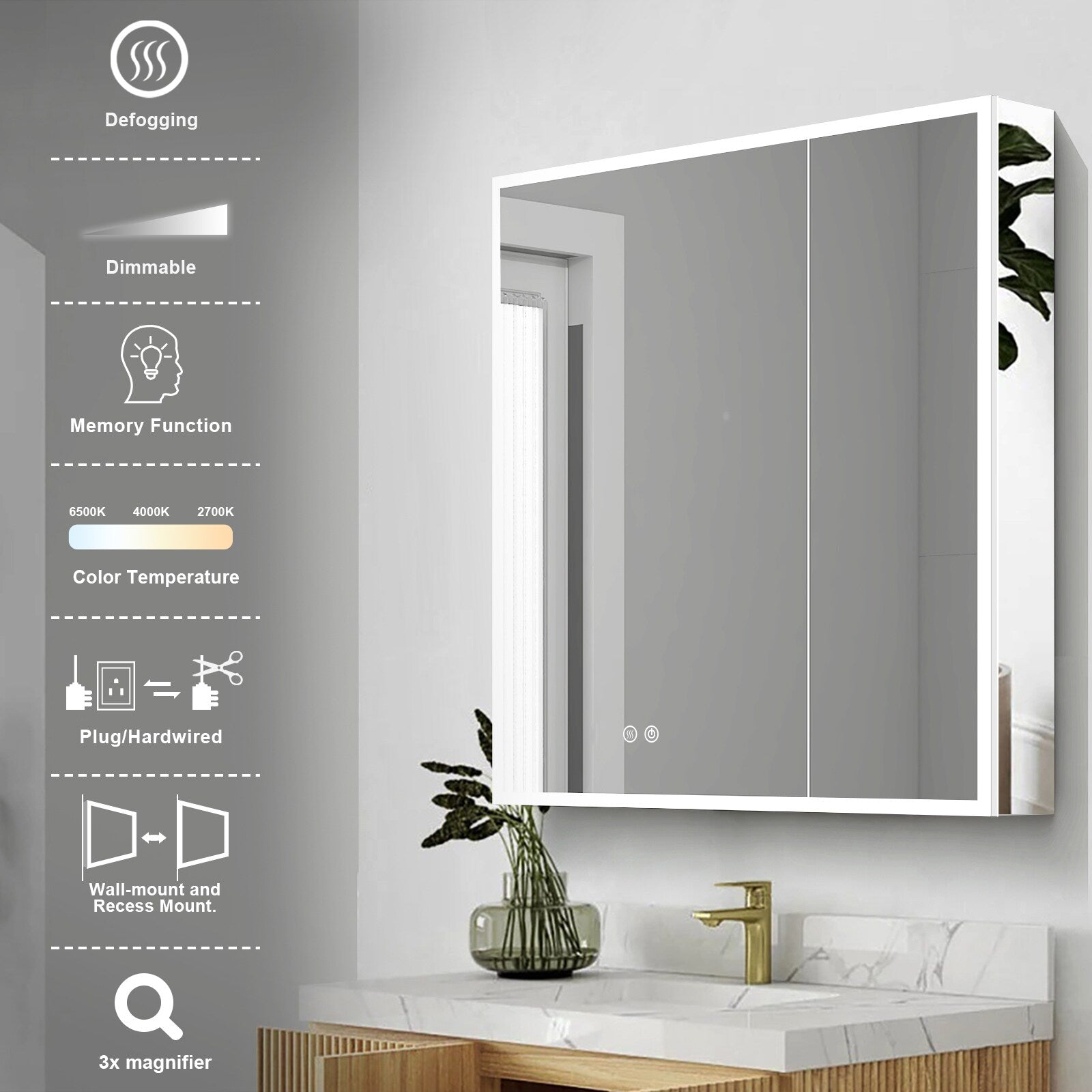 Forclover 36-in x 30-in Lighted LED Fog Free Surface/Recessed Mount Silver Mirrored Soft Close Medicine Cabinet with Outlet