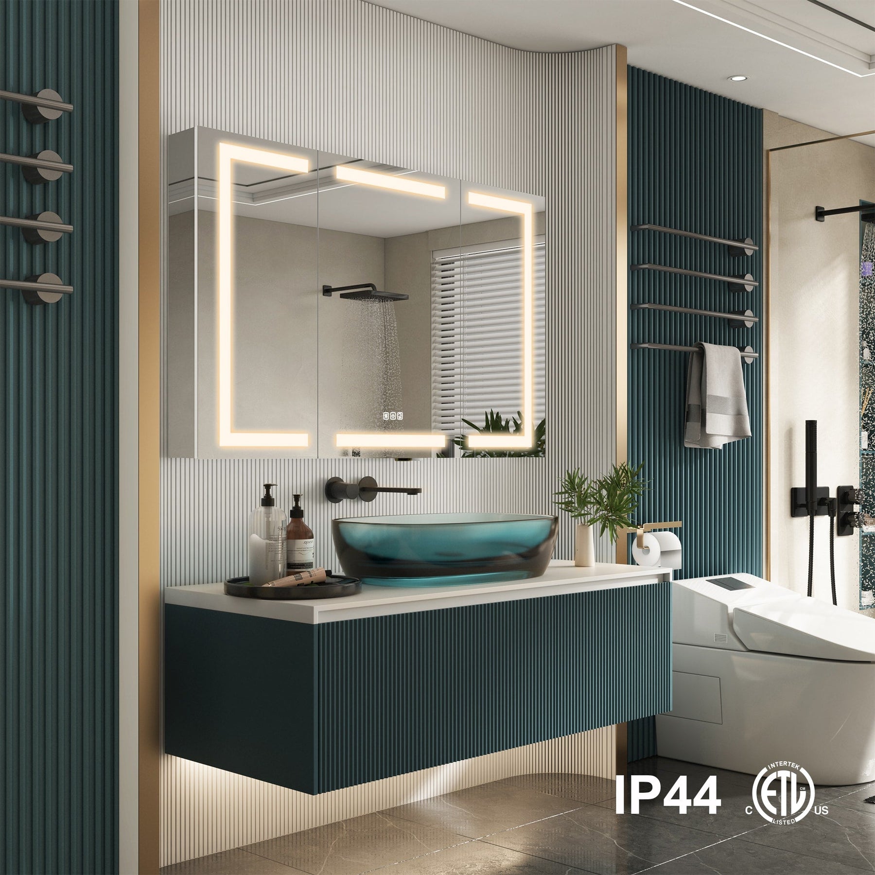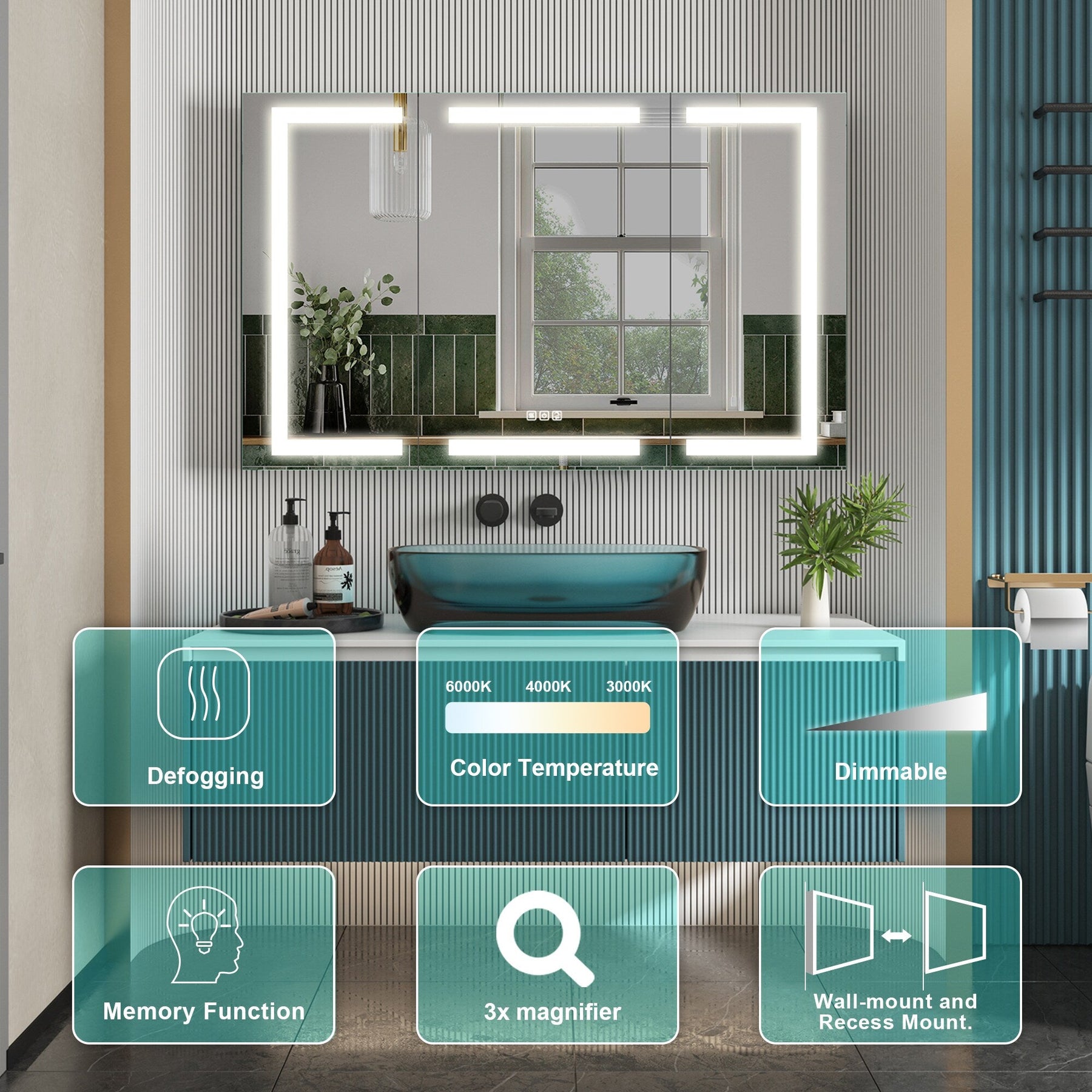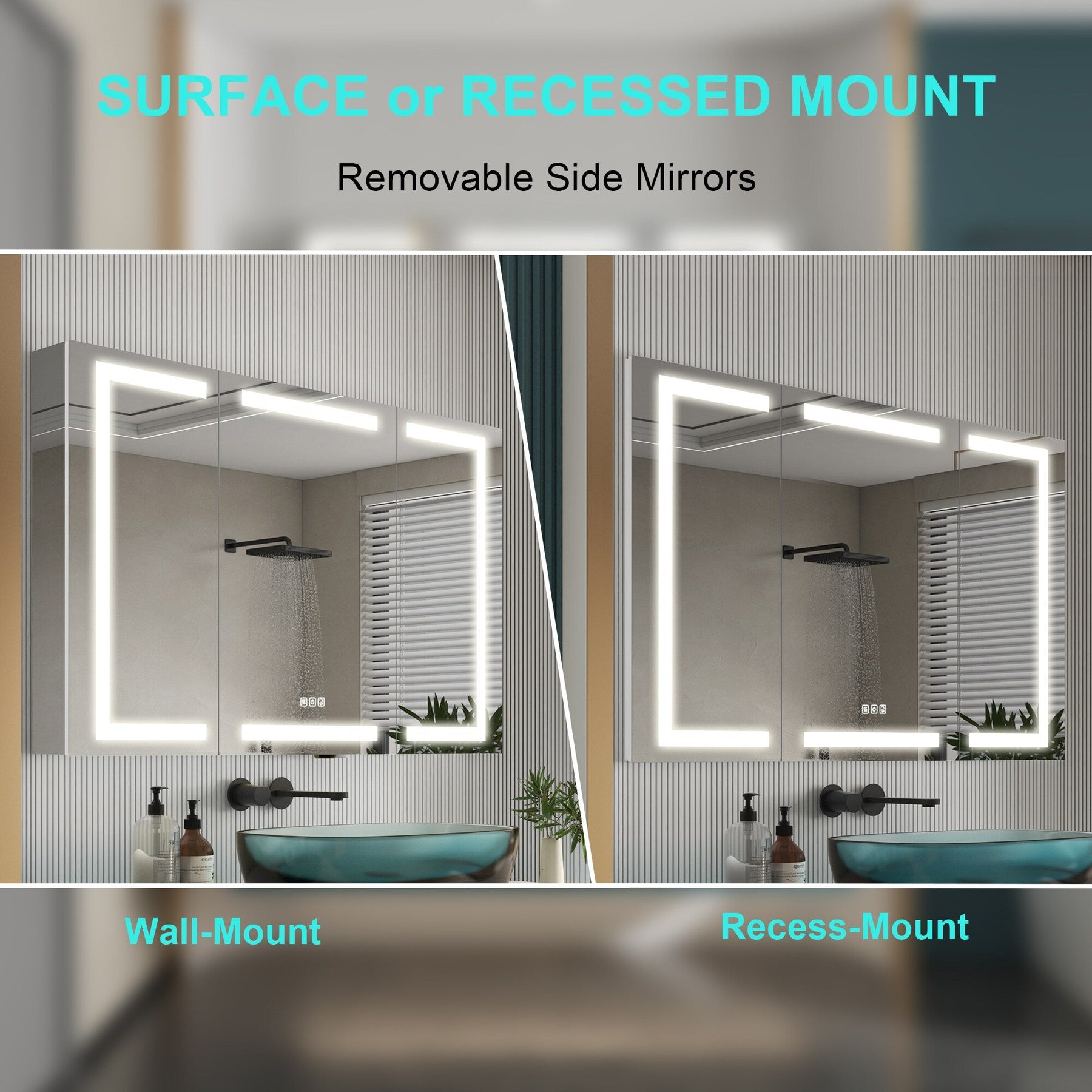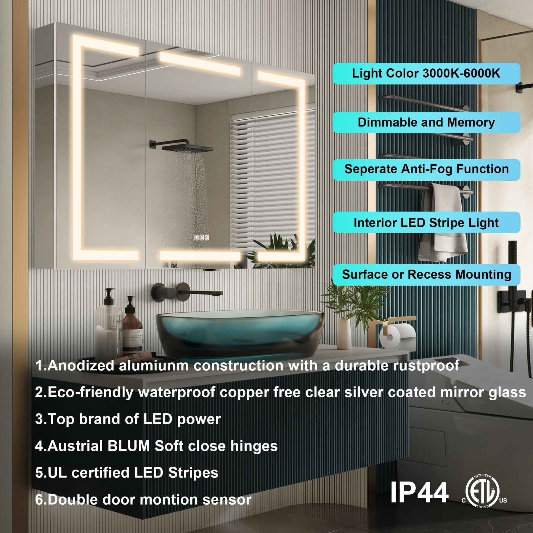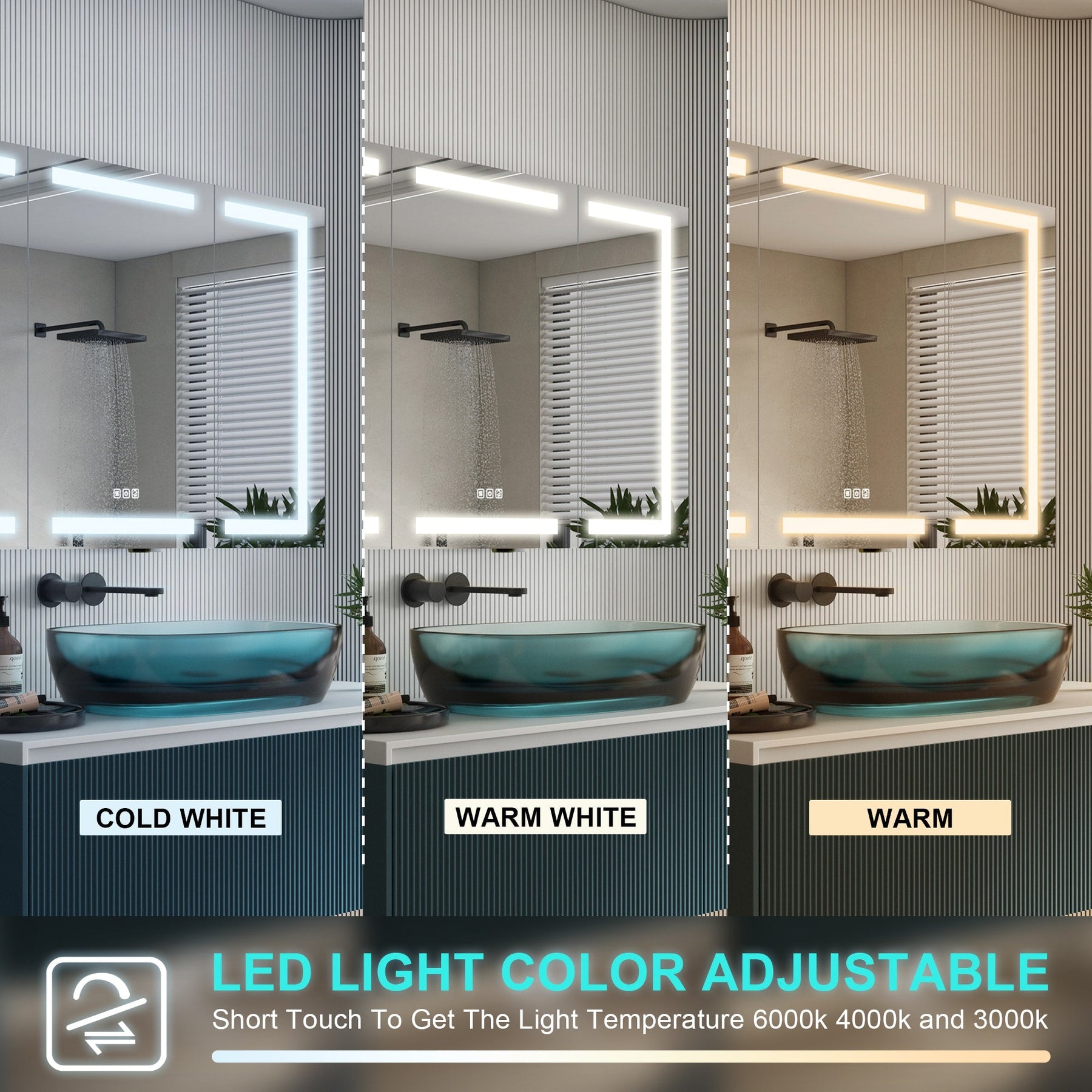 • Adjustable Lighting: Customizable light color temperatures from 2700K to 6500K enhance bathroom ambiance and functionality.