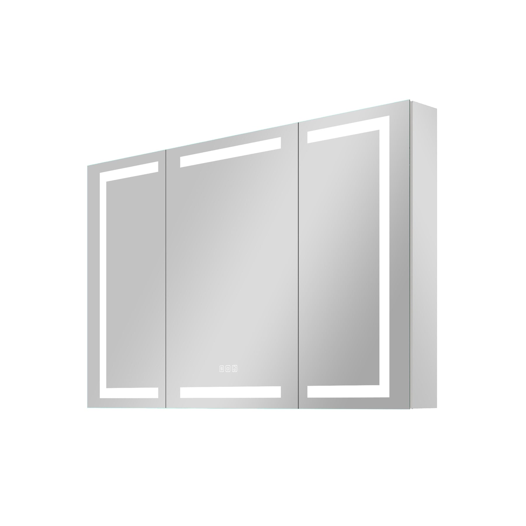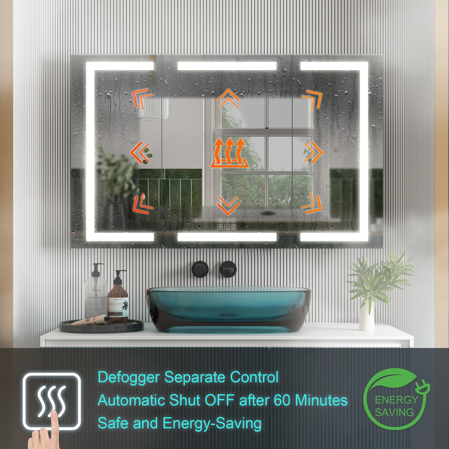 A: The cabinet features anti-fog mats that activate with the push of a button, automatically shutting off after 60 minutes to conserve energy.
