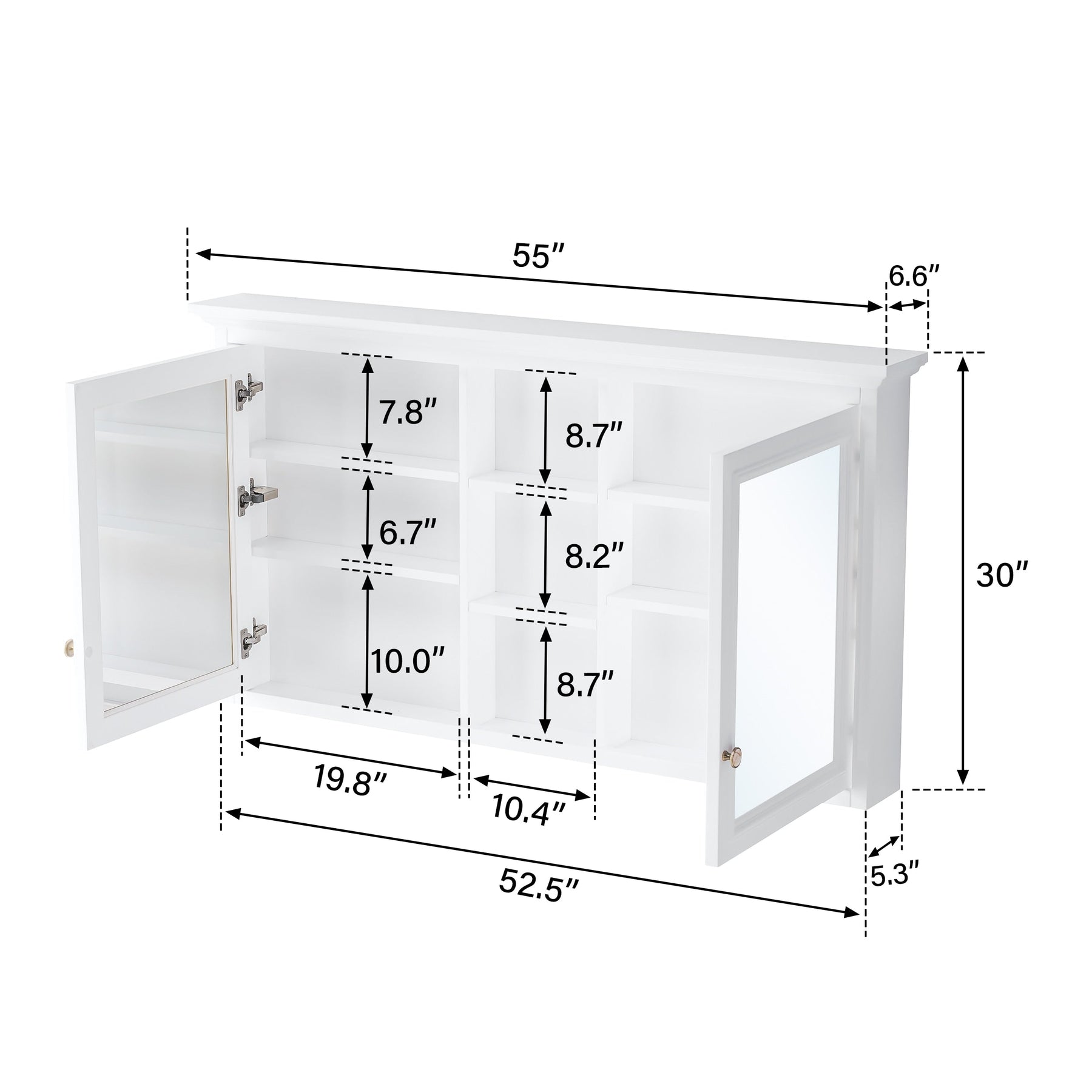 Upgrade your bathroom aesthetic with the Forclover 55x30 Mirrored Soft Close Medicine Cabinet, crafted from durable poplar wood in a sleek white finish. Its dual soft-close mirrored doors offer both style and practicality, providing ample storage with six shelves for all your essentials.