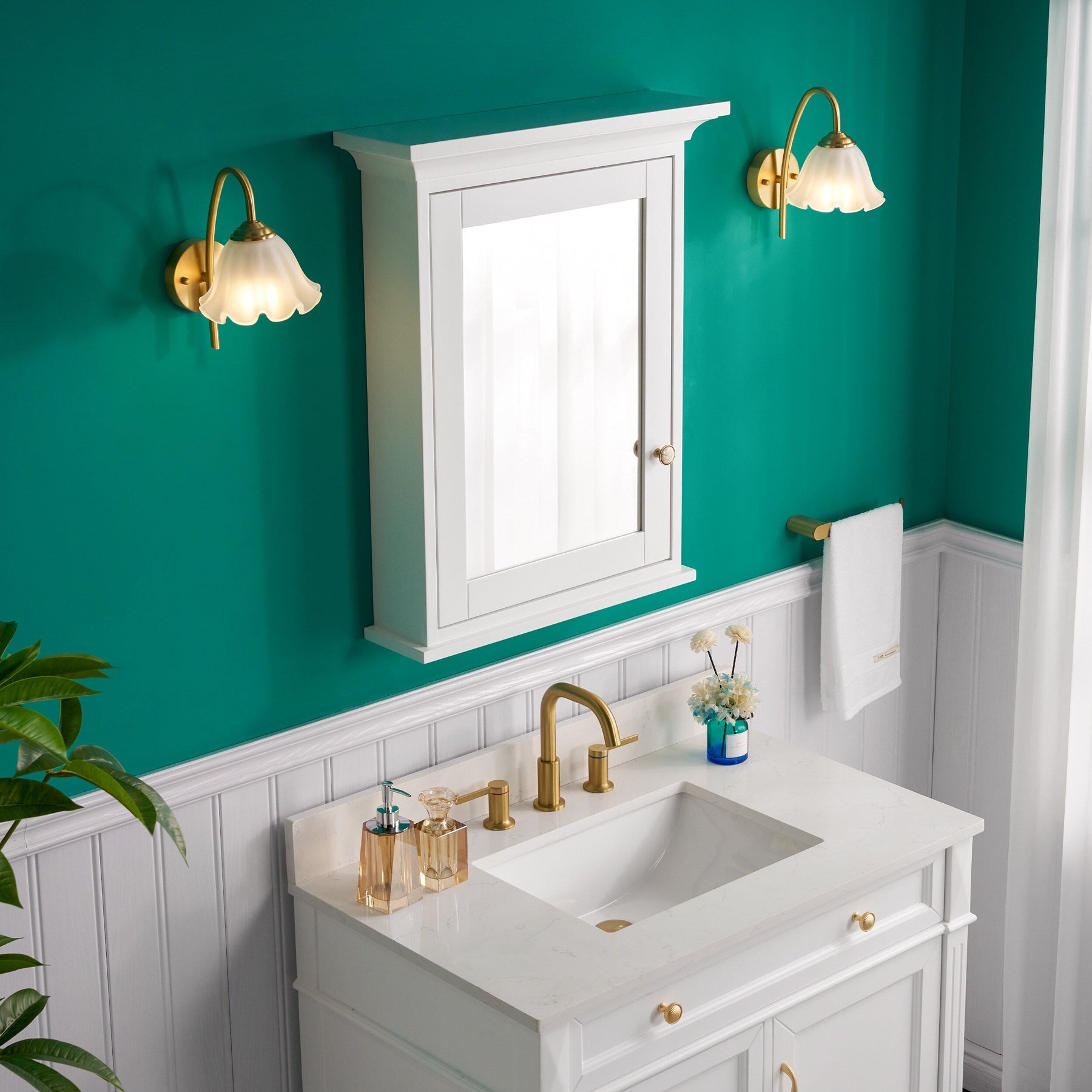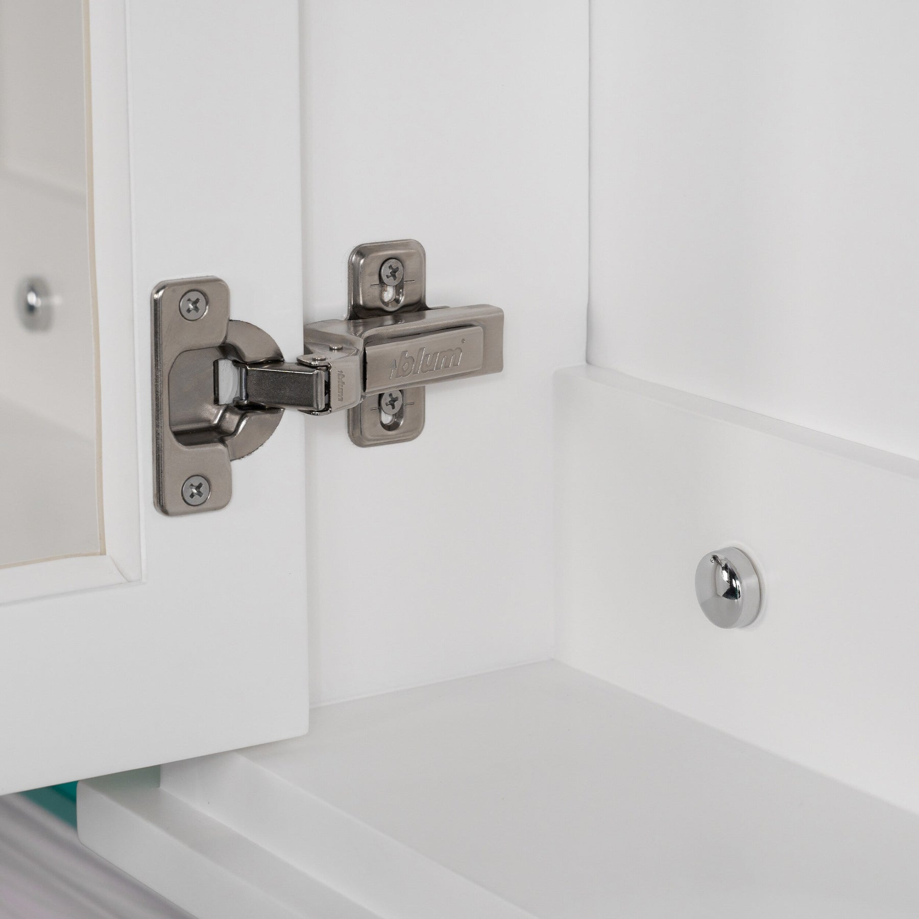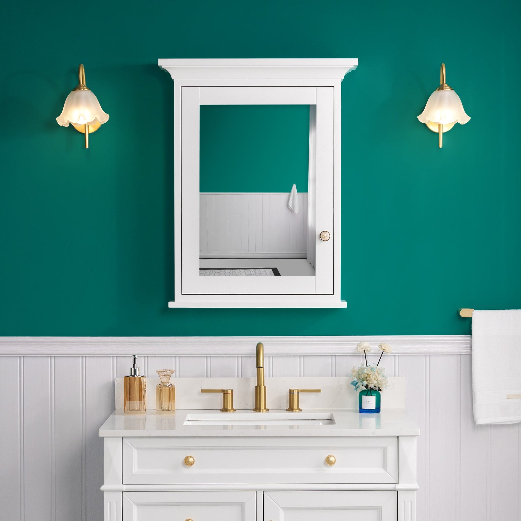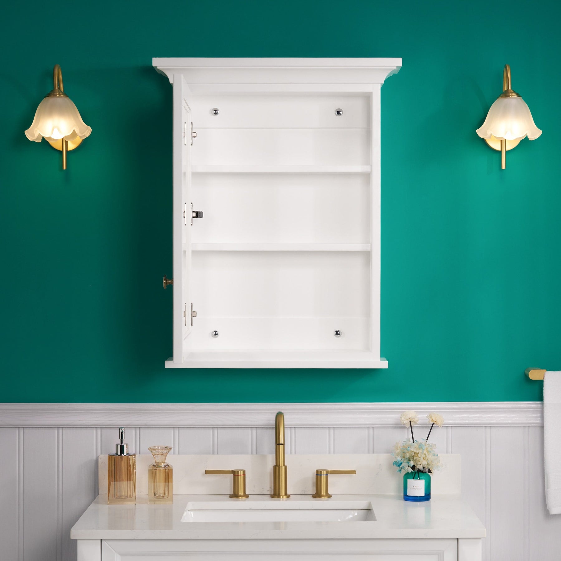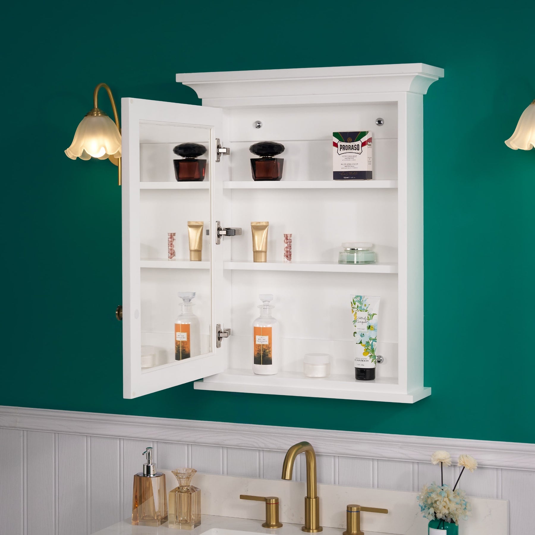 This lighted medicine cabinet blends functionality with style, featuring a soft-close door and classic white finish. Crafted from solid rubberwood, it offers ample storage with multiple shelves and enhances your bathroom with its elegant, illuminated design.