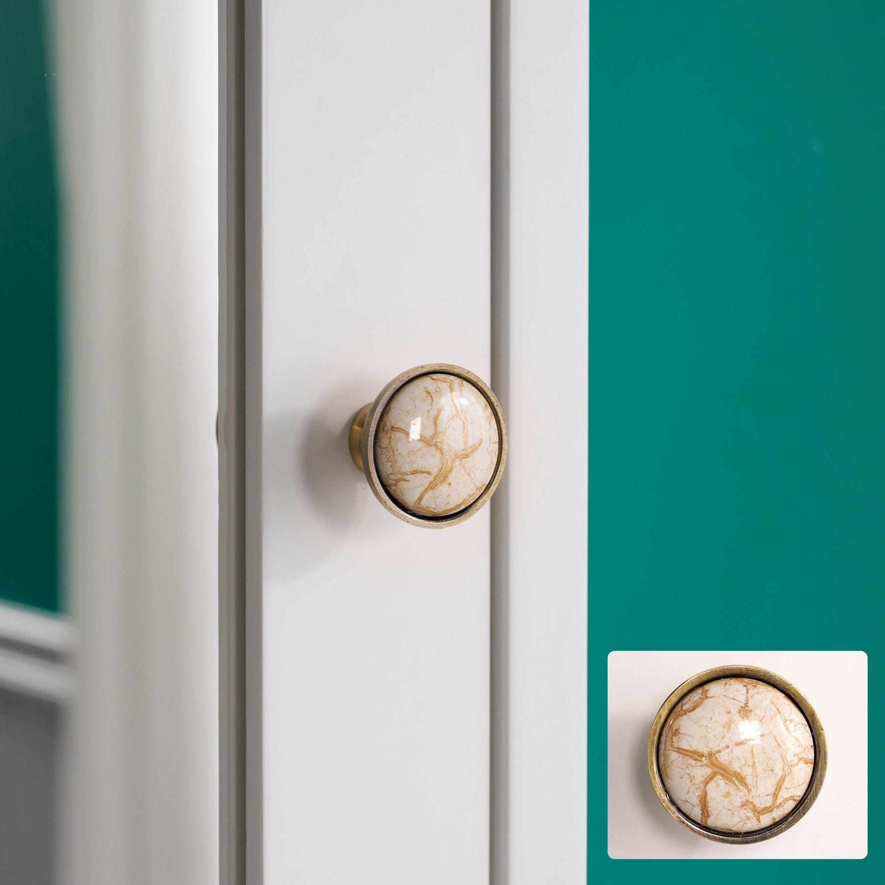 • Elegant Hardware: Features metal alloy hardware with decorative porcelain.