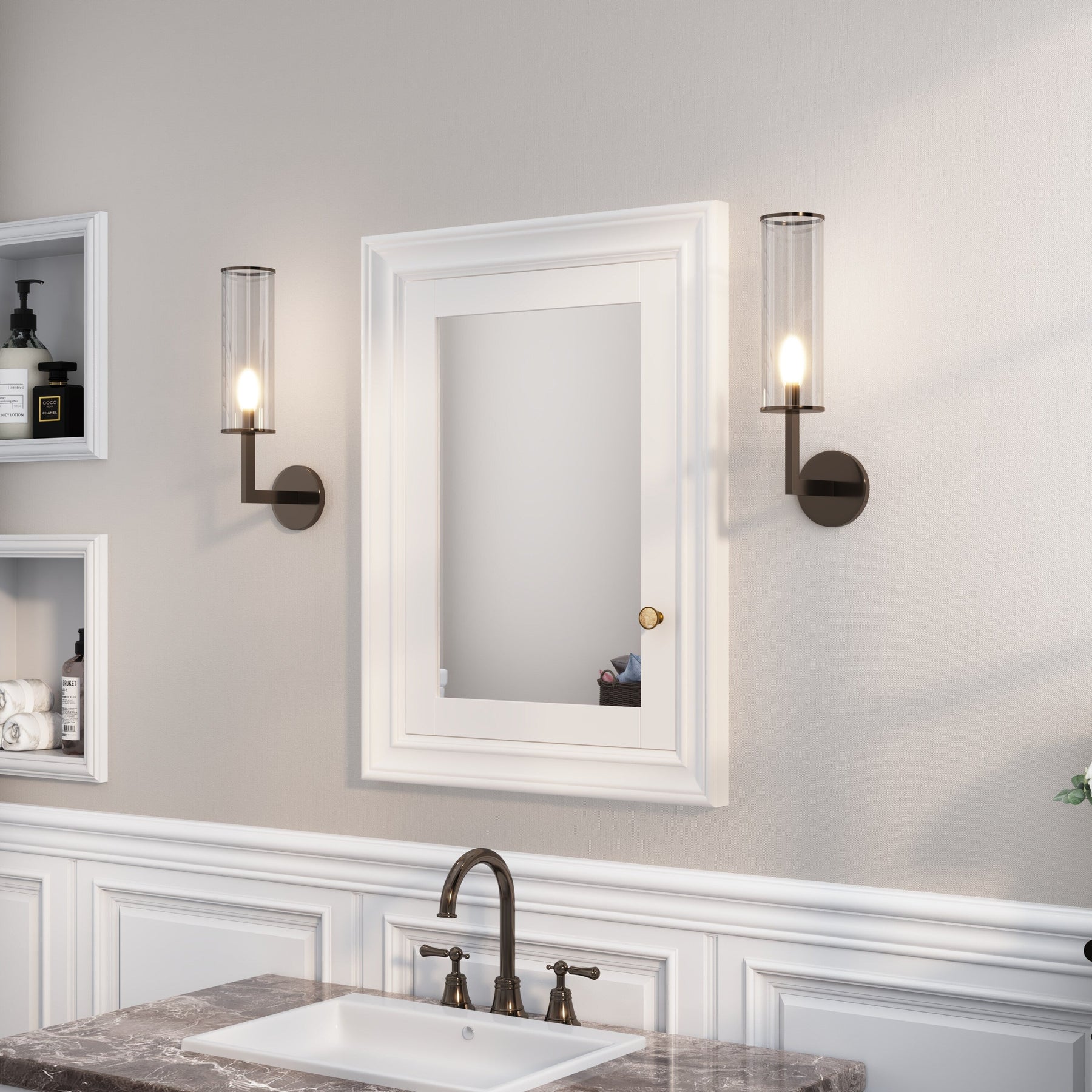 The Forclover Solid Wood Mirrored Medicine Cabinet transforms your bathroom into a serene oasis with its impeccable craftsmanship and sophisticated design. The porcelain-accented metal alloy handles provide an exquisite juxtaposition of textures, making each opening a tactile delight. Arrange your lotions and potions artfully on the adjustable glass shelves, turning everyday storage into a visually pleasing gallery. Embrace this cabinet as a quintessential part of your lavish bath space, where form meets function seamlessly.