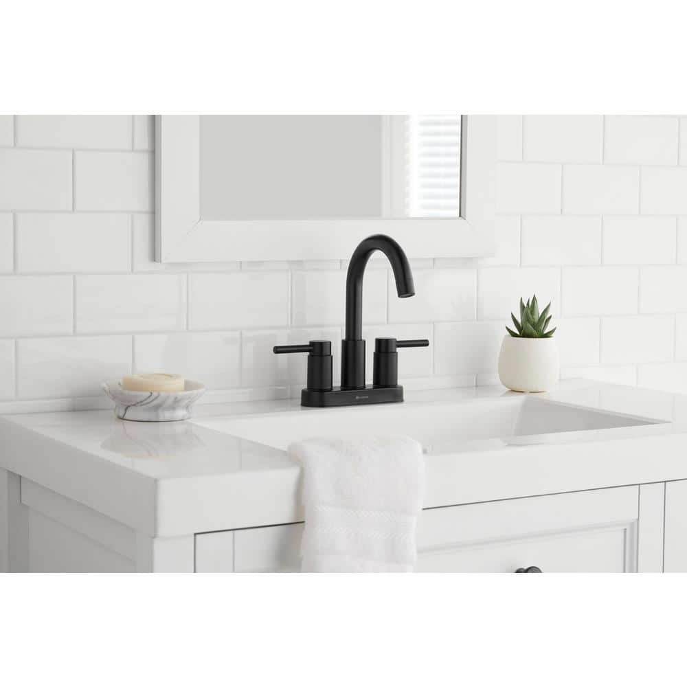 A modern high-arc bathroom faucet designed for 3-hole, 4-inch centerset sinks. WaterSense certified at 1.2 GPM with ceramic disc cartridges for reliable, drip-free performance, finished in matte black for a bold look.
