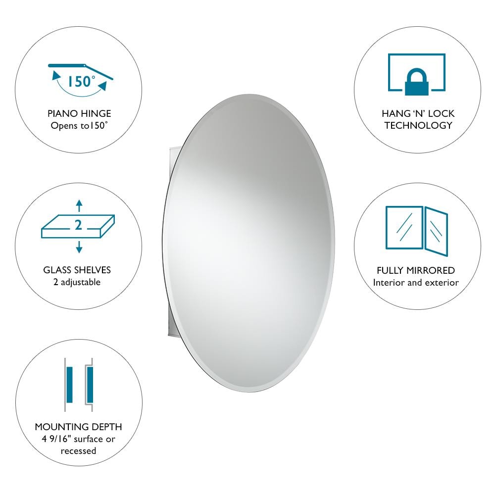 Elevate your bathroom's functionality and style with the Jacuzzi Aluminum Oval Mirrored Medicine Cabinet. Featuring dual-sided mirrored doors and a mirrored back panel, this cabinet offers a clear view from every angle while its adjustable shelving maximizes storage flexibility. Designed for both surface and recessed mounting, it includes the Hang 'N' Lock system for hassle-free installation.