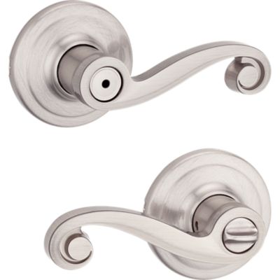Traditional Lido lever by Kwikset delivers a classic scroll profile in a durable satin nickel finish for bedroom or bathroom doors. Features Microban antimicrobial technology and an easy, reversible installation with adjustable latch to fit standard doors.