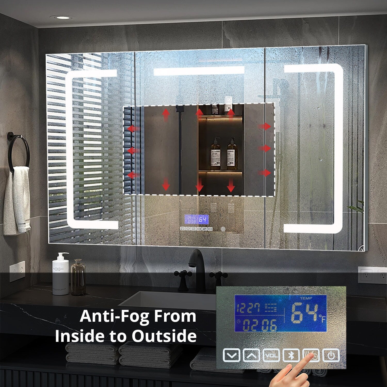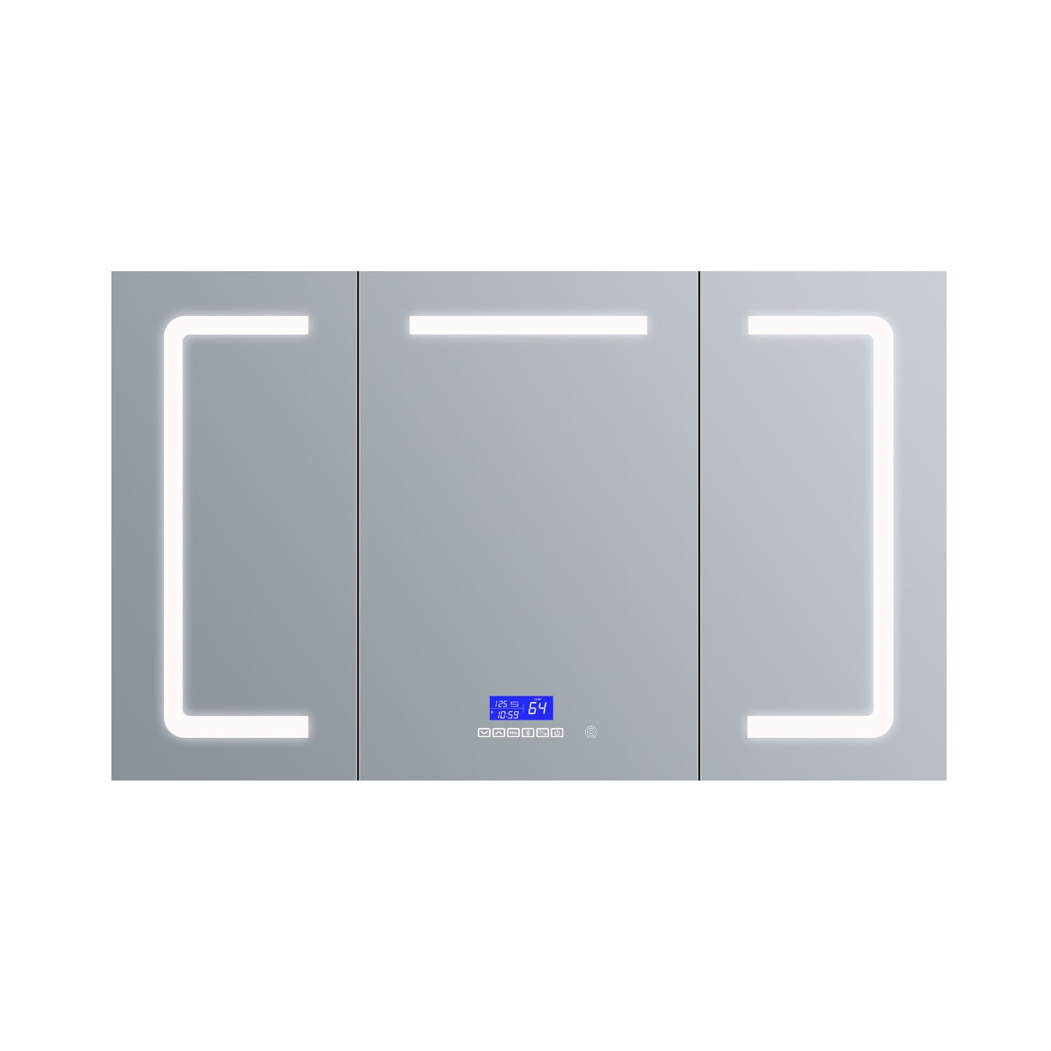 Upgrade your bathroom with the Lesina 60-in mirrored cabinet, featuring integrated LED lighting and a fog-free design for crystal-clear reflections. This stylish and functional powerhouse comes with a built-in digital clock and Bluetooth speaker, all elegantly controlled via touch screen.