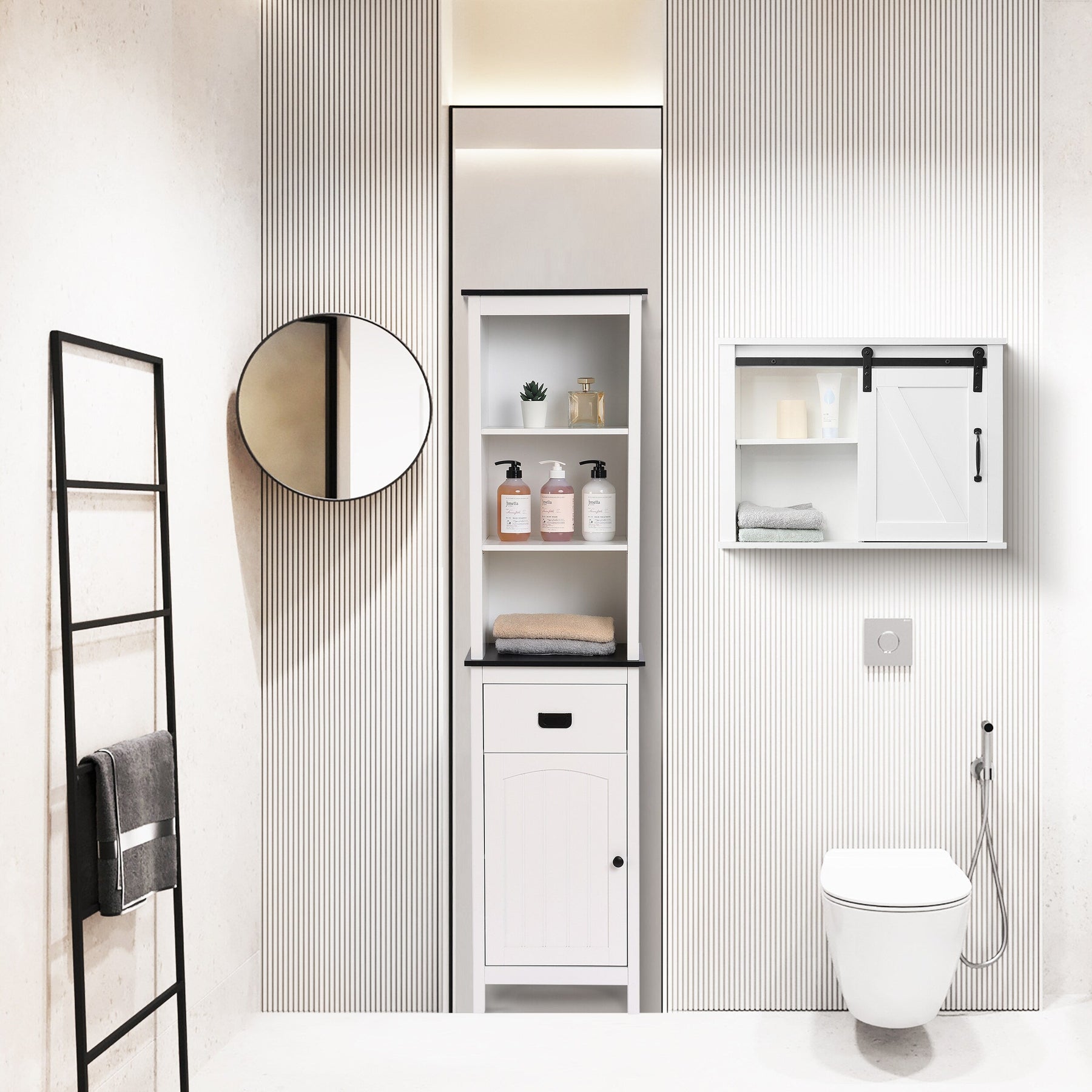 Unveiling a quaint yet captivating addition to your home, the LuxenHome White Bathroom Wall Cabinet is a testament to both style and function. Its charming sliding barn door draws the eye, transforming ordinary storage into a focal point. Style it with woven baskets and plush towels for a curated look that sings of rustic allure. An essential for tidy, luxurious living, this cabinet ensures your essentials are elegantly hidden yet always within reach.
