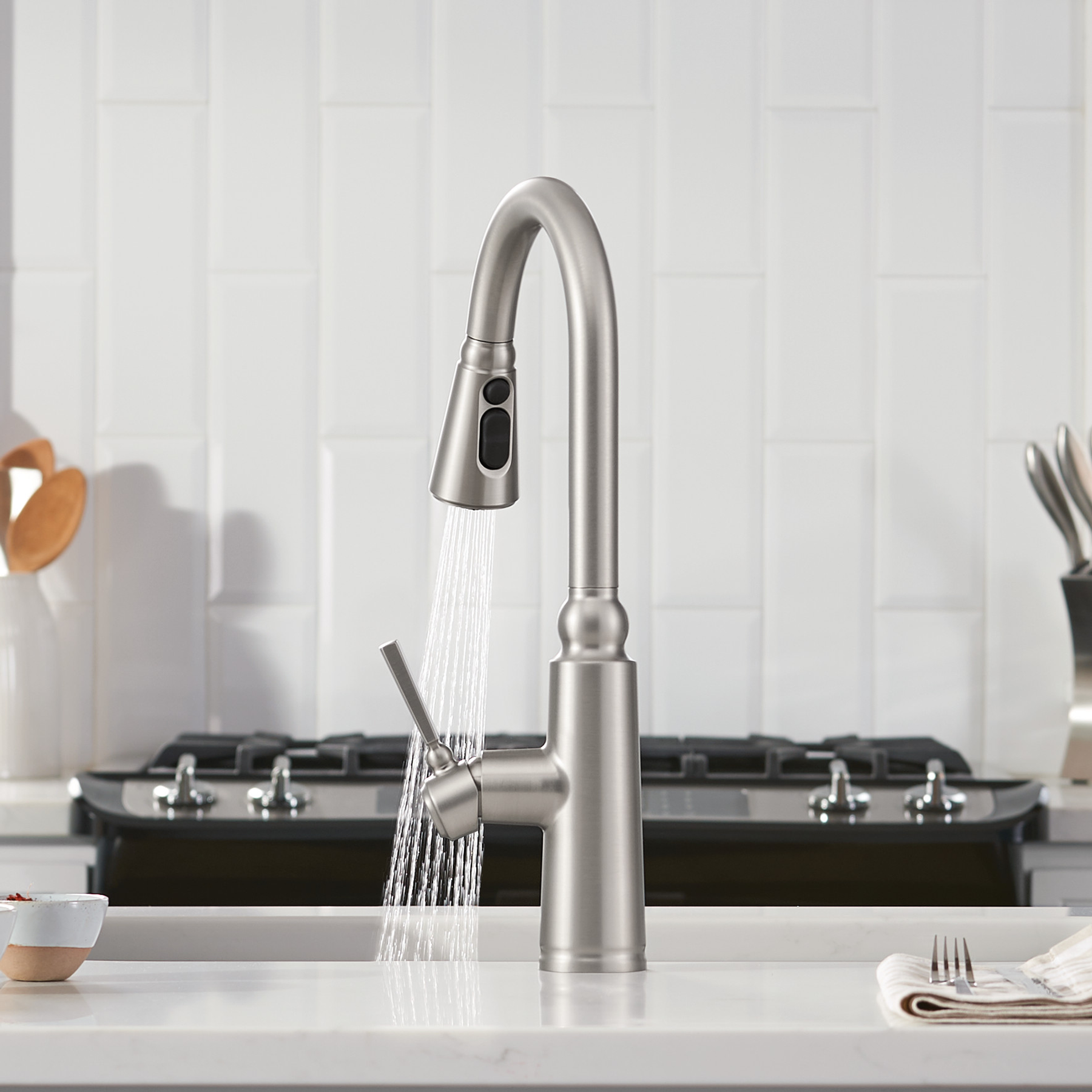 Coretta’s gracefully arched silhouette and sculpted base bring a refined, transitional note to the kitchen. The Mediterranean Bronze finish lends warmth and depth, while the streamlined lever keeps the look crisp and contemporary. Style it with natural stone counters and matte hardware to let its curve become the room’s quiet centerpiece. A smart essential that marries everyday function with elevated, luxurious living.