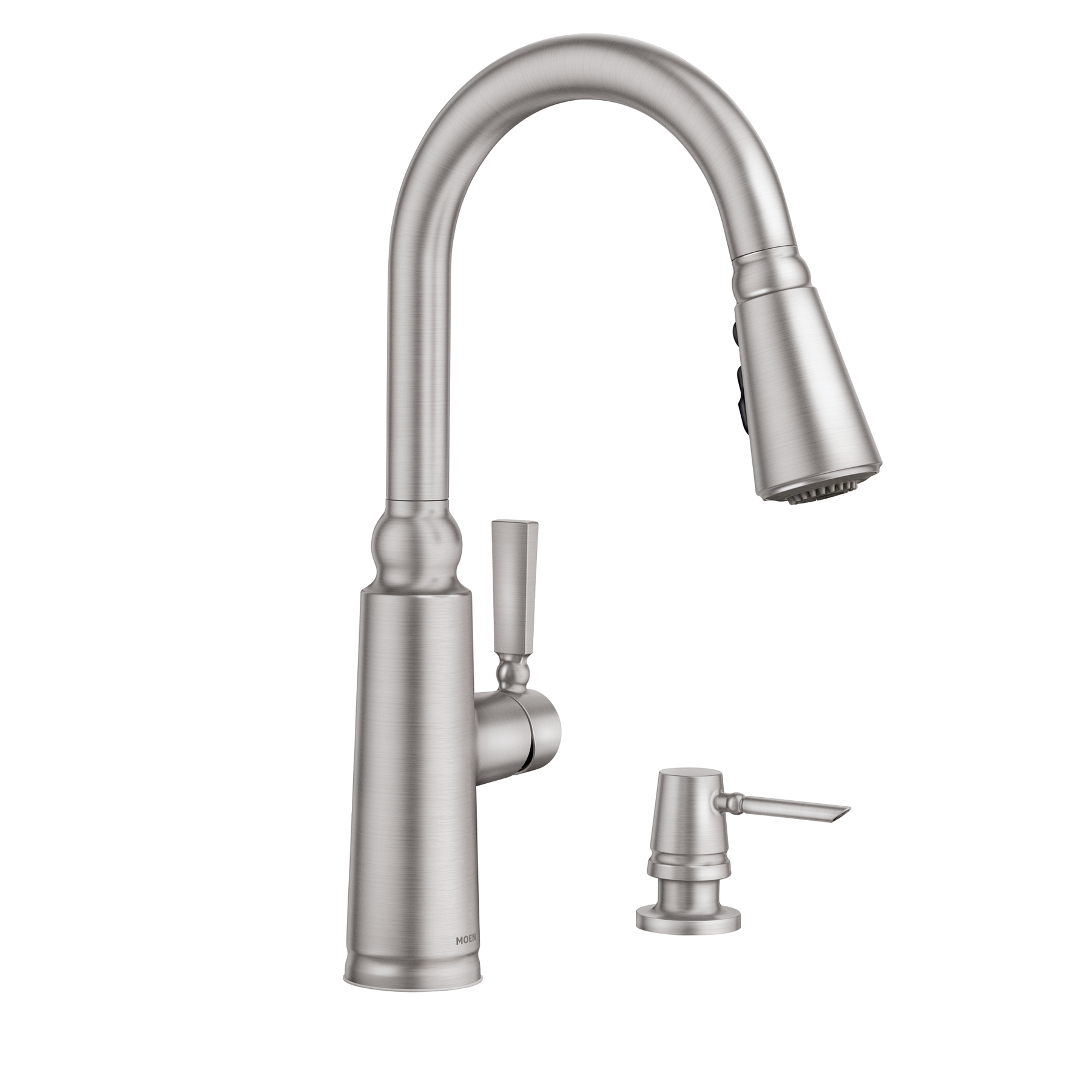 A stylish, single-handle pull-down kitchen faucet featuring Moen’s Reflex system for smooth movement and secure docking, plus Power Boost for faster cleaning and filling. Finished in Mediterranean Bronze, it includes a matching soap dispenser and installs in 1–4 hole configurations.
