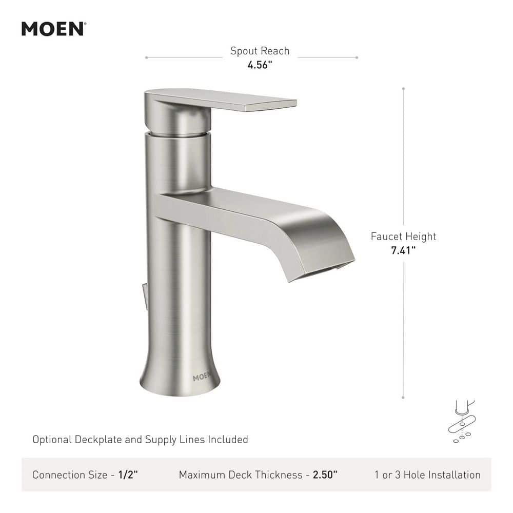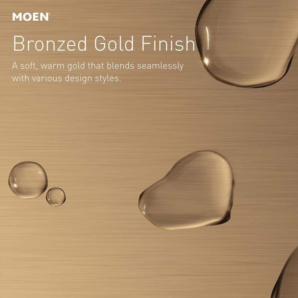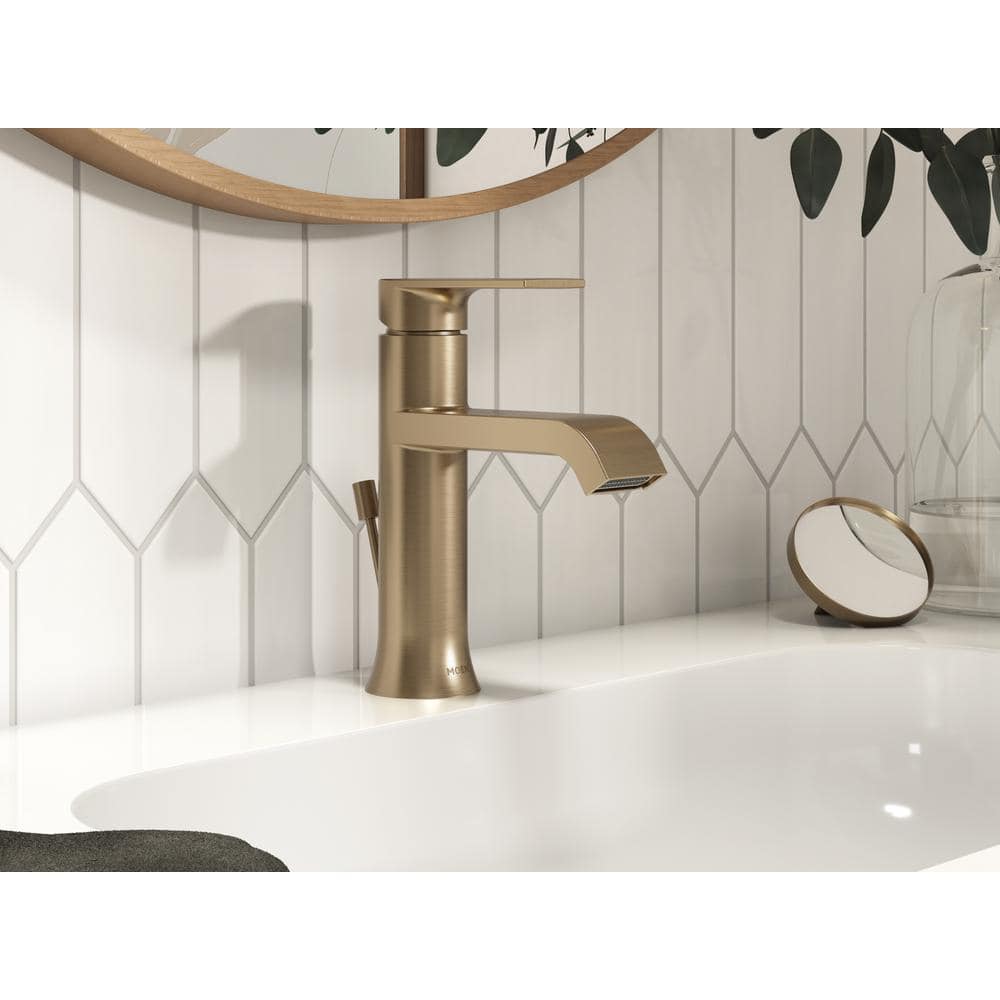 The Moen Genta single-hole bathroom faucet brings clean, modern lines and a distinctive ribbon spout to your sink. Finished in warm Bronzed Gold, each faucet delivers WaterSense-certified 1.2 GPM performance and includes an optional deck plate and drain kit for flexible installation.