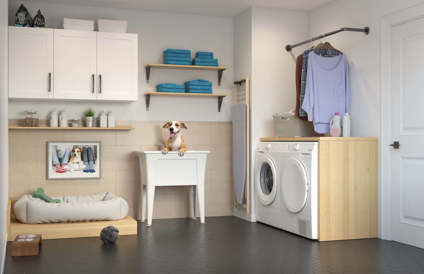 A: The large 25-gallon basin provides ample space for pet grooming, while the integrated shelves keep grooming essentials handy. The pull-out faucet offers flexibility, making pet care easier.