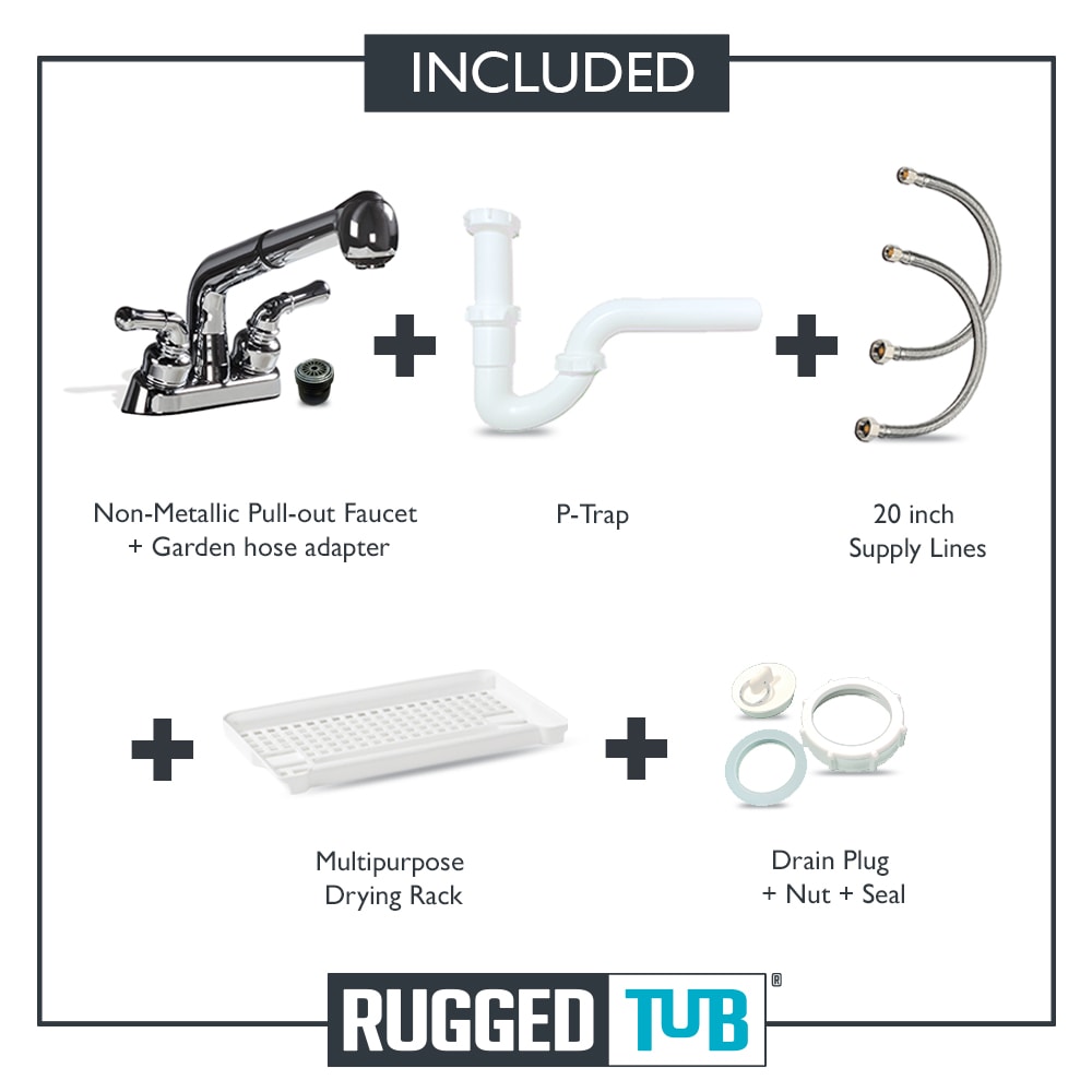 The RuggedTub Freestanding Utility Tub delivers versatility and utility in a durable, rust-proof polypropylene design. Ideal for pet grooming, laundry rooms, or garages, this roomy 25-gallon sink is equipped with a convenient pull-out faucet, adjustable legs, and space-saving features, making it a perfect addition to both professional and home use settings.