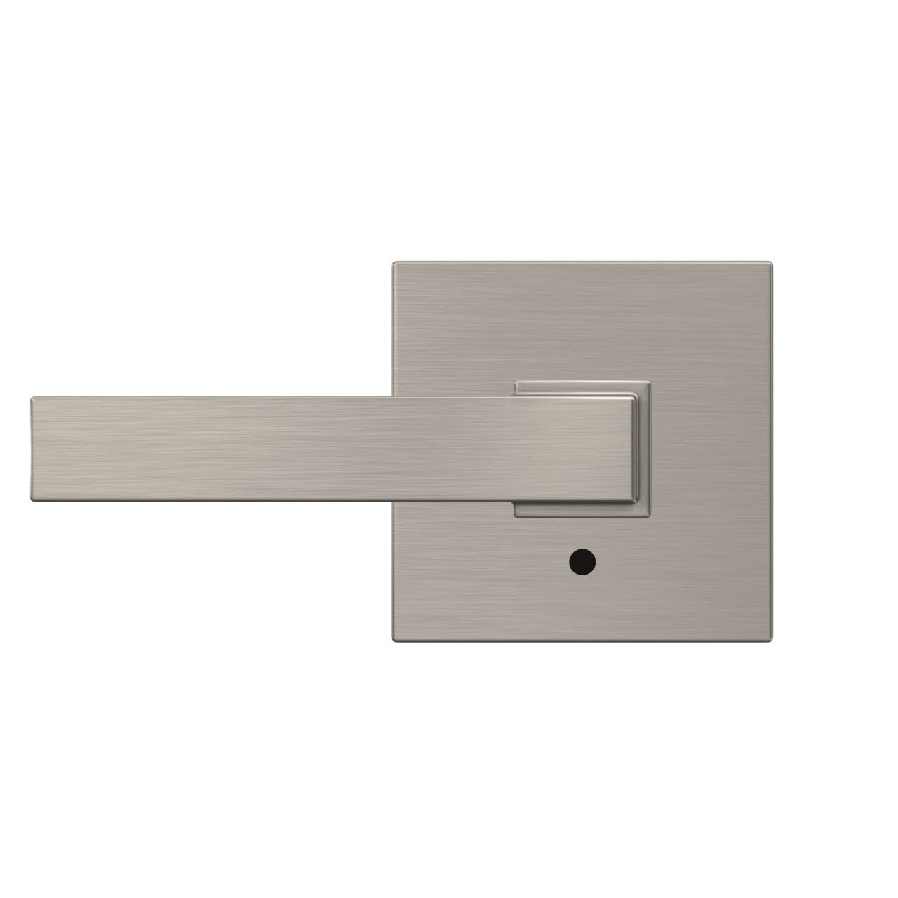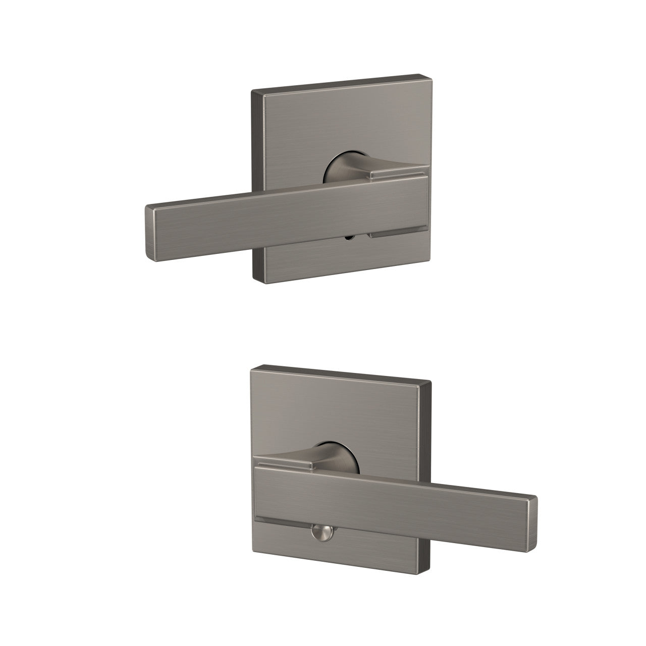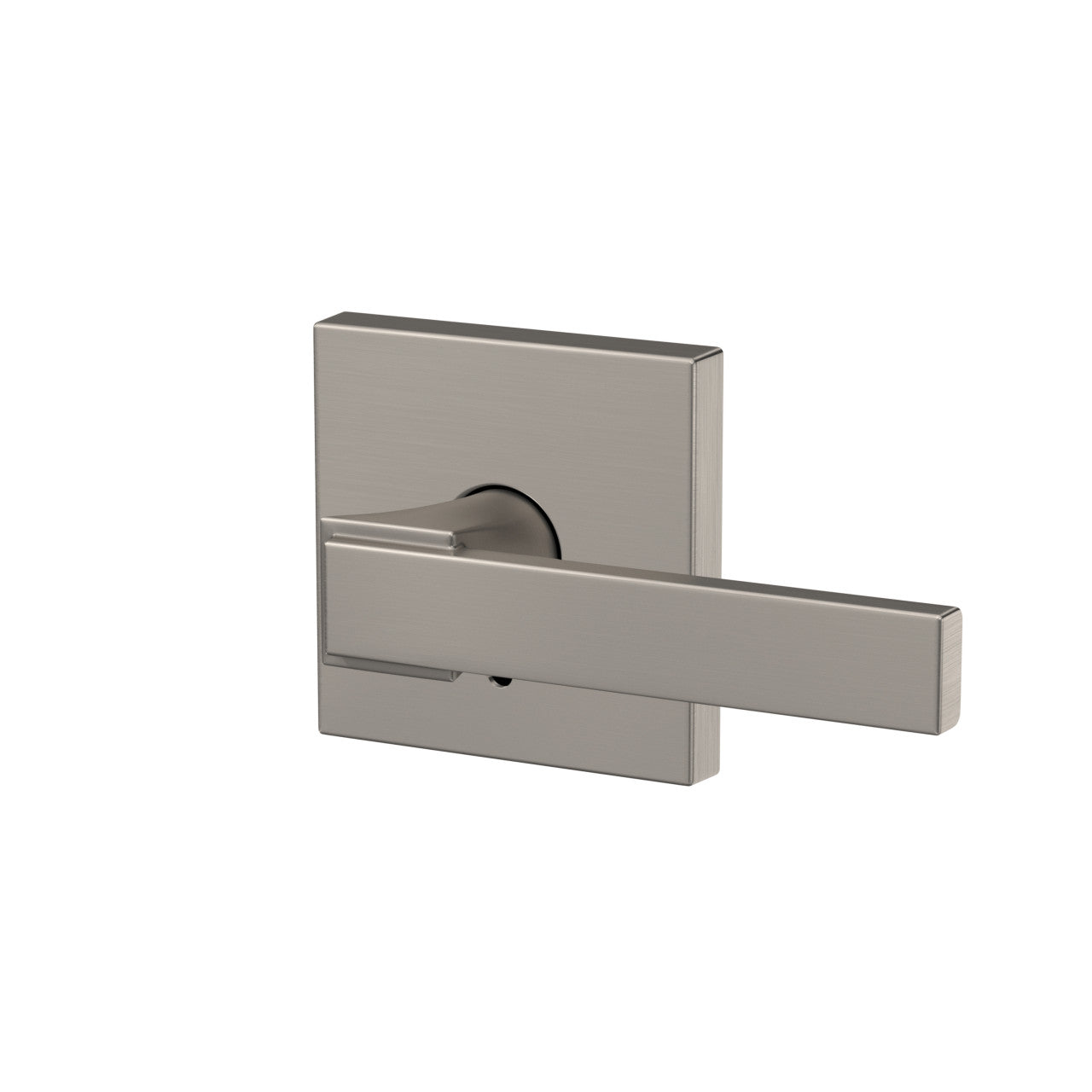 Premium Schlage Custom Northbrook lever with Collins square trim designed for combined interior use. Easily switches between passage (hall/closet) and privacy (bed/bath) with an included locking pin, featuring low-profile, concealed-screw styling and durable metal construction.