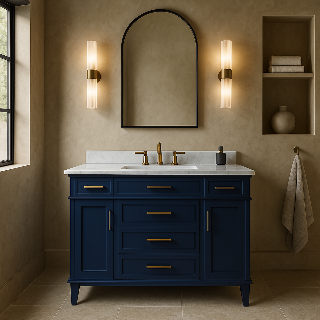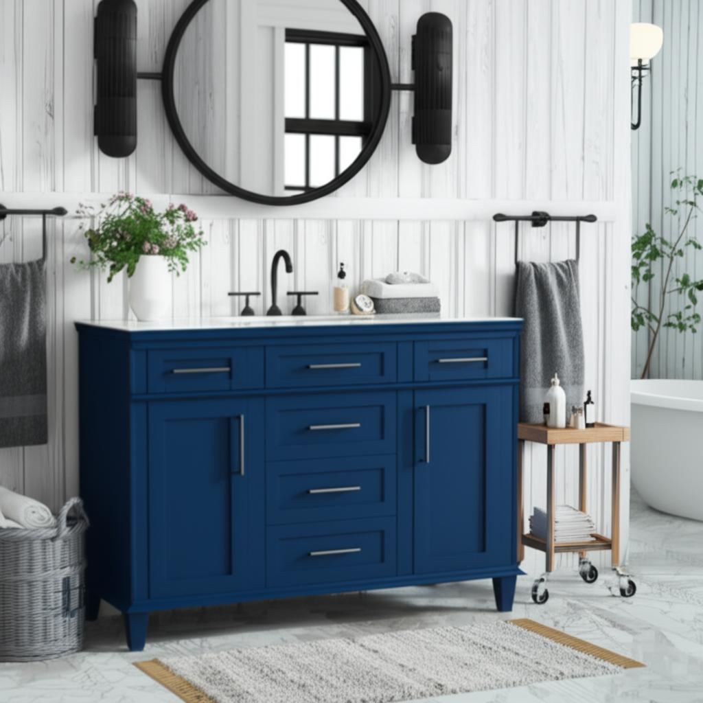 The Sonoma 48-inch bathroom vanity combines modern design with practical functionality. Featuring a Midnight Blue finish and a Carrara Marble top, it offers ample storage with soft-close drawers and doors, making it a perfect addition to any bathroom.
