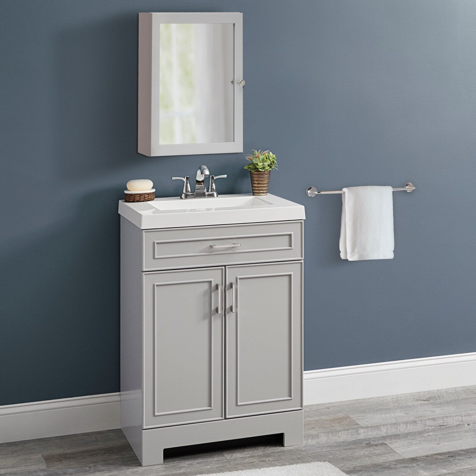 Enhance your bathroom with the Style Selections 19.63-in x 23.7-in Surface Mount Gray Mirrored Medicine Cabinet. This stylish, gray-finished cabinet is designed for quick installation with a fully assembled structure. With its versatile design and adjustable shelves, it offers functional and flexible storage options.