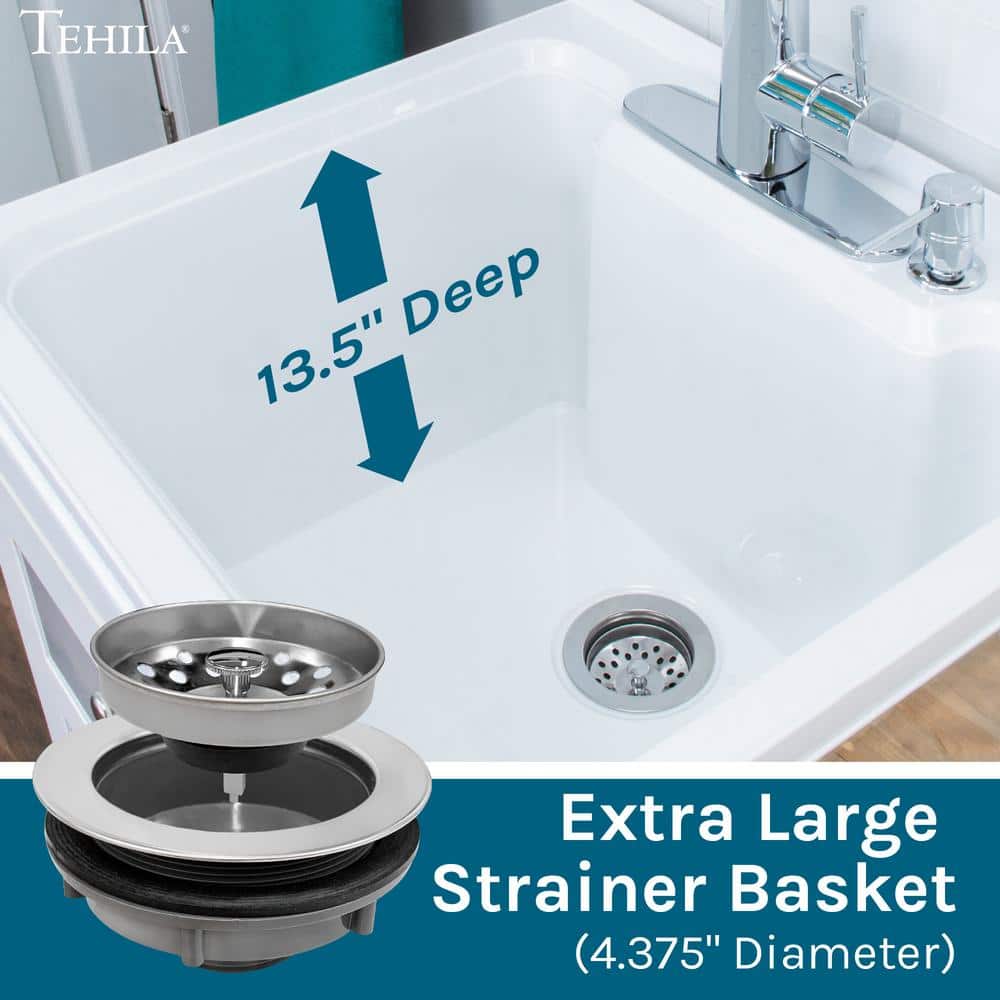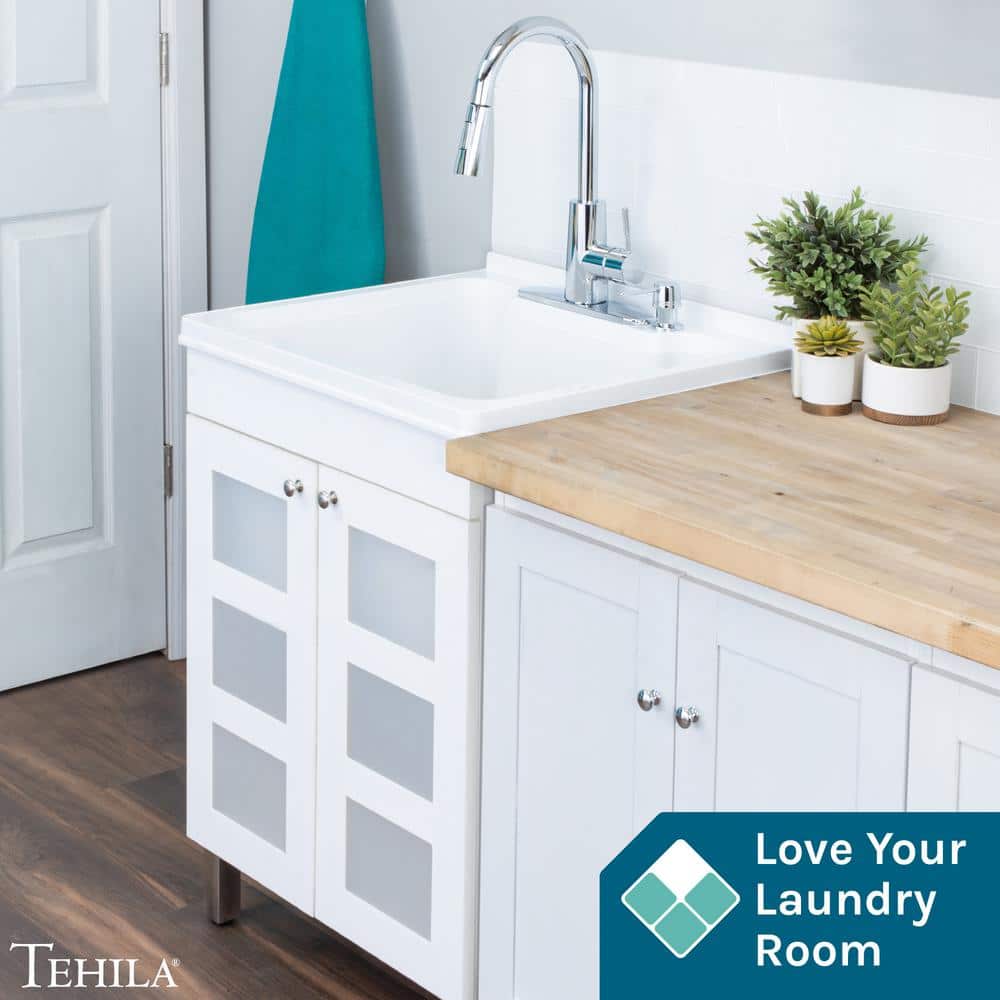TEHILA 18 Gallon Thermoplastic Freestanding Laundry Sink with Chrome Faucet and White Cabinet