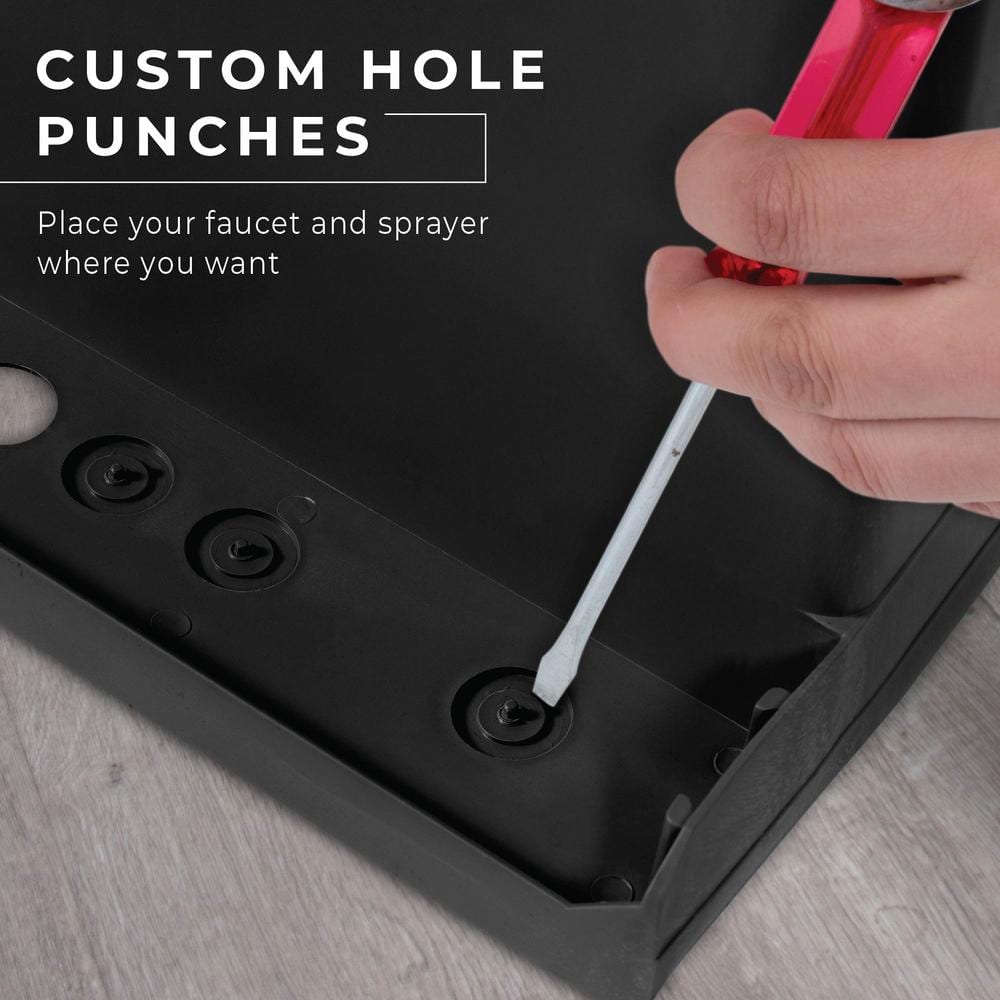 A: The sink is made from high-quality thermoplastic, which is durable and resistant to cracking and rust. The faucet is a high-arc model with a matte black finish made from metal with integrated supply lines.