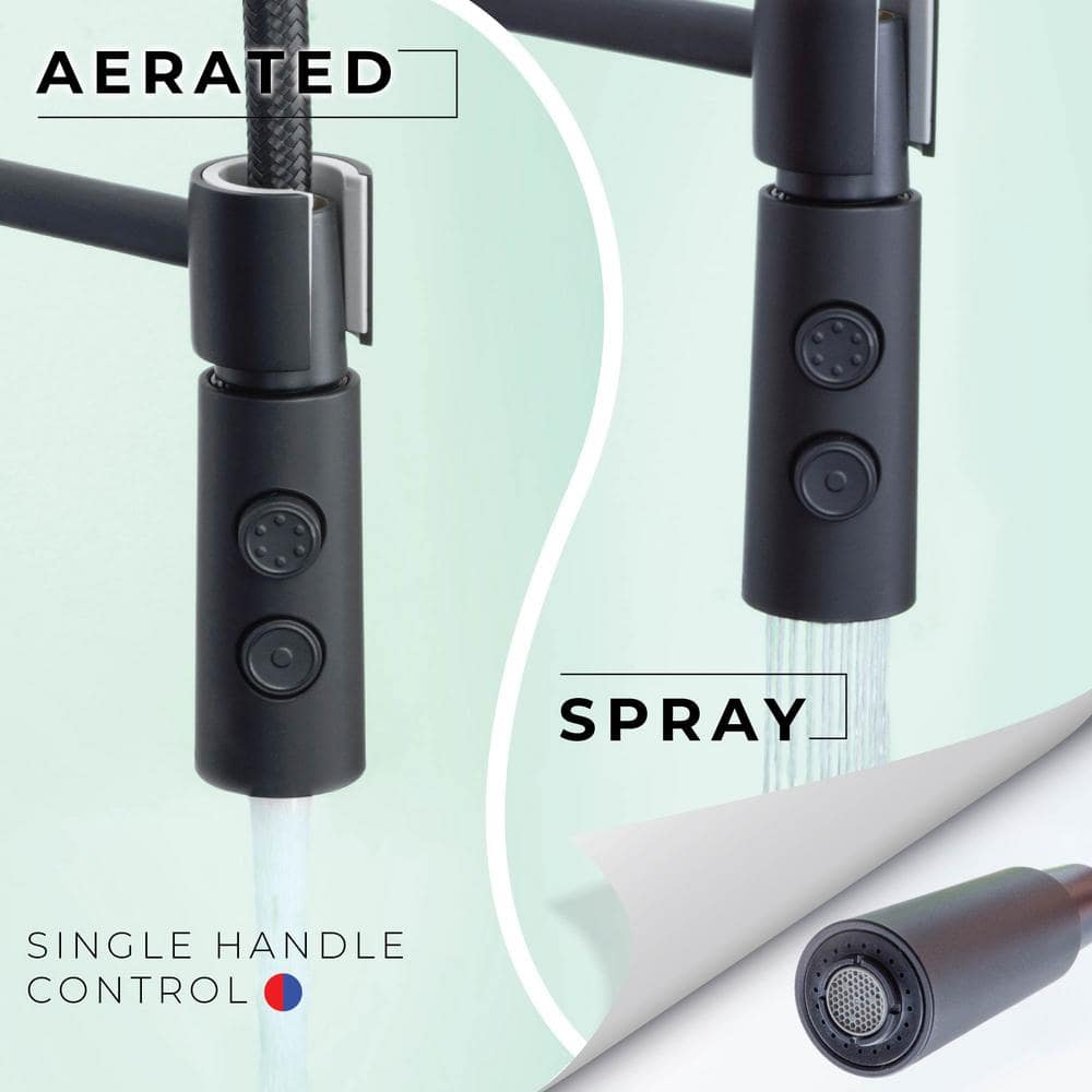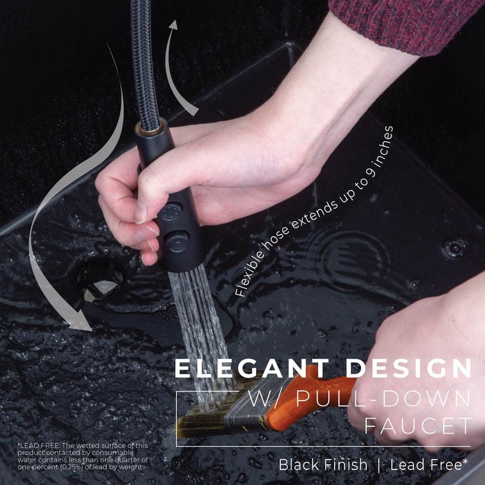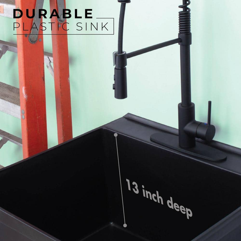 • Enhanced Utility: Black utility sink with a high-arc matte black coil pull-down faucet for versatile use.