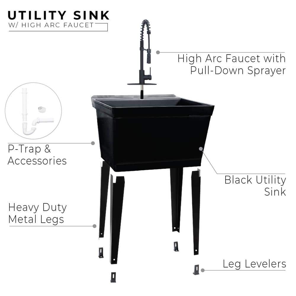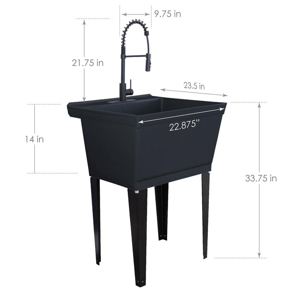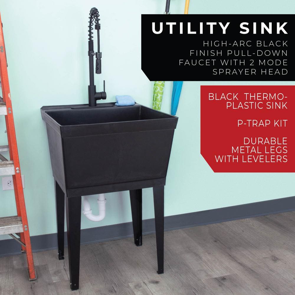 Enhance your utility space with the TEHILA Black Thermoplastic Floor-Mount Utility Sink. Featuring a high-arc matte black coil pull-down faucet, this freestanding sink is perfect for handling large, bulky items thanks to its extra-deep 19-gallon capacity and high-quality thermoplastic construction.