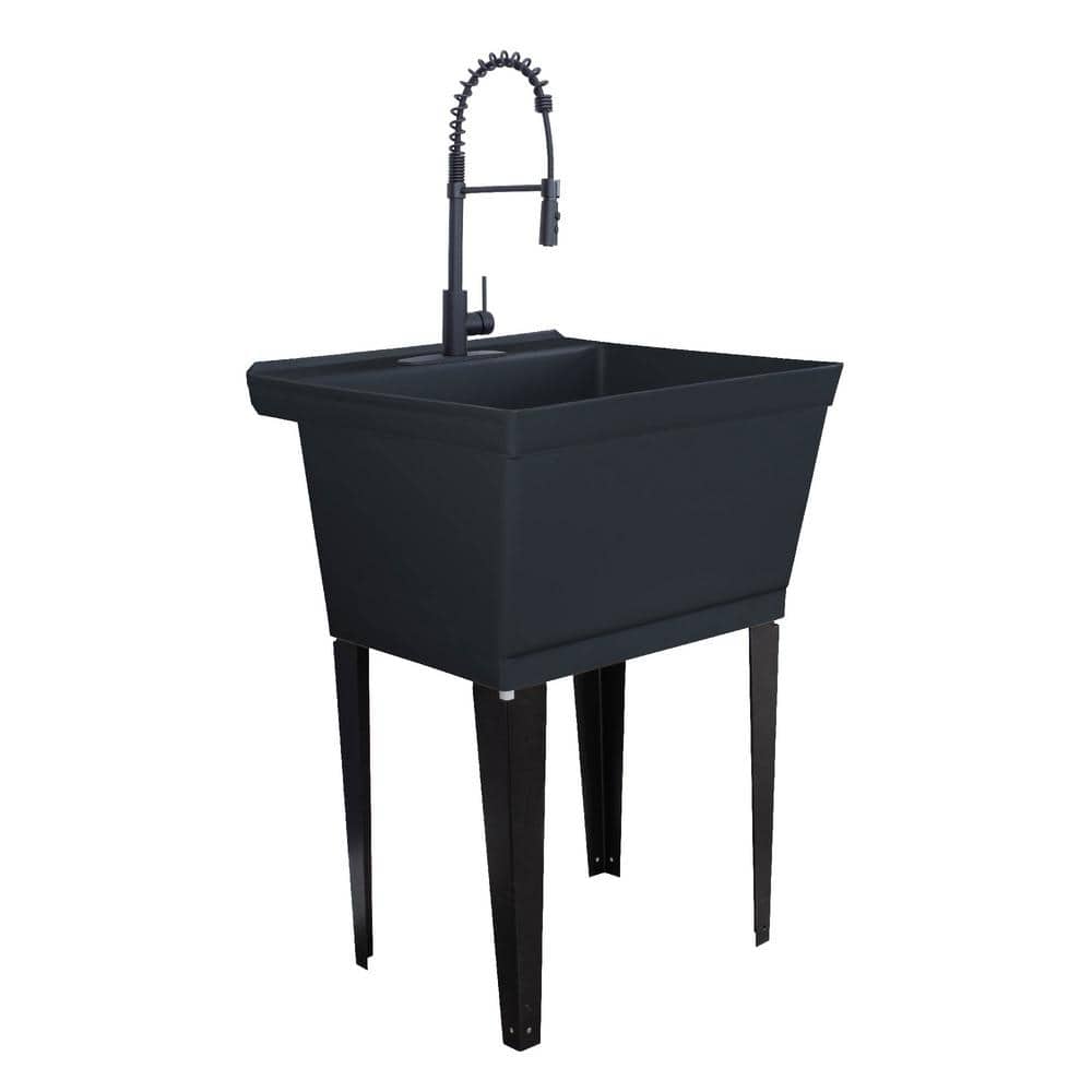 TEHILA Black Thermoplastic Floor-Mount Utility Sink with High-Arc Matte Black Coil Pull-Down Faucet