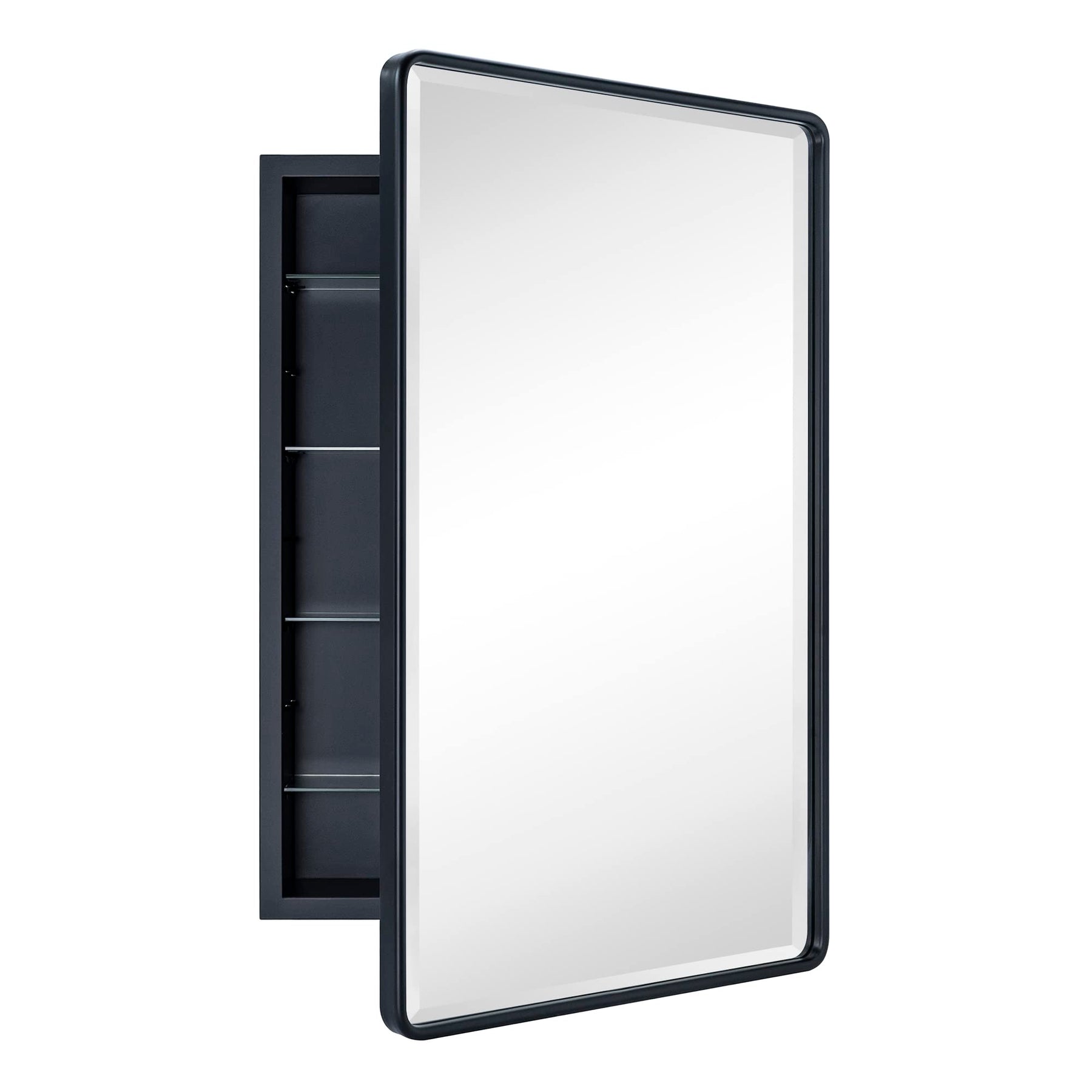 Elevate your bathroom style with the TEHOME Recessed Matte Black Medicine Cabinet. This sleek and elegant piece features a premium aluminum door framed with a beveled mirror, offering a touch of luxury and practicality with additional storage. Designed for both function and flair, it seamlessly integrates into your wall for a polished, minimalist look.