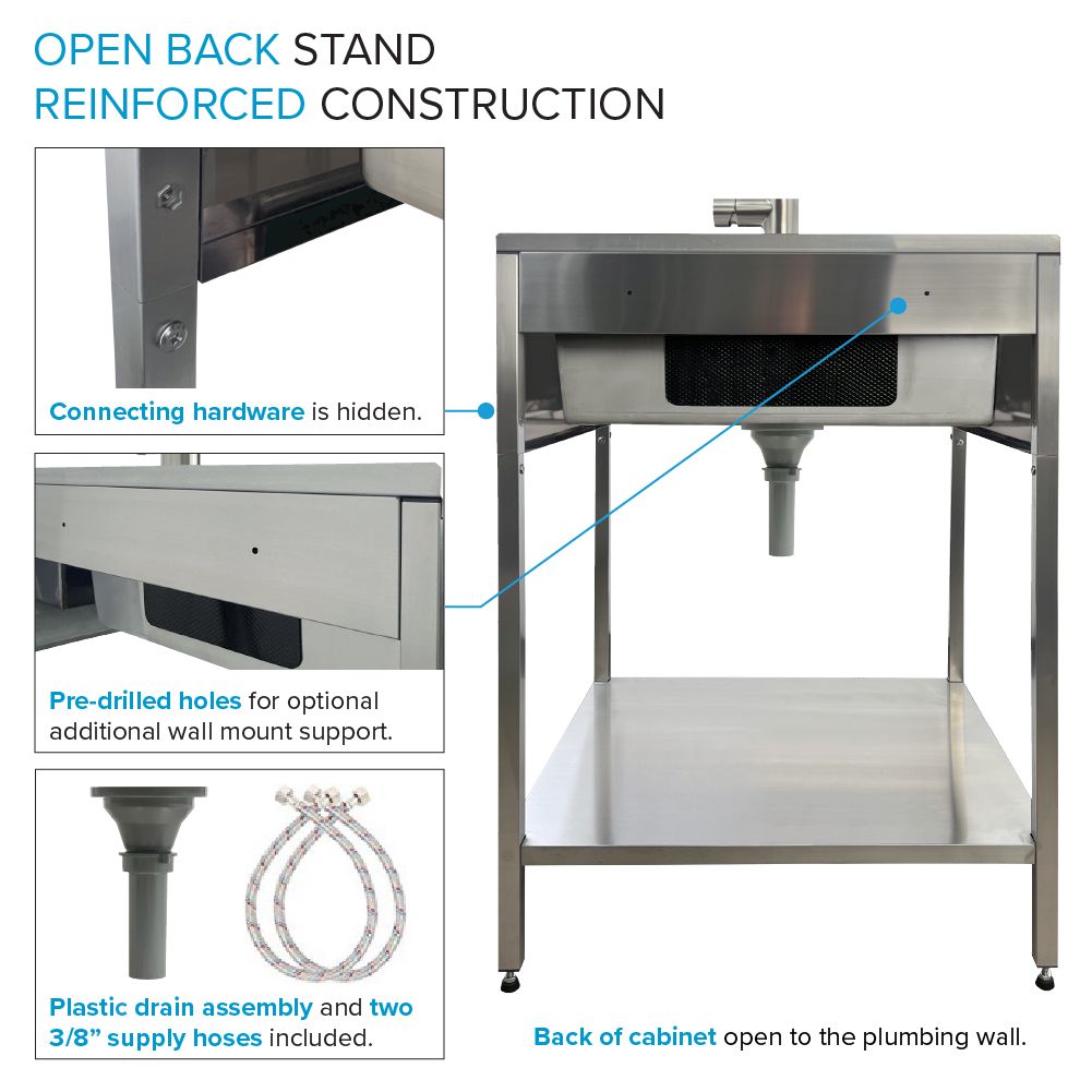 The Transolid Freestanding Laundry Sink combines functionality and style, featuring a compact 18-gauge stainless steel basin ideal for laundry rooms and studios. This versatile piece is designed for both indoor and outdoor use, with a dual-spray faucet for diverse cleaning needs and a sturdy washstand for added storage.