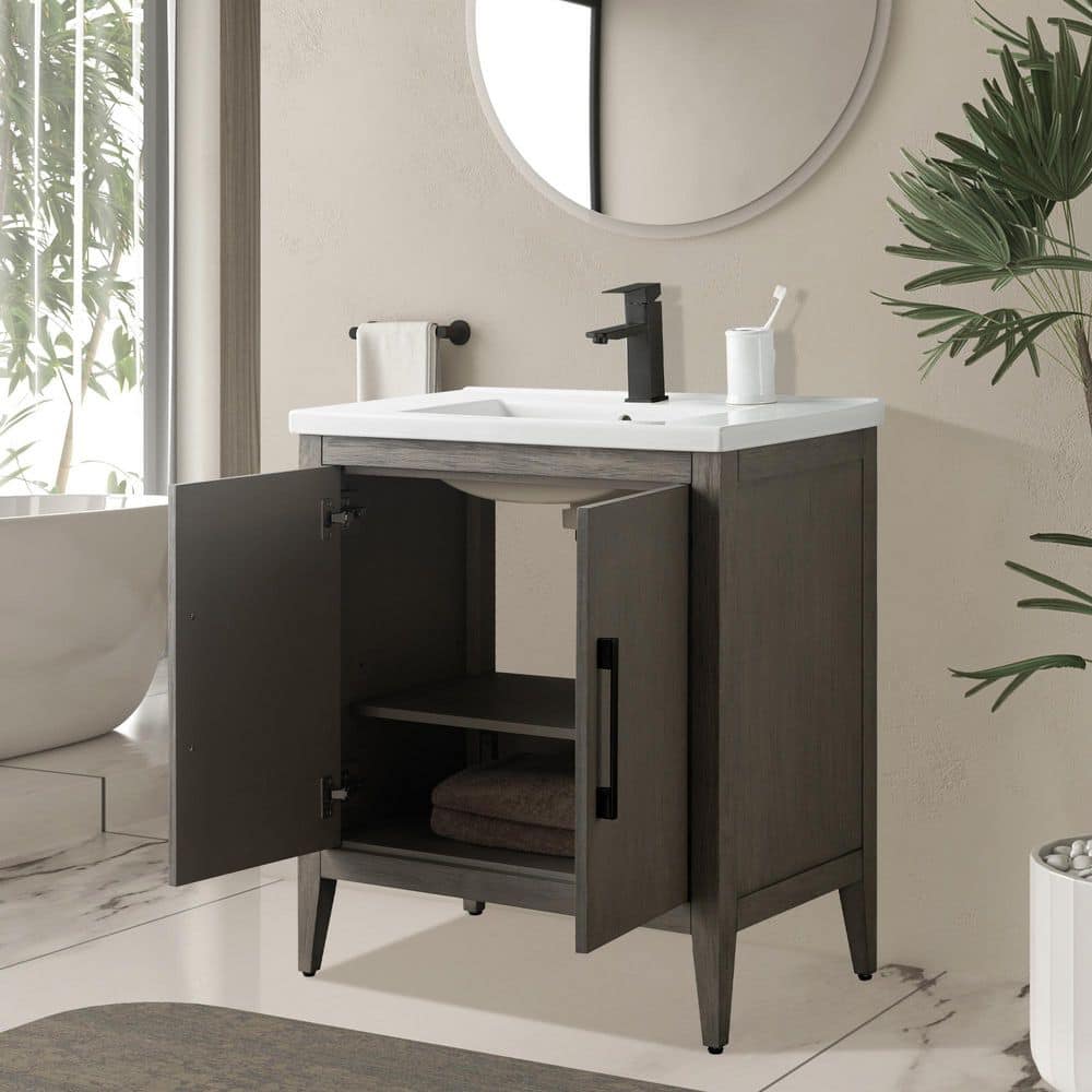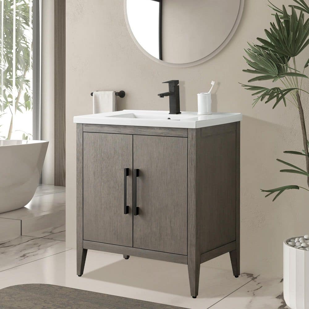 A fully assembled 30-inch freestanding vanity that blends driftwood gray cabinetry with a crisp white ceramic top and rectangular undermount sink. Built from MDF with soft-close doors and adjustable shelving, it offers durable construction and organized storage for compact baths.