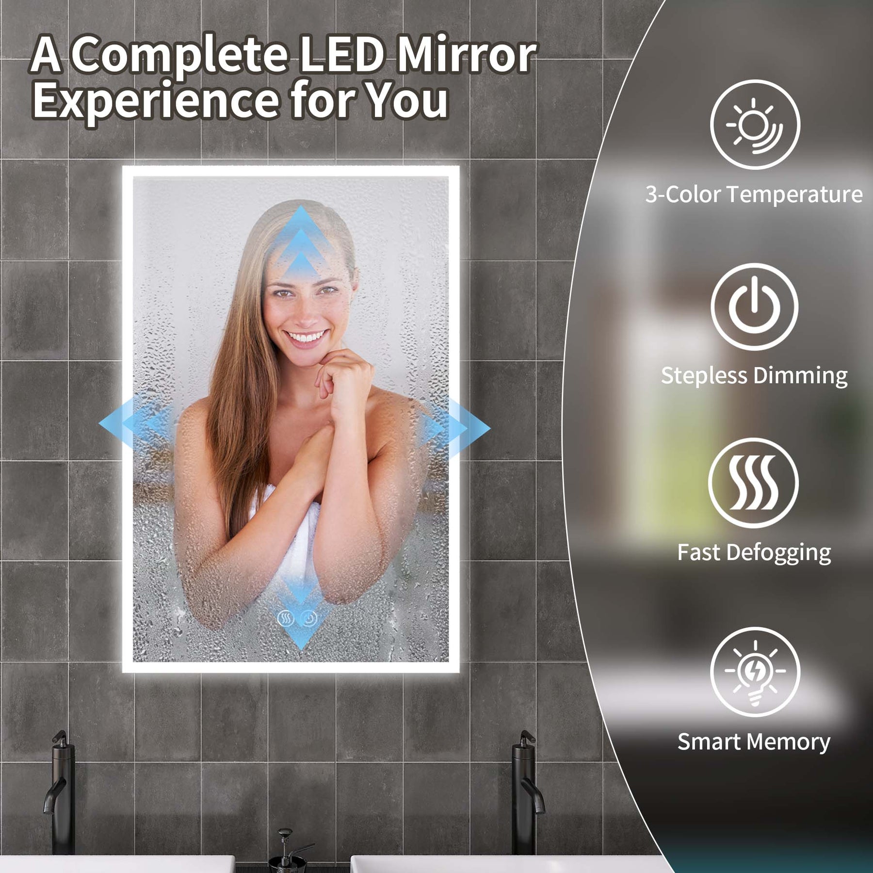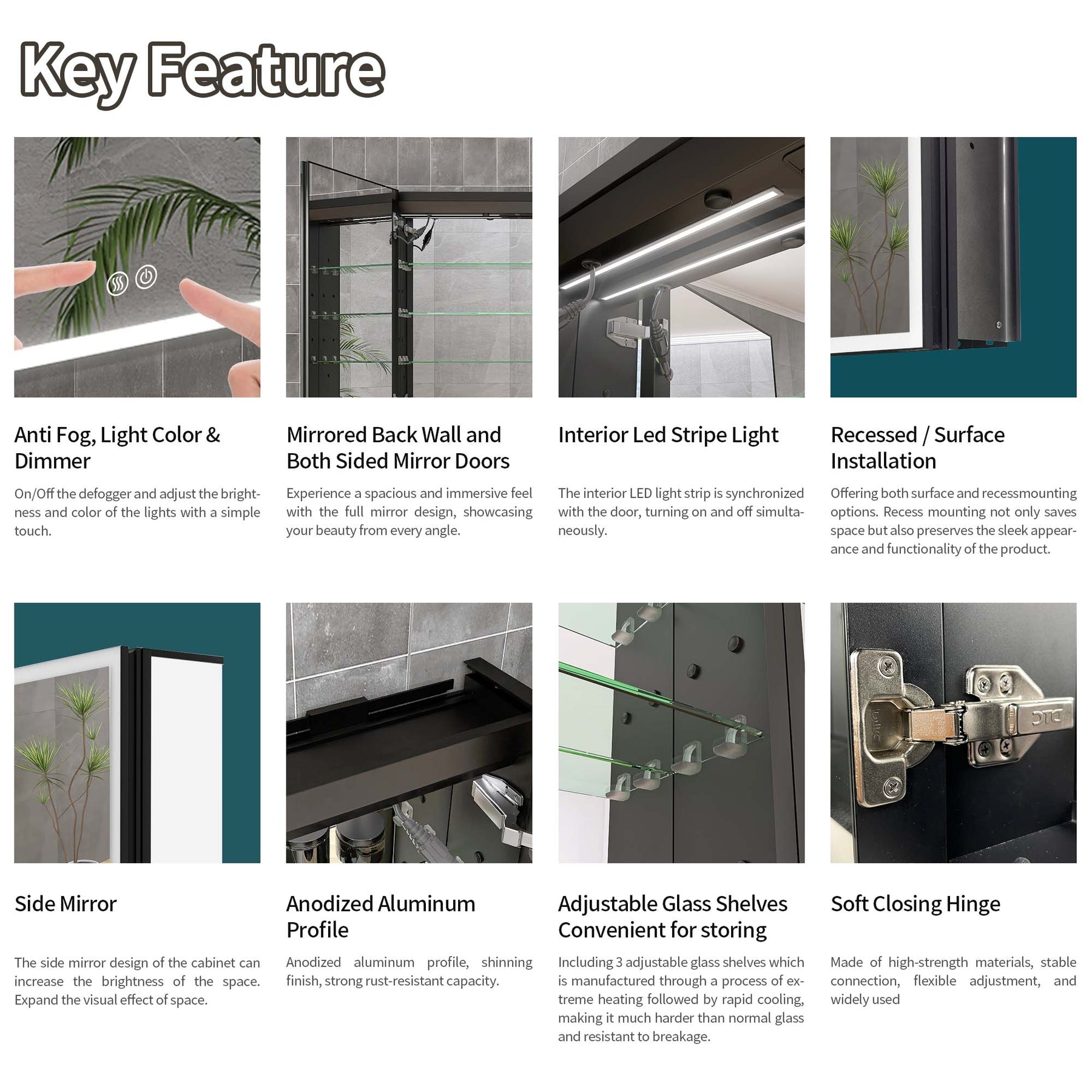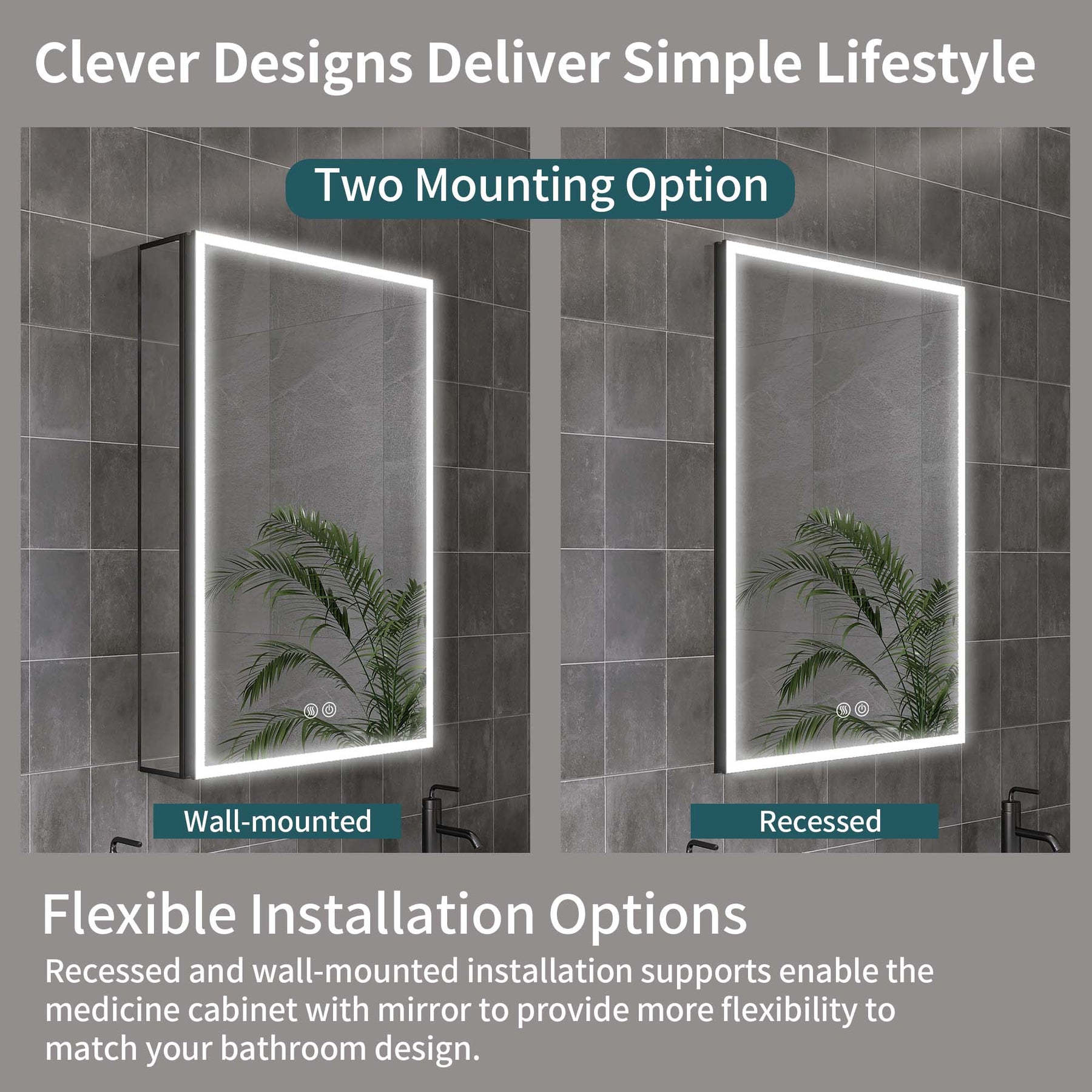 Upgrade your bathroom with the WELLFOR Lighted LED Fog-Free Medicine Cabinet, featuring an anti-fog mirror, convenient electrical outlet, and soft-close doors. Made from high-quality rustproof aluminum, this elegantly designed cabinet offers versatile mounting options to fit any space.
