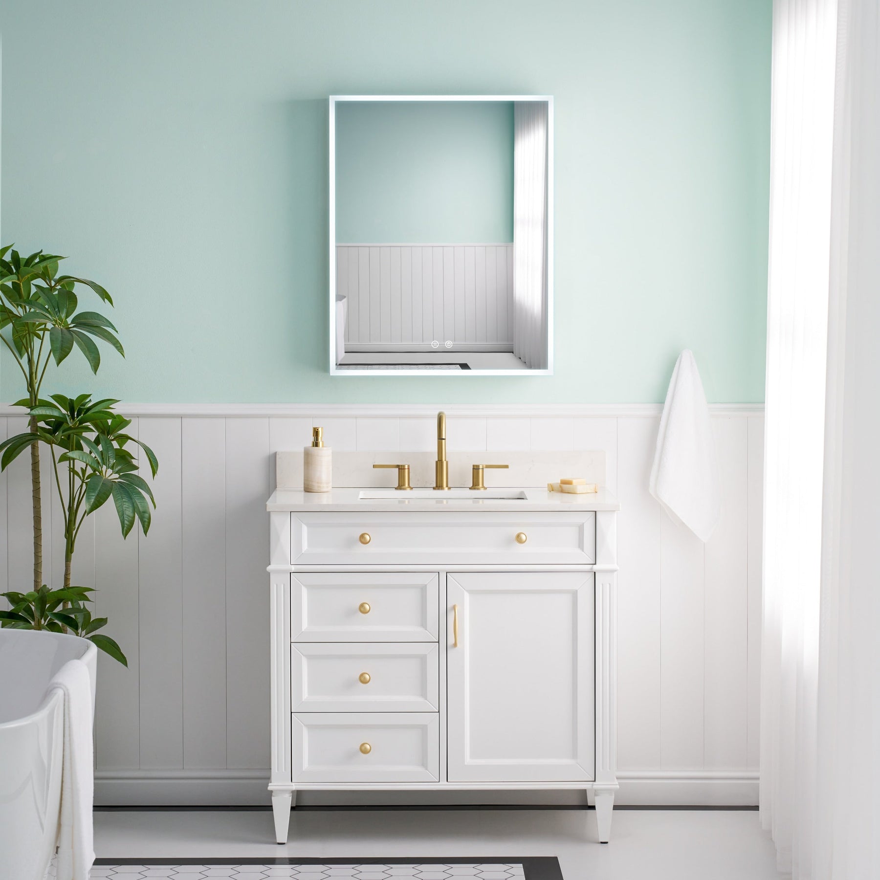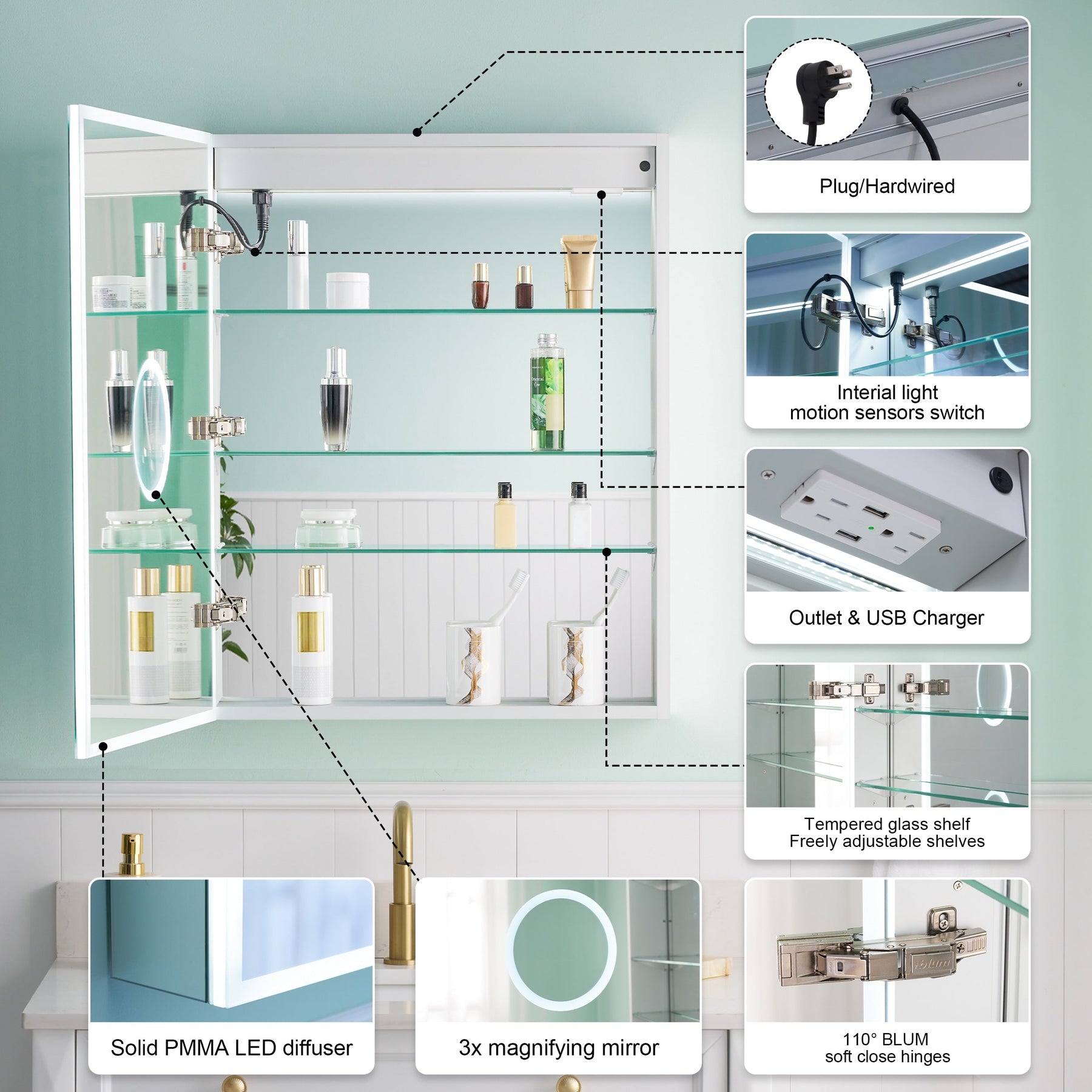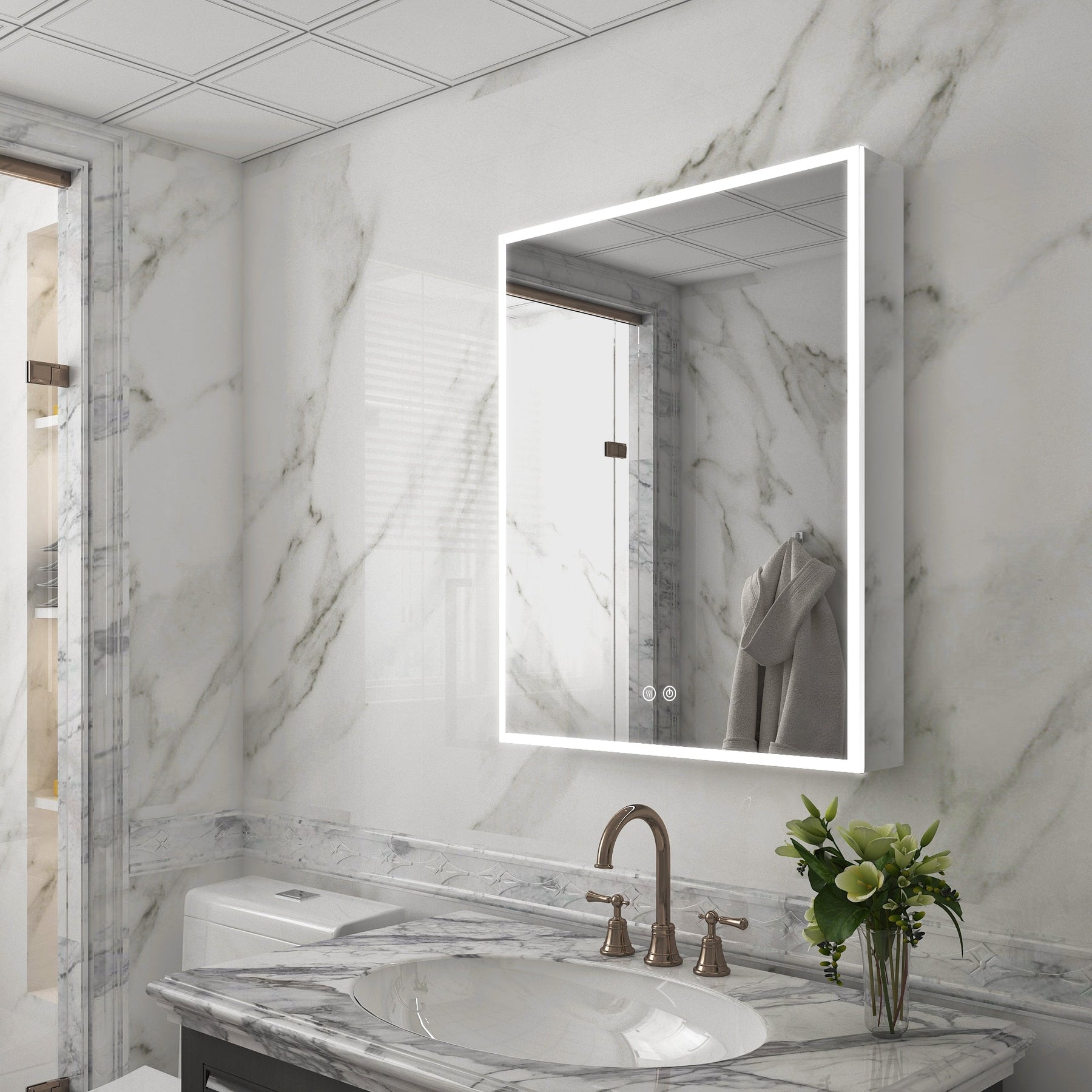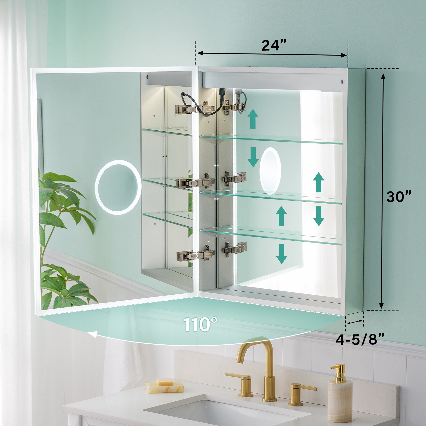 Illuminate your bathroom with the WELLFOR ELIN 24" x 30" Medicine Cabinet, featuring LED lighting, fog-free technology, and soft-close doors. Designed for versatility, it offers both surface and recessed mounting options, complete with a built-in outlet for all your grooming essentials.