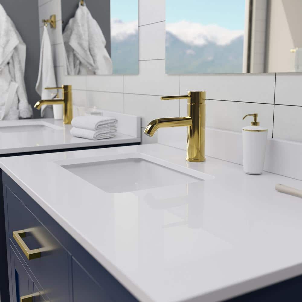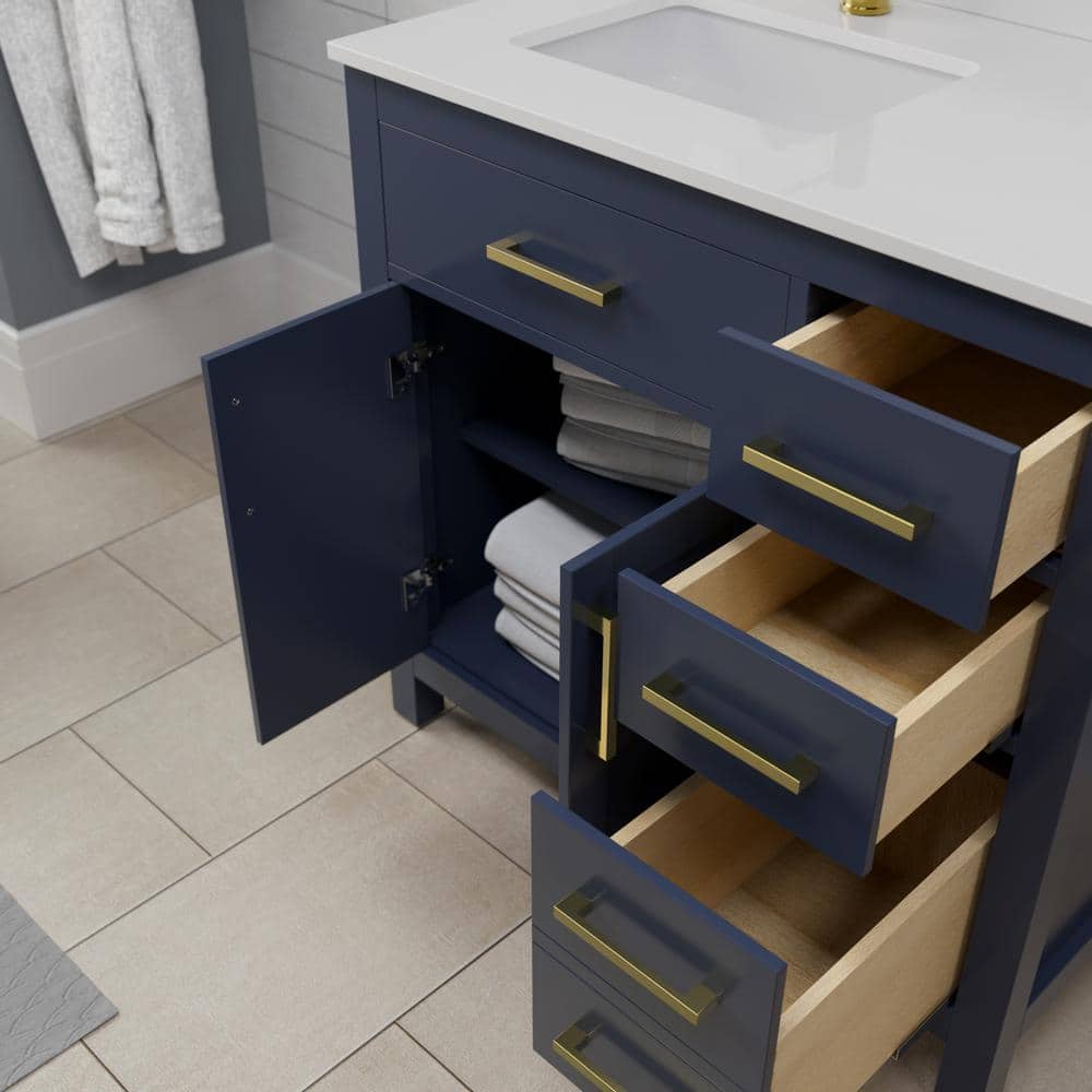 - Elegant Design: Dark blue cabinet with brushed gold trim and white cultured marble top.
