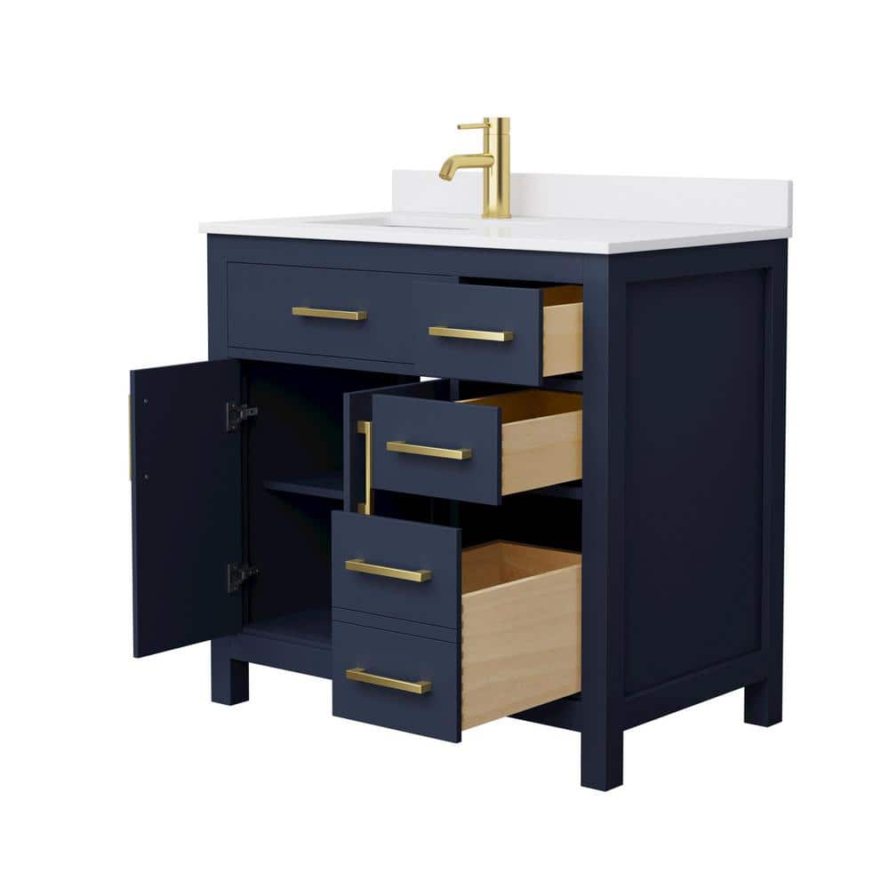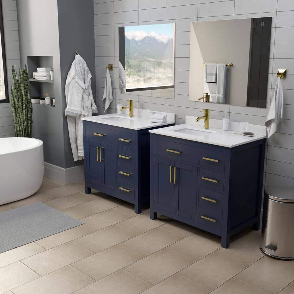 The Beckett 36" Single Sink Bathroom Vanity combines elegant design with practical functionality. Featuring a dark blue cabinet with brushed gold trim and a white cultured marble top, it offers ample storage and a durable construction. Perfect for enhancing any bathroom space.