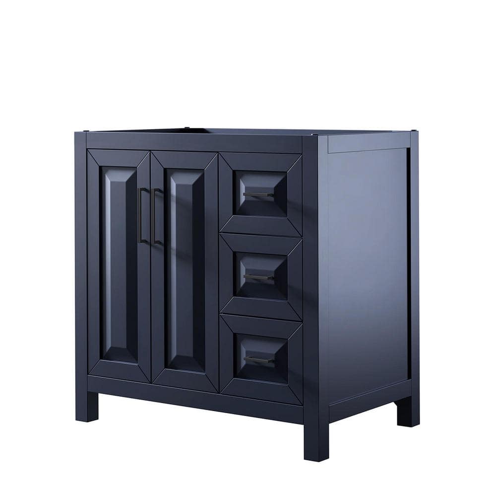 The Wyndham Collection Daria vanity cabinet offers a stylish and functional solution for your bathroom. With its dark blue finish, ample storage, and soft-close features, it combines elegance with practicality.