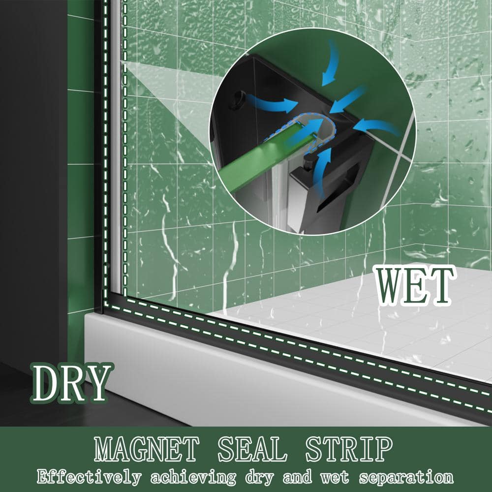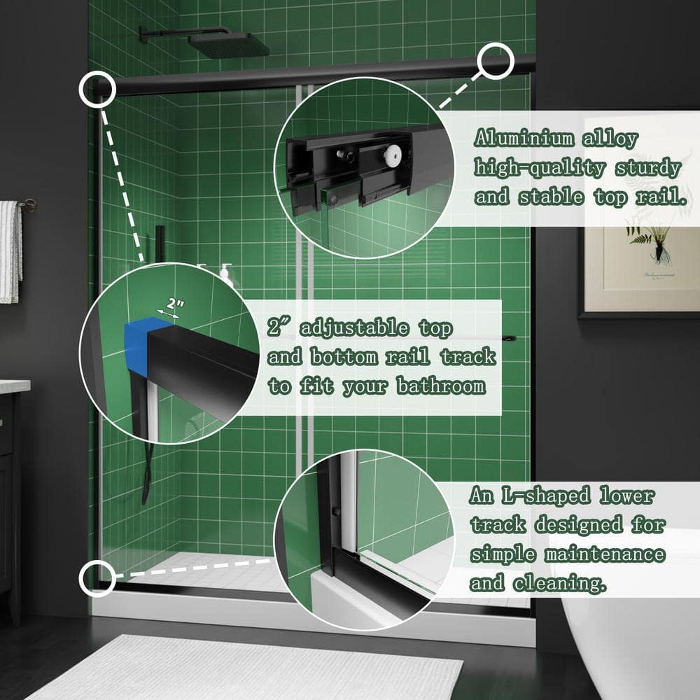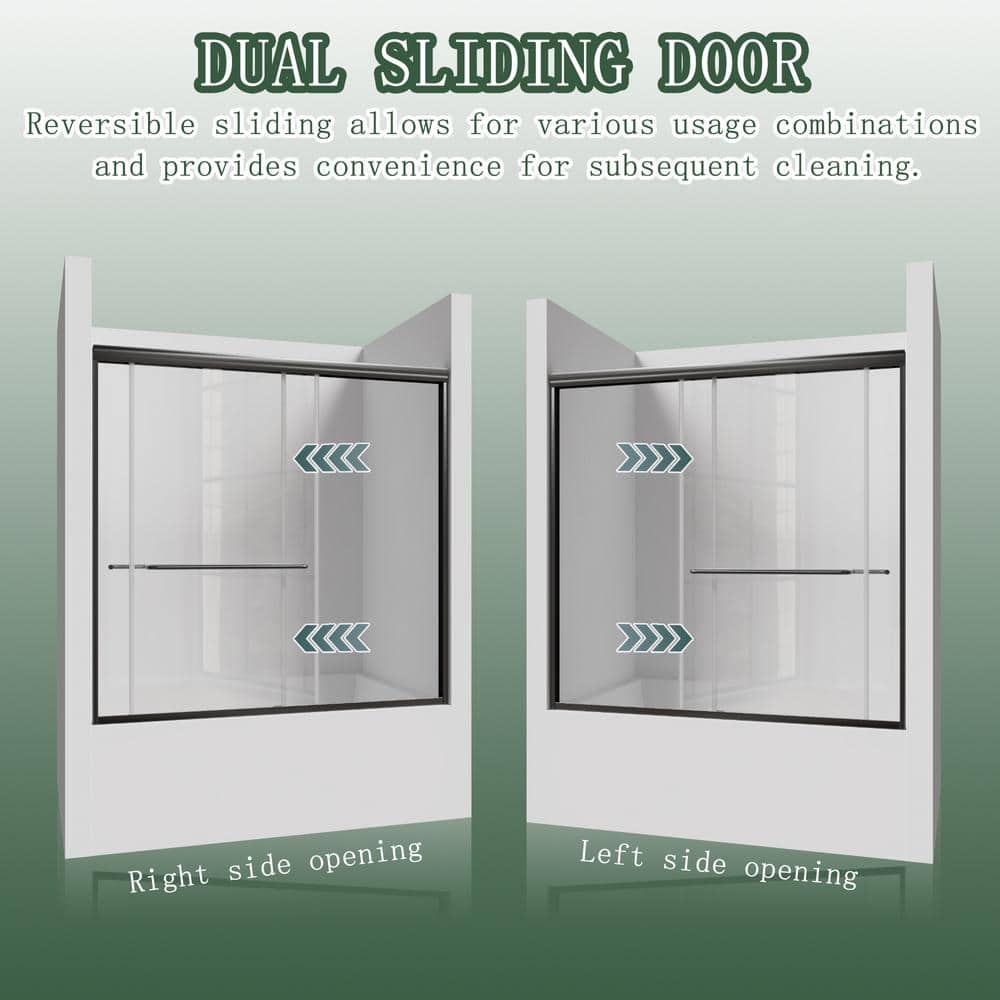 Enhance your bathroom with the Wynnt Semi Frameless Sliding Bathtub Shower Door, combining sleek modern design with top-notch functionality. Featuring premium 1/4-inch tempered glass and a sophisticated black finish, this door's reversible, dual sliding design offers easy access and efficient use of space.