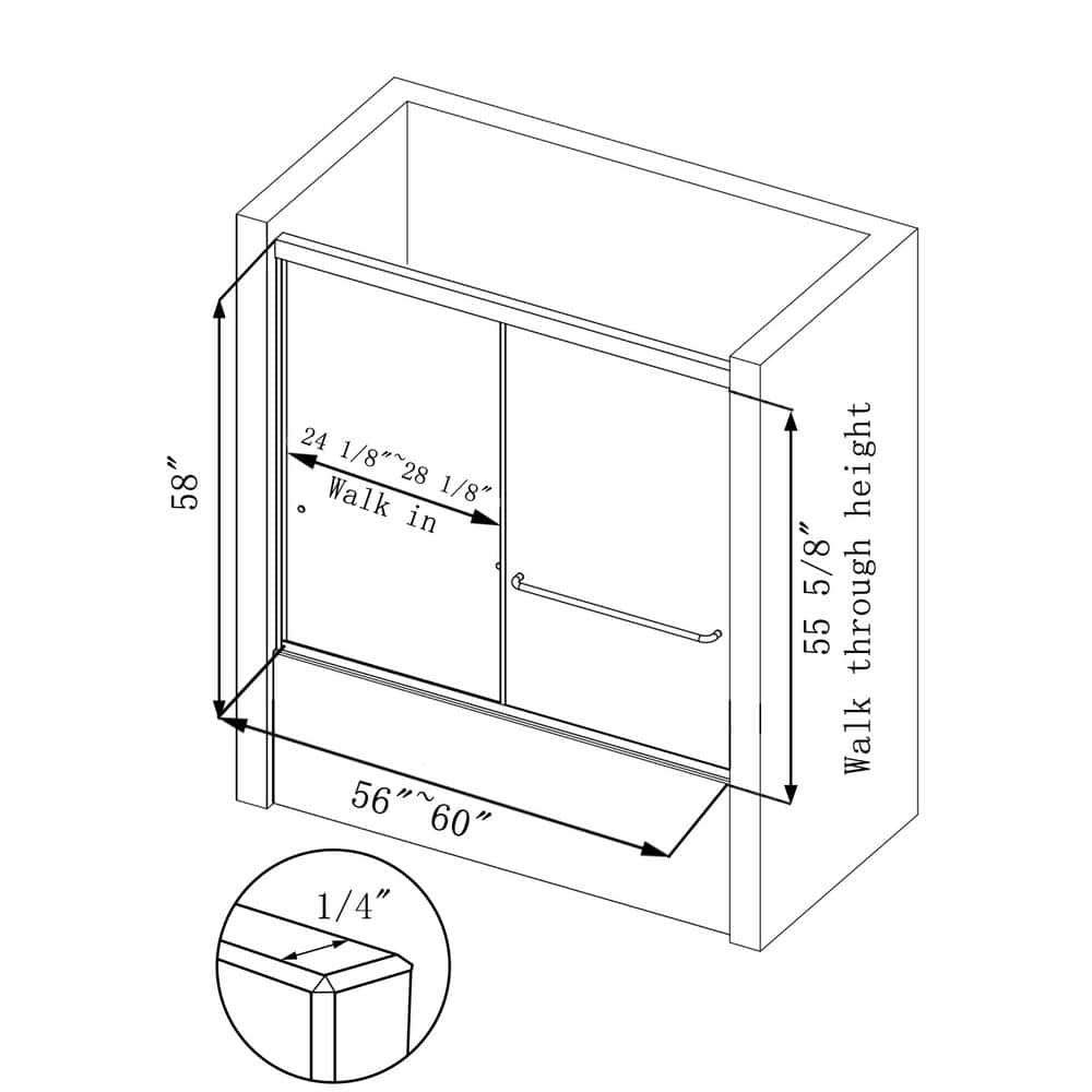 A: The shower door is adjustable and can fit widths between 56 to 60 inches.