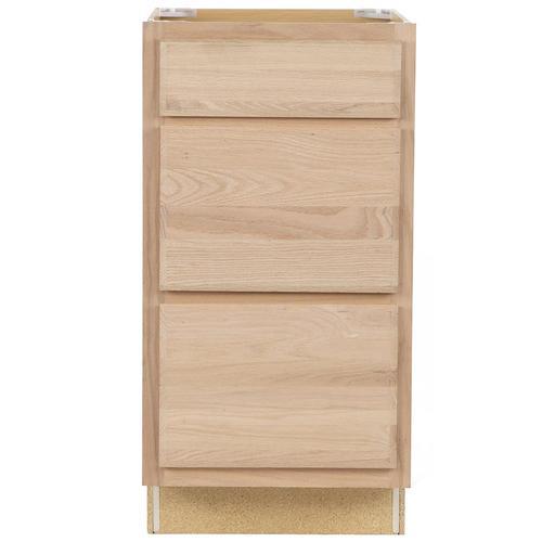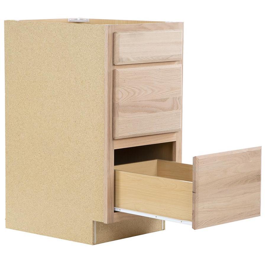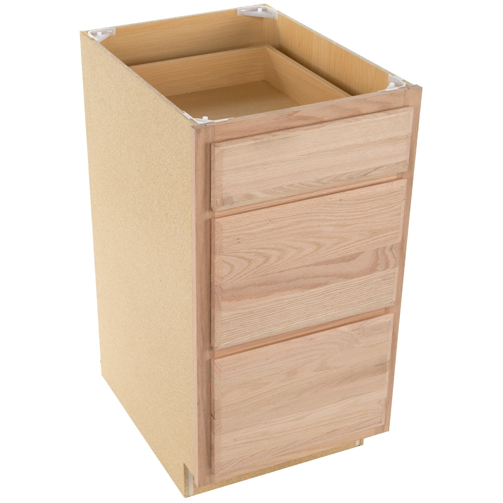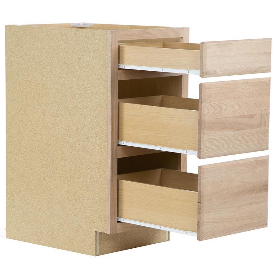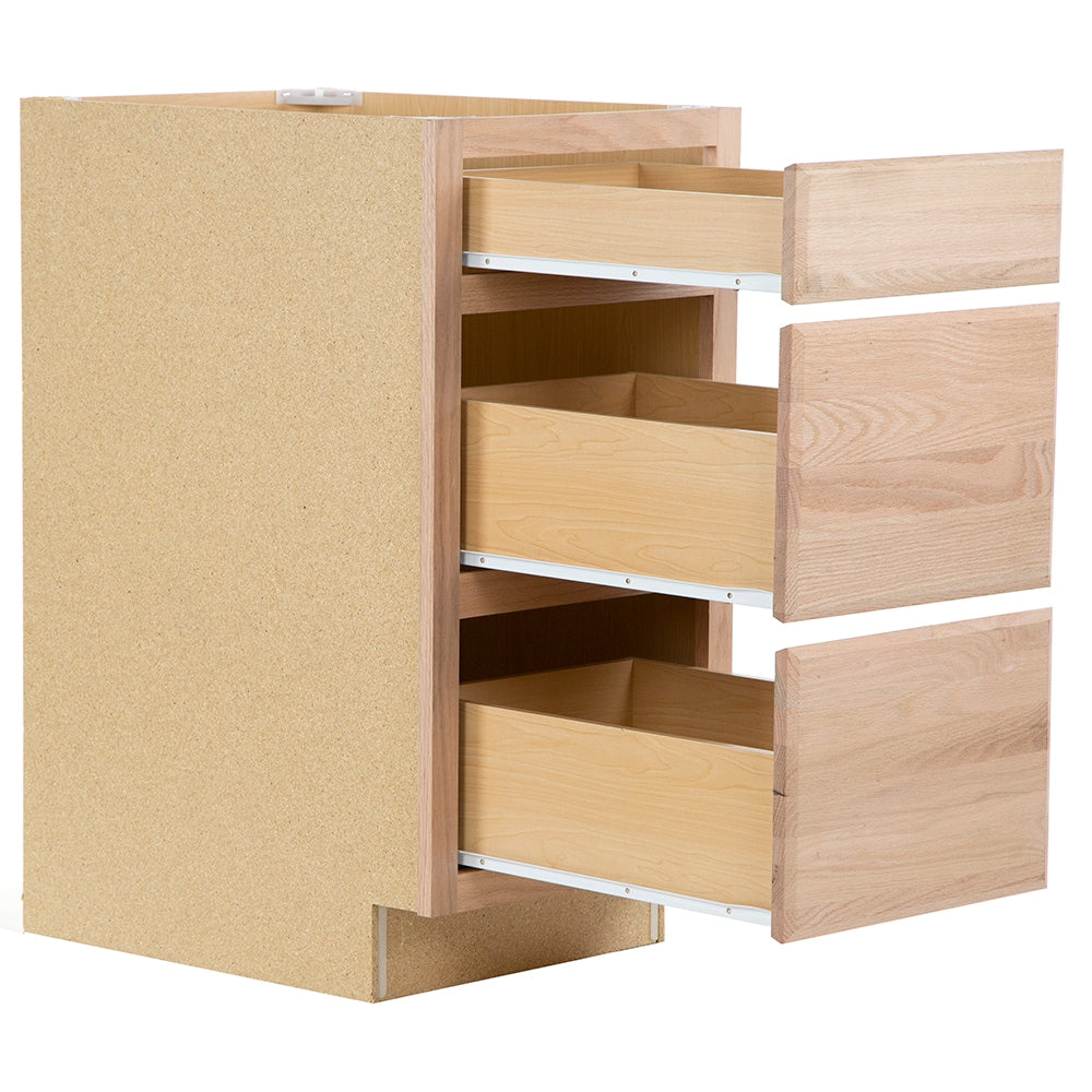 Unfinished oak 3-drawer cabinet bank designed for custom bathroom or utility configurations. The Ready to Finish unit features a solid hardwood face frame and slab drawer fronts, arriving fully assembled for quick, freestanding installation.