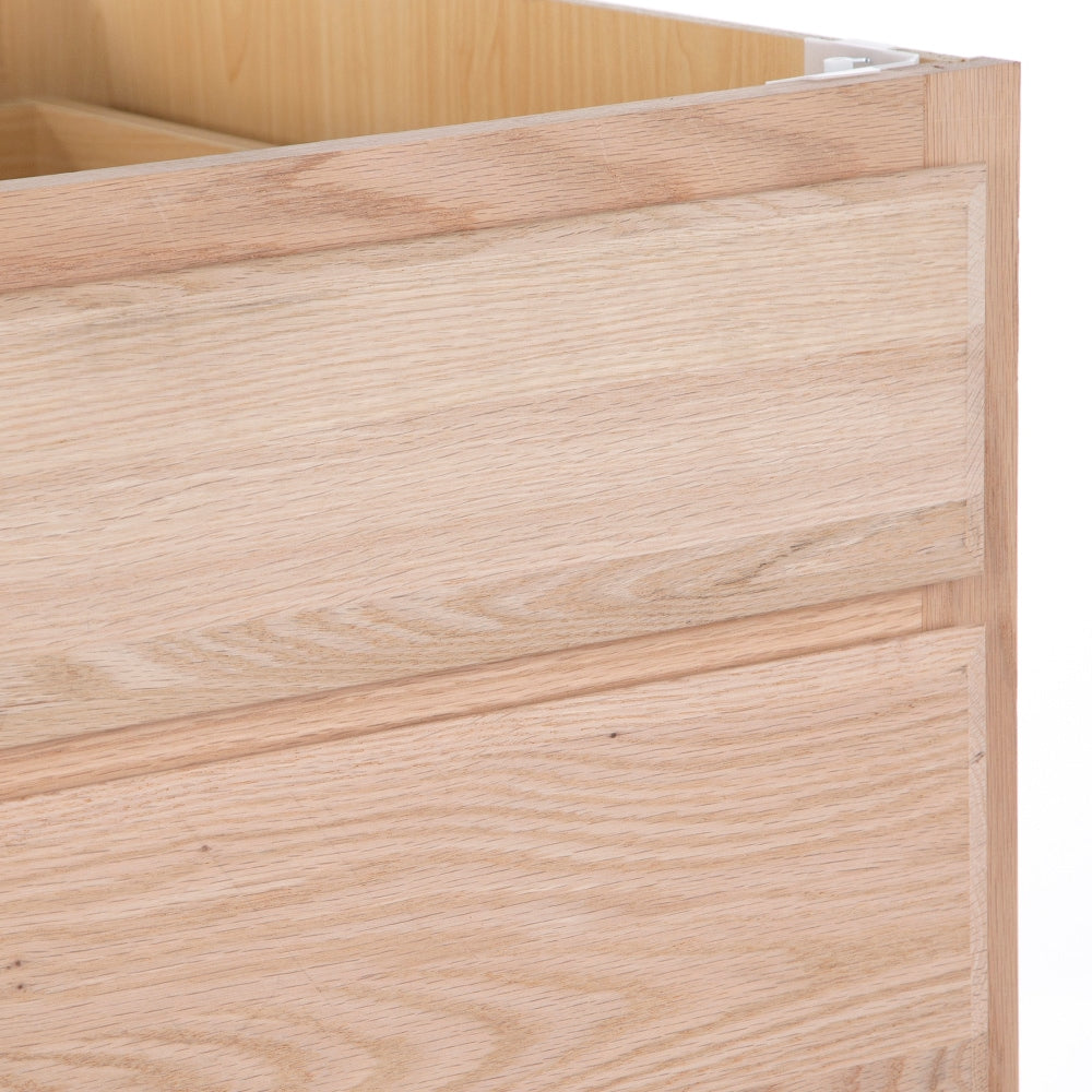 This drawer bank celebrates the honest beauty of unfinished oak, bringing a warm, organic texture to a vanity wall. The slab fronts and clean lines feel quietly modern, a perfect canvas for bold hardware or a hand-rubbed stain. Pair two beside a simple sink base for a tailored, bespoke look with generous storage. It’s the versatile building block for a polished, luxurious bath that feels uniquely yours.
