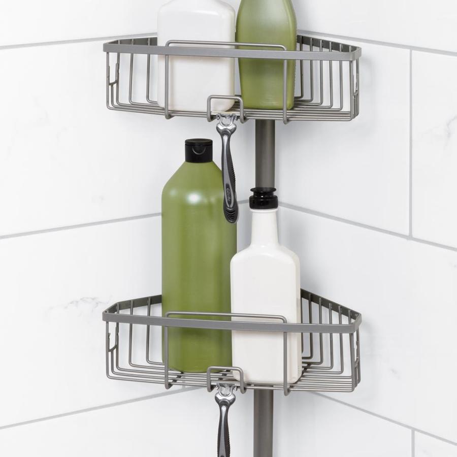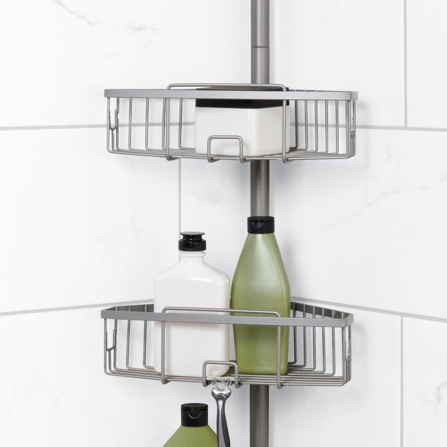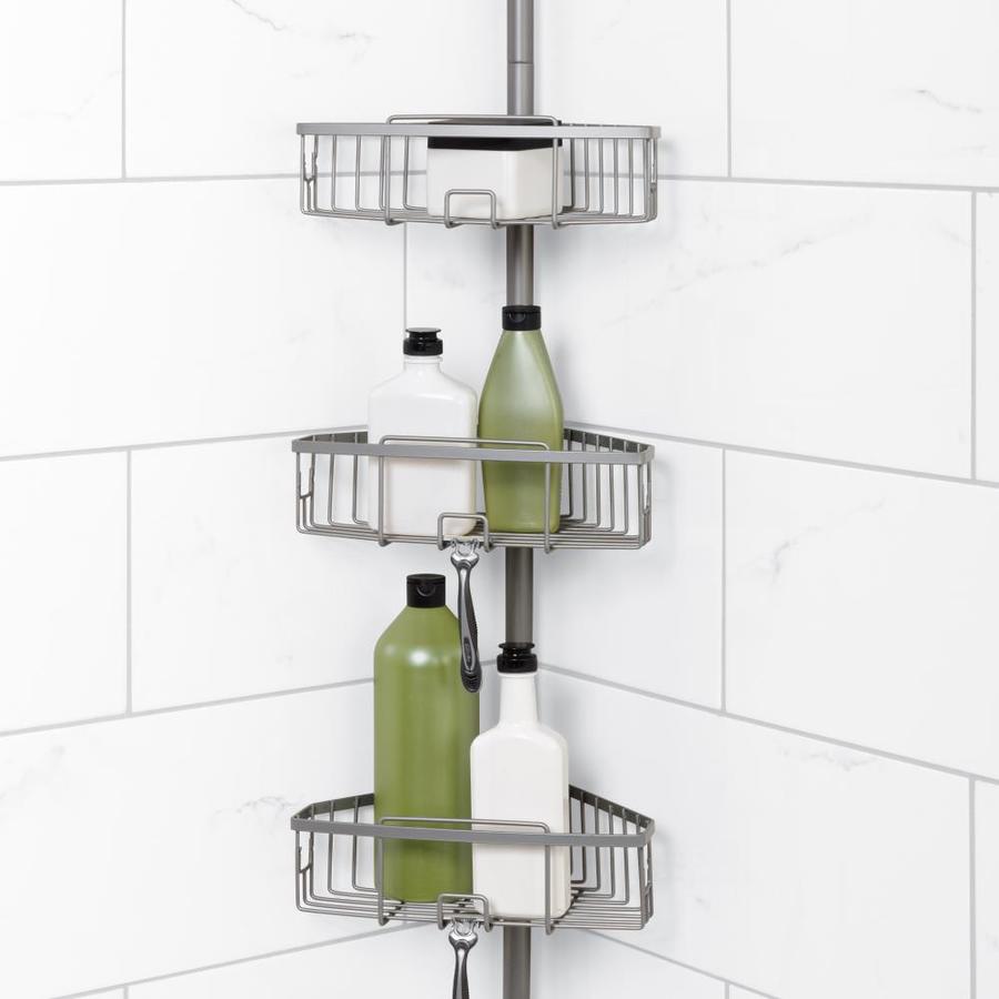 Tension pole design with non-marring end caps allows caddy to fit in most shower spaces with fast, easy installation 4 adjustable wire shelves provide room to store most commonly used shower and bath products Open wire design allows bathroom products to drain and dry quickly when shower is not in use Satin nickel finish is durable, attractive and rust resistant Fits up to 9 ft. tall ceilings