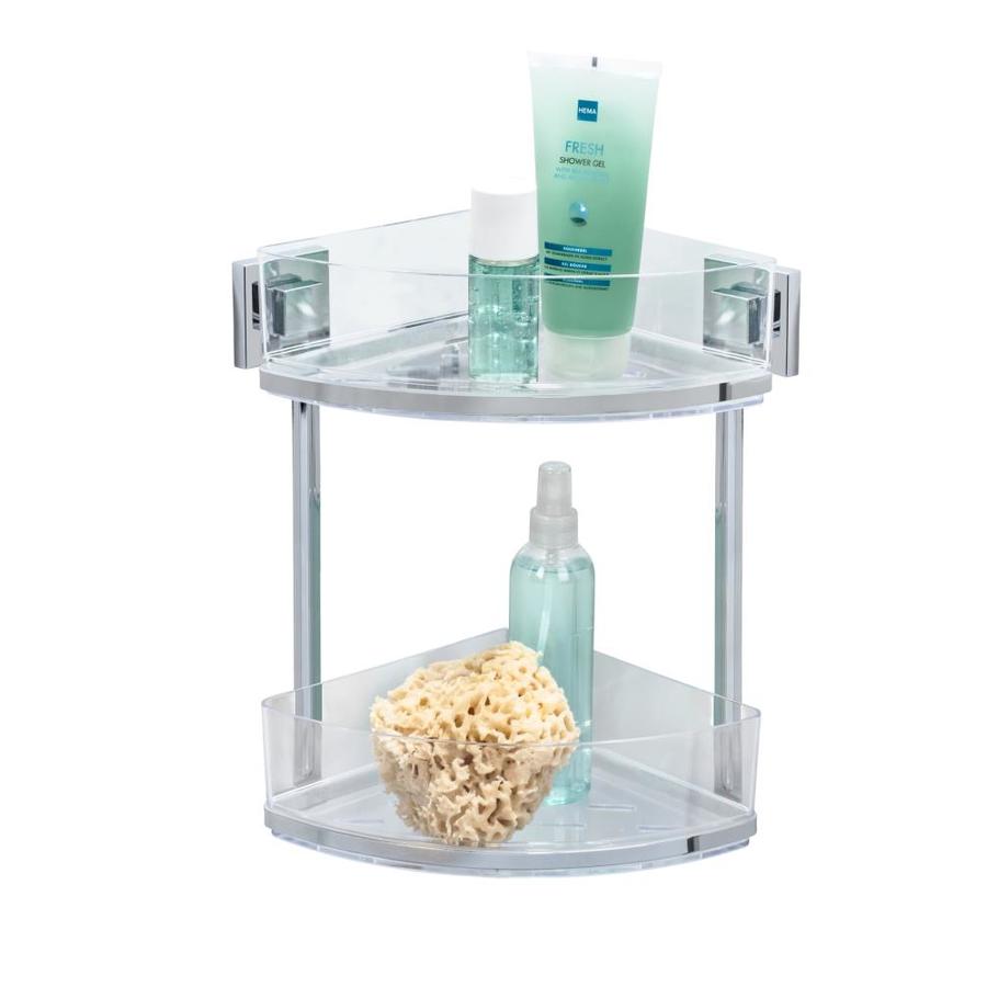 High-quality corner rack for the ideal utilization of storage space in the bathroom and guest toilet Handy storage on 2 tiers, made from shiny, rustproof stainless steel and with transparent, detachable plastic shelves Unique Vacuum-Loc® suction system for fast, easy and safe attachment Holds on all air-impermeable surfaces, even on slightly uneven substrates Extremely strong hold without drilling; the vacuum is created in the Loc by extracting the air using the enclosed pump
