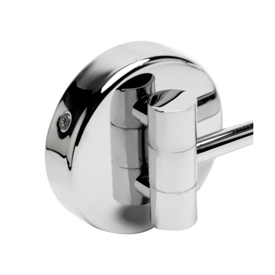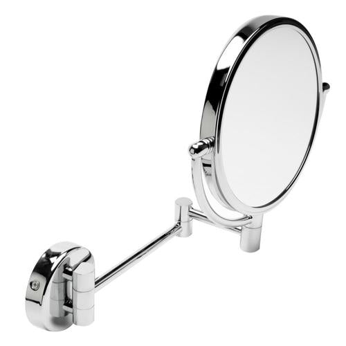 One side is a regular mirror, the other side magnifies up to 5x Mirror is framed and swivels Wall Mount Installation Concealed mounting screws offer a clean cut design Features a double jointed arm allowing you to extend it out further from the wall and fold up against the wall when not in use Double jointed arm allows for long extension as well as folding up against the wall when not in use